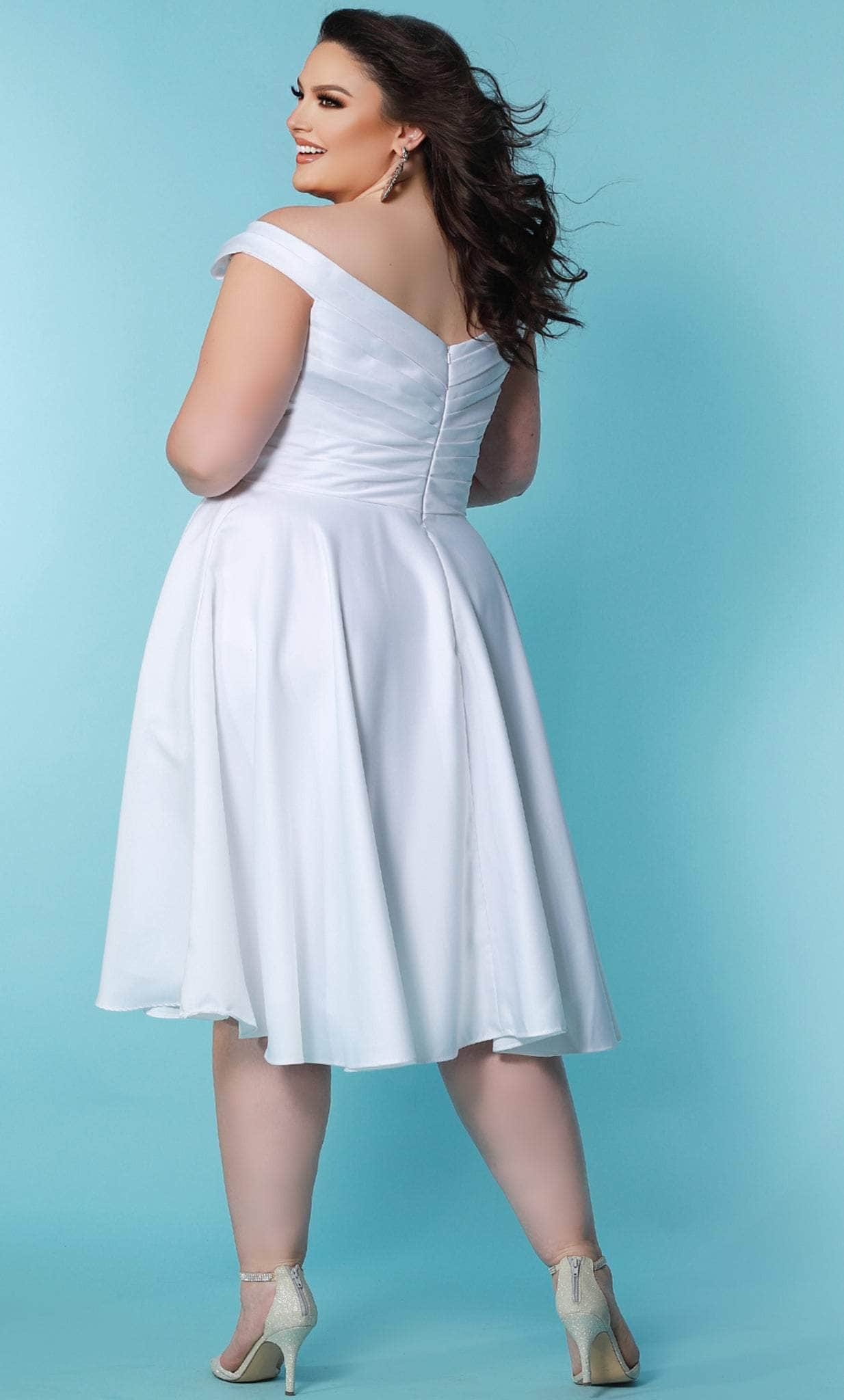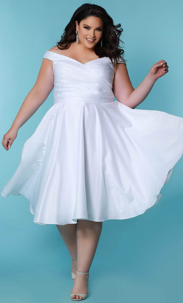 Be the embodiment of pure feminine flair in this mesmerizingly ornate Sydney's Closet SC5302. With its sassy and flared A-line silhouette and tea length hem, this dress is ideal for wedding gowns or graduation ceremonies. Has an off-shoulder, wide neckline to draw attention to your collar area, and the entire outfit is made of satin fabric, which offers each wearer the perfect amount of glow. This Sydney's Closet SC5302 dress is a stunning fusion of style and comfort that will take you from your desk to party. Model is wearing White color.