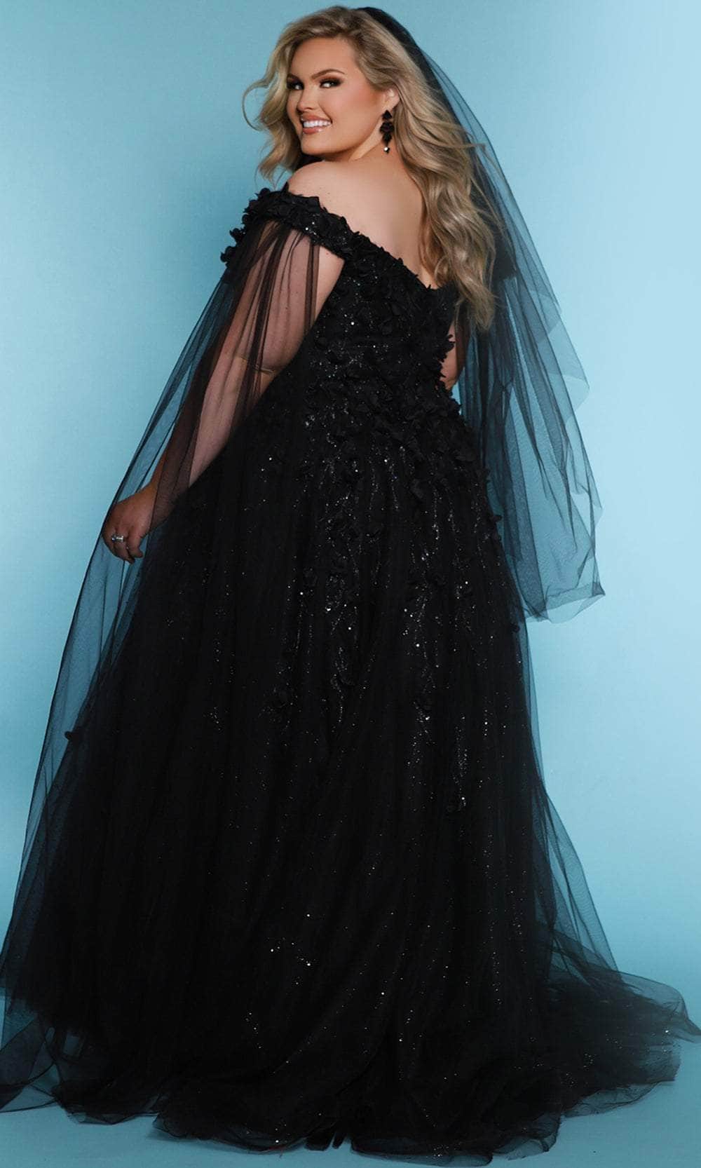 Indulge in a magical dream at your special event with Sydney's Closet SC5315, the Alias black plus-size 3D floral ballgown. Whimsical off-the-shoulder straps adorned with trendy 3D chiffon petals create a breathtaking effect on the sparkling sequin floral pattern that embellishes the fitted bodice, cascading below the natural waistline. The full ball gown skirt, featuring layers of glitter tulle, adds a fairy-tale touch. Opt for added drama by choosing tulle scarves on each shoulder, providing a modern twist to the traditional wedding gown train. Crafted for curvy romantic brides, Sydney's Closet SC5315 ensures an enchanting presence on your special day. Model is wearing Black color.