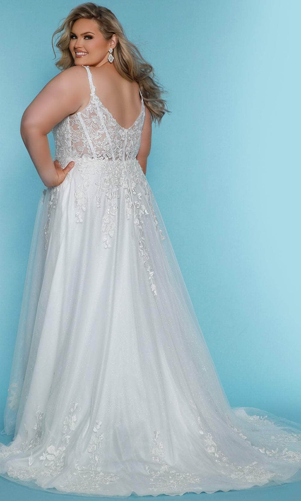 Experience elegance in Sydney's Closet SC5322, an exquisite plus-size wedding dress designed for modern brides seeking timeless beauty. The A-line silhouette showcases delicate rose and floral lace, adorning bra-friendly straps, a sleeveless fitted bodice, an A-line skirt, and a hemline with a graceful train. The result is a romantic look from head to toe. A sparkling tulle underlayer adds the perfect twinkle. For a contemporary touch, leave the lace back unlined, or opt for the optional lining included for a more classic aisle look. Playful and practical pockets make accessorizing a breeze. Sydney's Closet SC5322 grabs attention. Model is wearing Ivory color.
