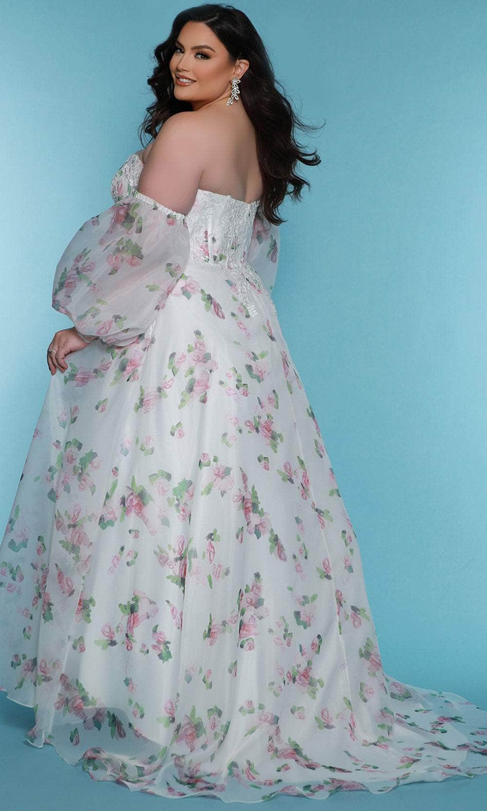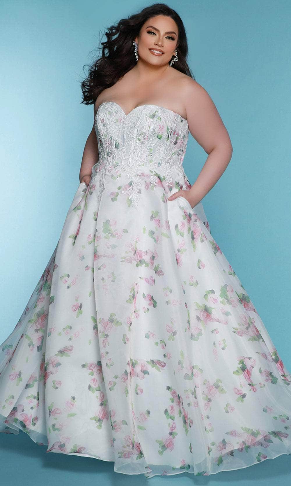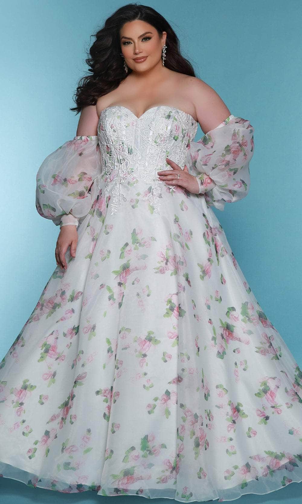 Sydney's Closet SC5323 presents a distinctive plus-size floral dress, ideal for the modern bride desiring a non-traditional look on her special day. This ultra-feminine A-line gown is meticulously crafted from soft, sweet organza fabric, featuring delicate blooms in subtle shades of pink against an ivory backdrop. The corset bodice, adorned with lace appliques and exposed boning, adds an additional layer of romance to the fitted strapless sweetheart neckline. The A-line skirt, with a sweeping train, introduces an eye-catching design detail, while the charming and practical pockets contribute to the gown's appeal. Opt for a whimsical look with the 3/4-length puff sleeves during the ceremony and photos, then transition to a sleeveless celebration at the party with family and friends. Sydney's Closet SC5323 guarantees a distinctive and unforgettable bridal ensemble for your big day. Model is wearing Ivory Floral color.