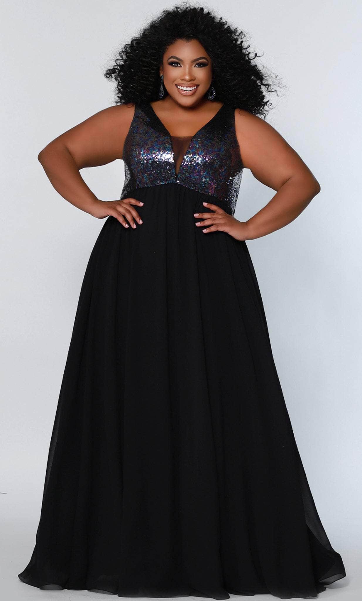 Enter the ballroom wearing this Sydney's Closet CE2205 evening gown and dazzle the wealthy crowd. This sleeveless beauty has a deep V-neckline with a sheer insert and is embellished with multi-colored sequin embellishment. The V-shaped open back is secured with a center zipper closure and the figure-flattering empire waist hugs your bodice and then flows freely into an A-line silhouette touching the floor. Walk in the glitz and have all eyes on you in this Sydney's Closet CE2205 creation. Models are wearing Multi Black colors.