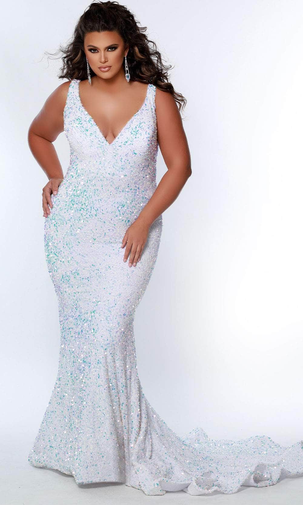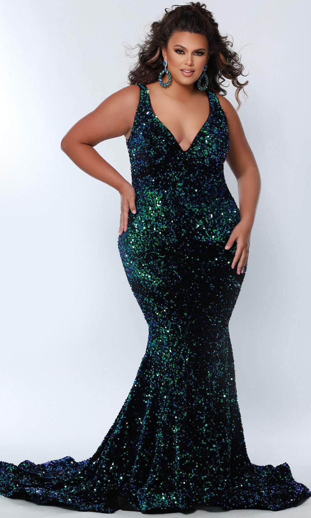 Make a stunning entrance in this Sydney's Closet JK2308 masterpiece. Crafted from luxurious velvet, this sleeveless dress is meticulously festooned with sequins that bring an iridescent glow to your overall look. The deep v-neckline and midrise v-shaped back add a touch of seduction, accompanied by wide shoulder straps for support. Effortlessly gliding across the floor and dramatic sweeping train, the skirt is fitted at the hips and flares out in a striking mermaid silhouette. This Sydney's Closet JK2308 dress will make you feel like a true queen of the night. Models are wearing Kaleidoscope, Peacock, Supernova, and Unicorn colors.