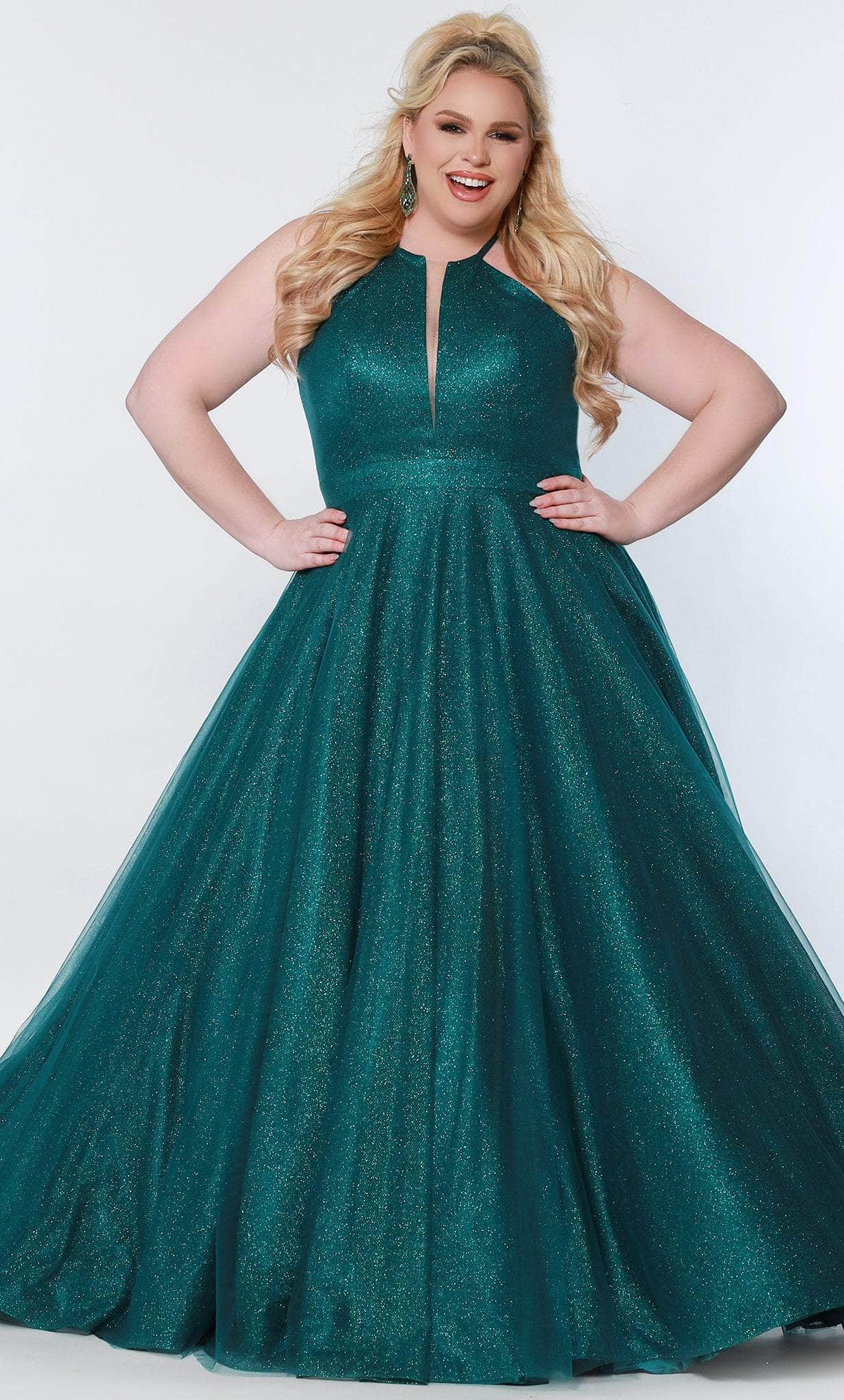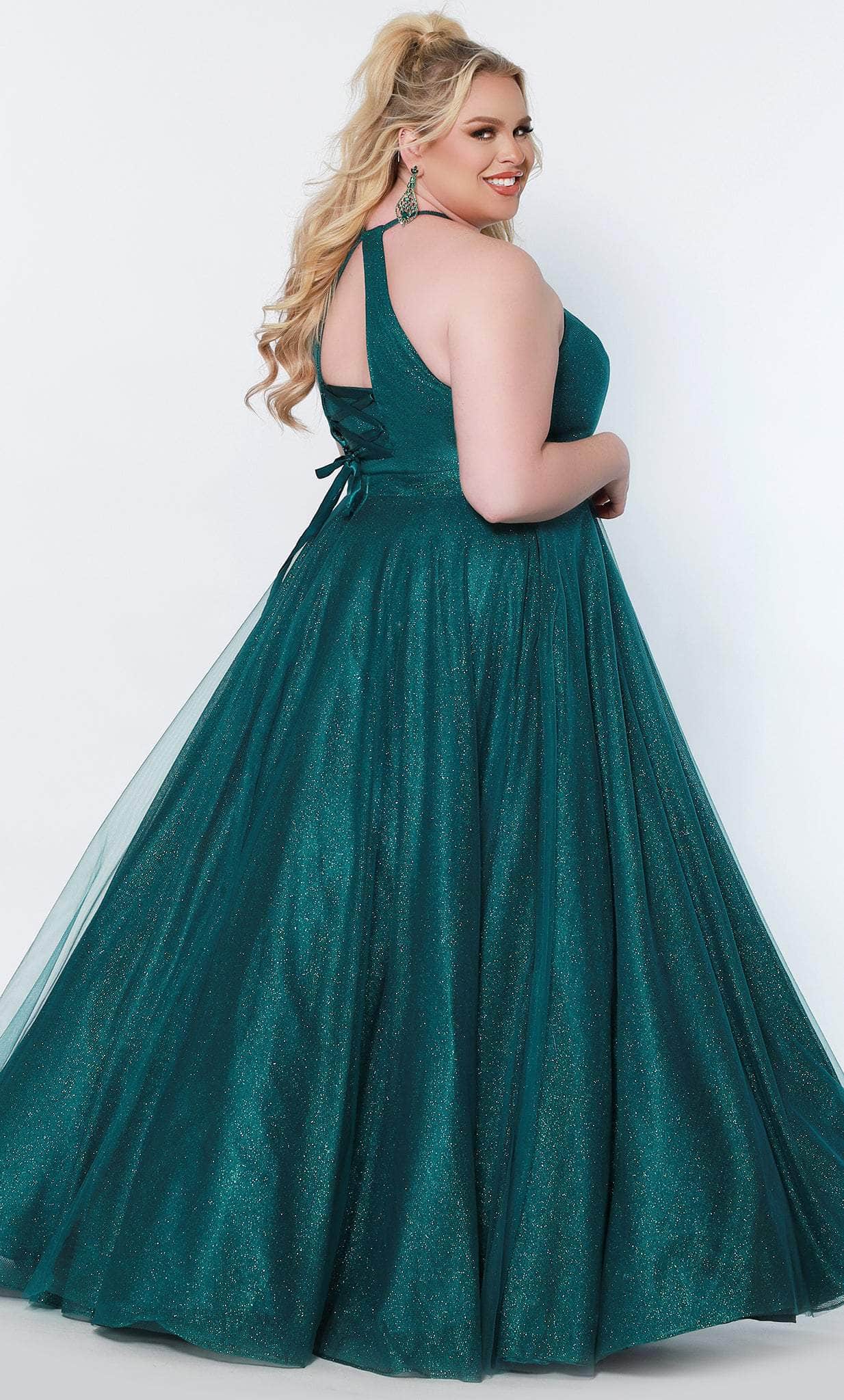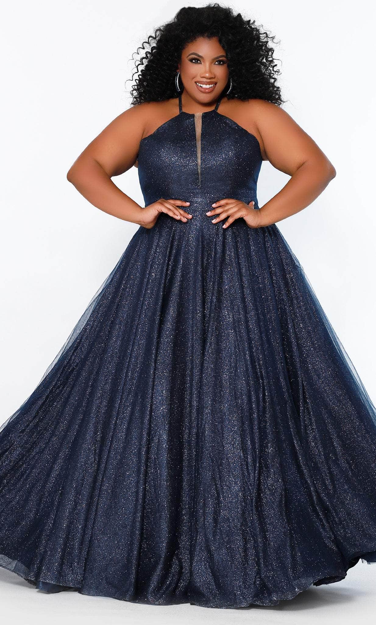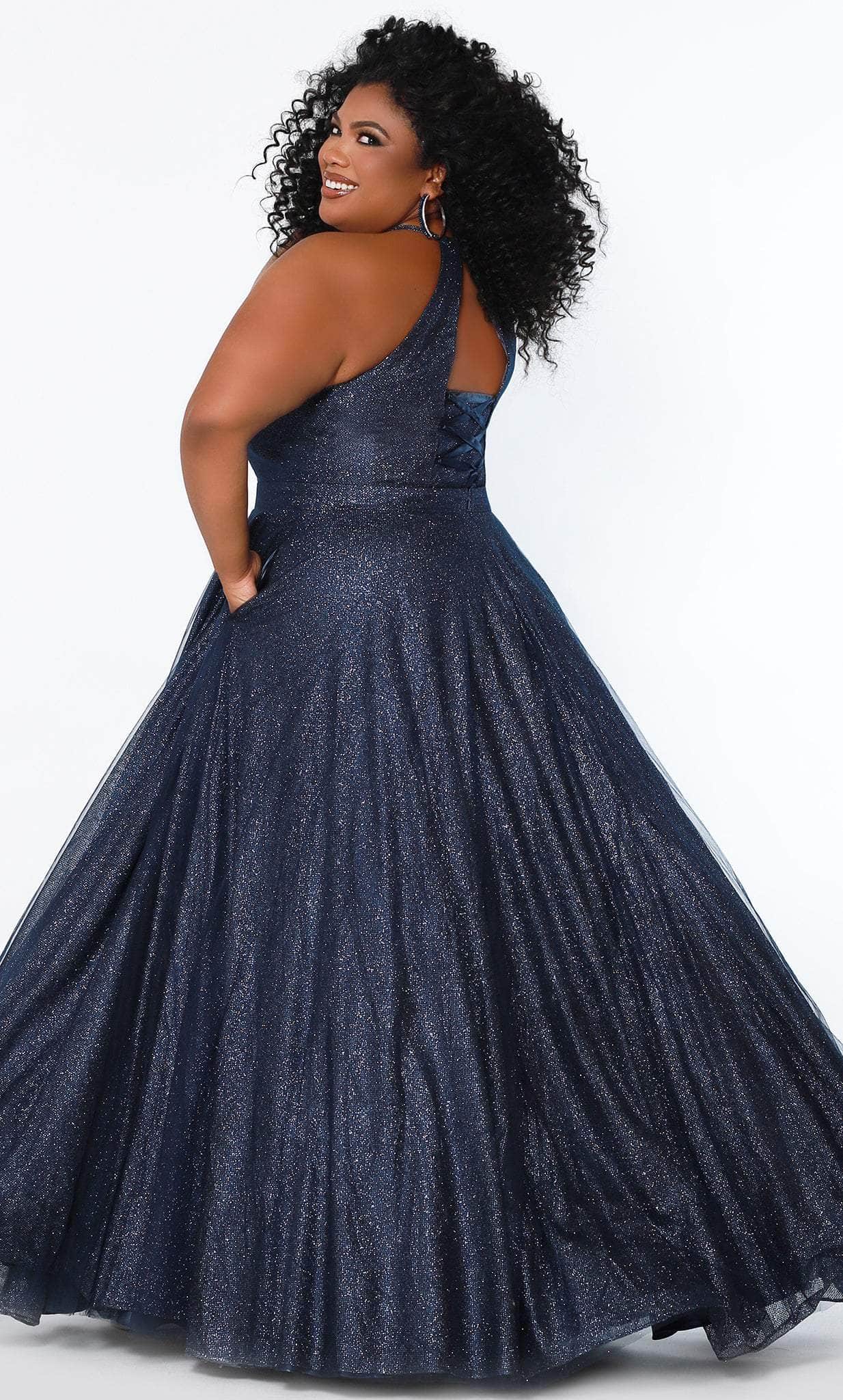This gorgeously decadent ensemble by Sydney's Closet SC7323 exudes a charm meant to captivate the elite crowd. This dazzling gown has a halter neckline with a deep V-nude mesh insert. The sleeveless bodice is held in place with halter straps that lead to a stunning back with a lace-up tie and a modesty panel. A waistband cinched the natural waistline that flow into an A-line skirt. Side pockets to keep your phone as you enjoy the party complete the look. Nobody will be able to miss your grand entrance in this Sydney's Closet SC7323 creation. Models are wearing Admiral, Evergreen, and Firecracker colors.