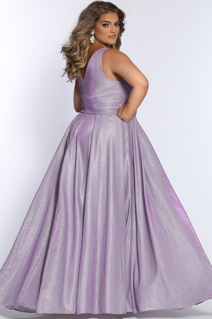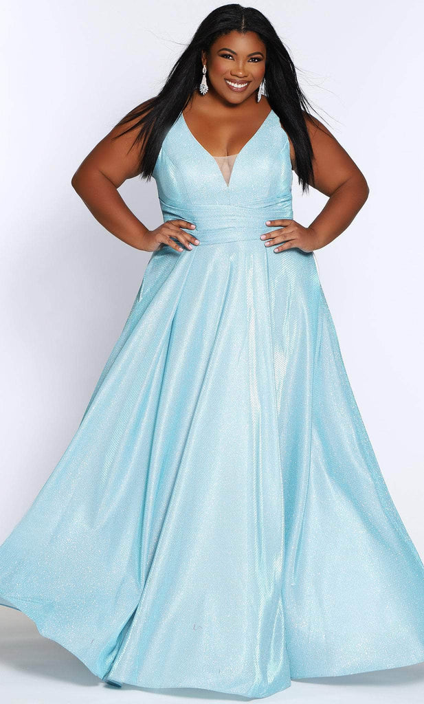 Look fantastic for your next formal event in this creation by Sydney's Closet SC7324. Beautifully sculpted in a shimmer metallic knit fabric, this gown flaunts a  sleeveless and low V neckline with a sheer inset. This also showcases a pleated wide waistband and low V-back with zipper closure. The voluminous A-line skirt has pleated detail and it gracefully flares to the floor. This Sydney's Closet masterpiece is awesome for prom or for any special night event! Each Sydney’s Closet design is unique and trendy which is specifically tailored to fit the curves gracefully. Hence, from Sydney’s Closet cocktail dresses, to Sydney’s Closet plus size prom dresses, size of apparel will be perfect to a real curvy body. Models are wearing the Capri, Sage and Orchid colors.