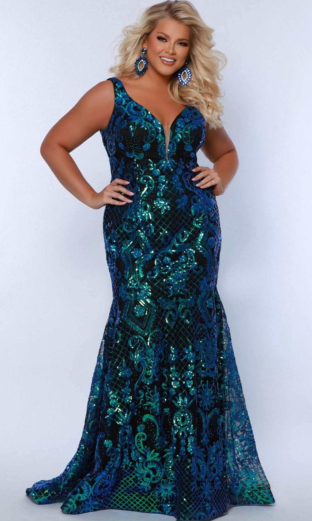 Transform your big night into a million-dollar moment with Sydney's Closet SC7368, a glamorous fitted evening gown that exudes elegance. The laser-cut iridescent sequins ensure you sparkle all night at Prom 2024 or any upscale formal event. Embrace the flattering V-neck with a sheer insert, allowing you the luxury of wearing a bra for a secure fit without the fuss of a strapless option. The curve-hugging style gracefully transitions into a trendy Mermaid skirt with a maxi train and a horsehair hem, while the V-shaped back is secured with a back zipper closure. Arrive in timeless style with Sydney's Closet SC7368. Models are wearing Peacock and Phoenix colors.
