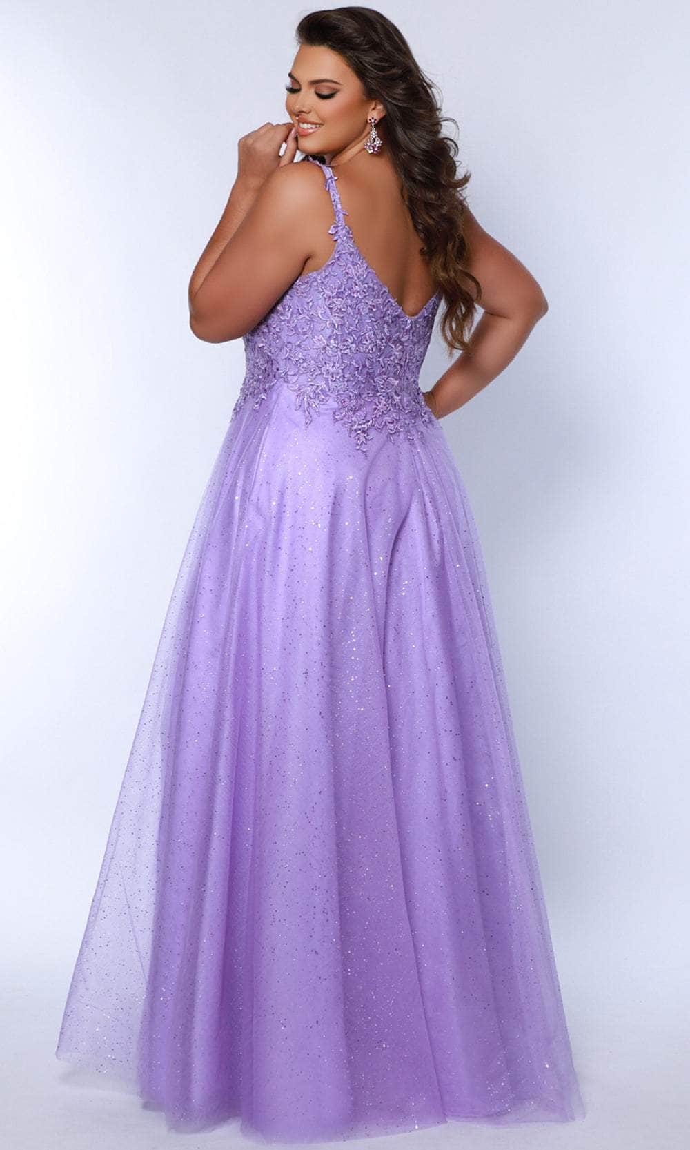 Beam with pride when you show up in this Sydney's Closet SC7384 creation. This sleeveless dress is meticulously ornamented with lace applique on the upper bodice, enhanced by subtle glitters that add a touch of glamour. The deep v-neckline perfectly matches the midrise v-shaped back. Laced thin straps provide support, while the convenient pockets keep your essentials. The A-line skirt flows to the full length hem and ends with a side high slit for seductive touch. Be the lady of the night in this Sydney's Closet SC7384 dress. Models are wearing Lavender, Sky, and Tangerine colors.