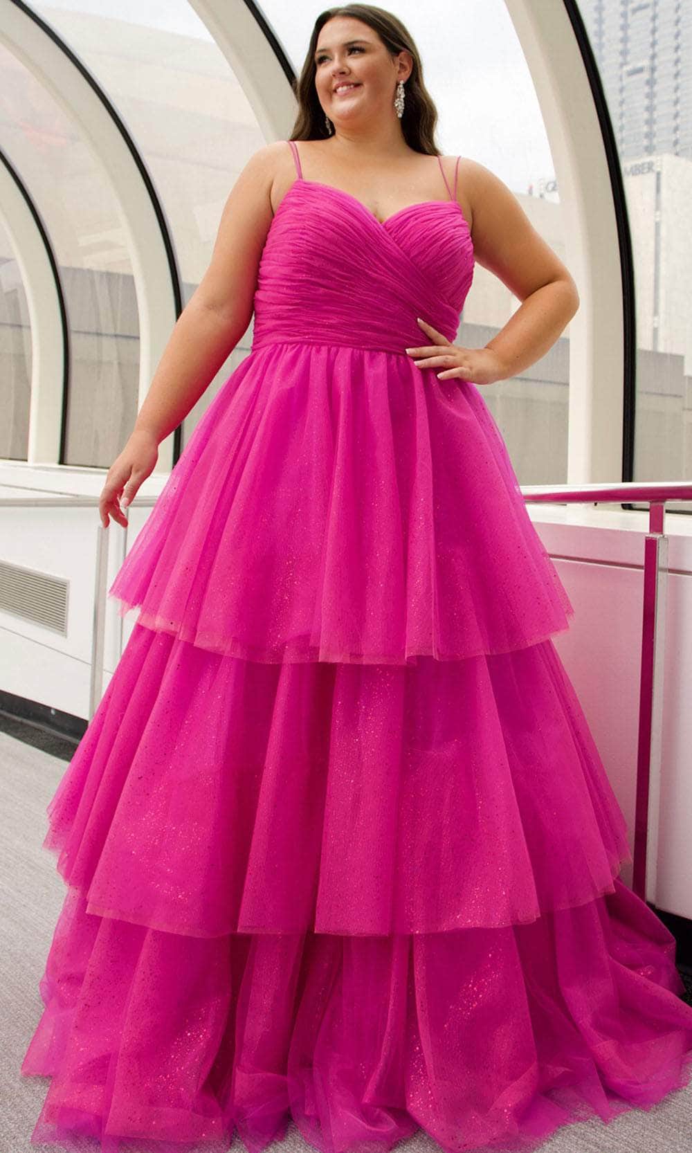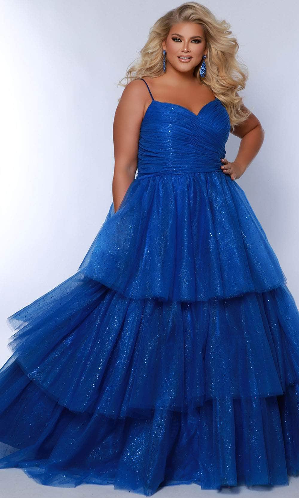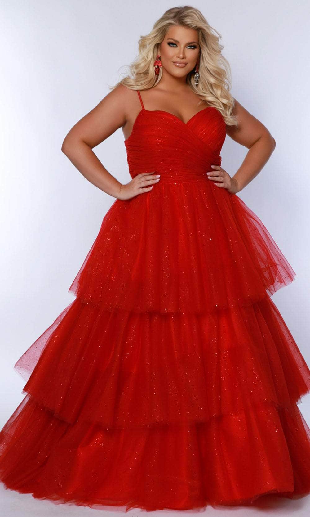 Feel like a true princess on your special night in this Sydney's Closet SC7392 creation. This sleeveless design features a sweetheart neckline, and dual spaghetti straps that beautifully highlight your shoulders. The ruched top adds depth and texture, while the glitter detailing on the bodice is sure to turn heads. With a magnificent ballgown silhouette, the skirt has striking tiered details and flows gracefully to the full length hemline. Heighten your charming appeal in Sydney's Closet SC7392 dress. Models are wearing Black, Pink, Red, and Royal colors.