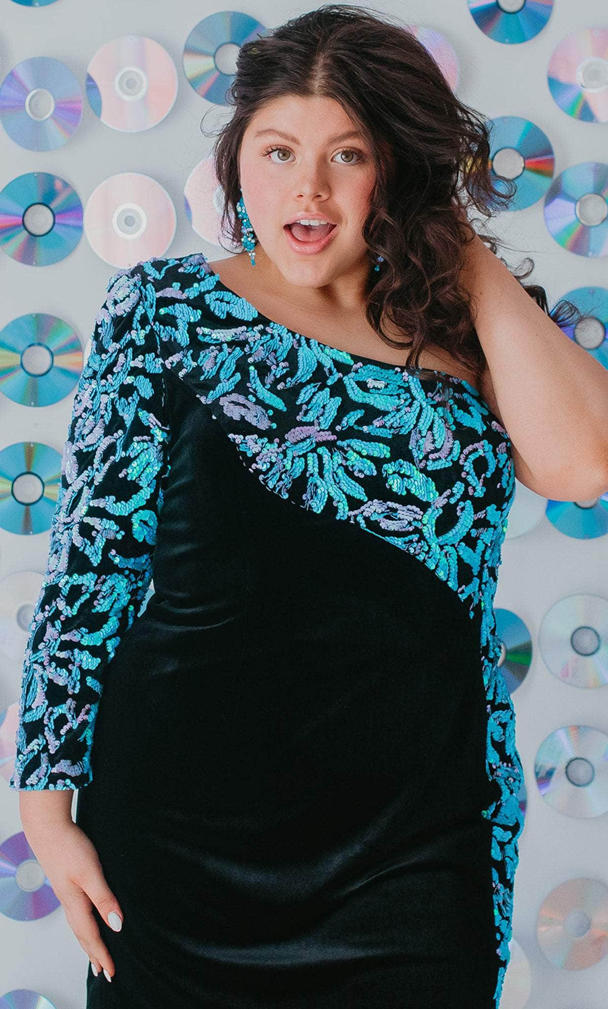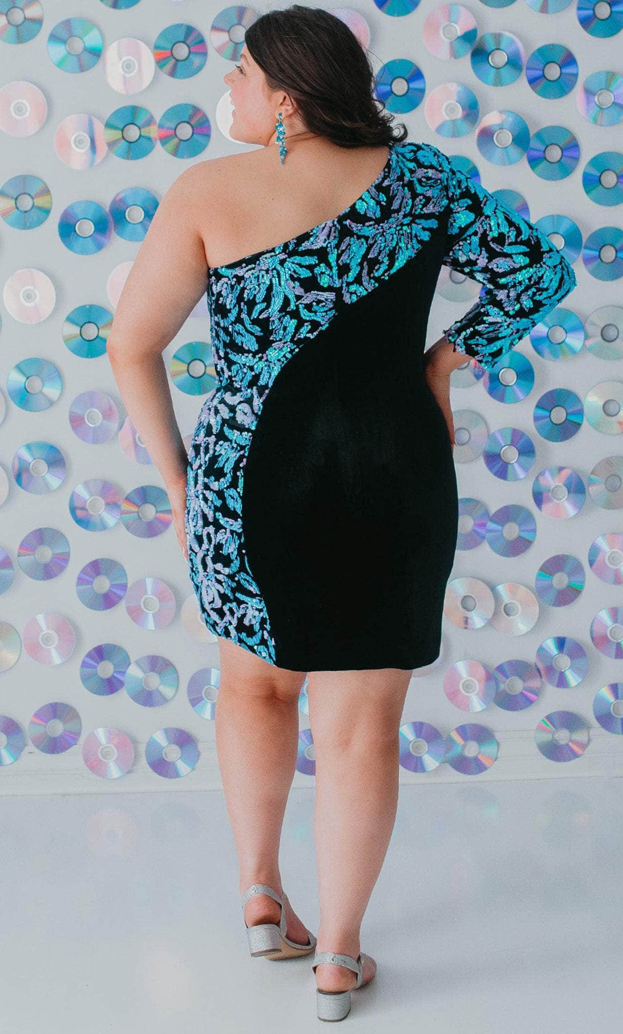 Flaunt your figure in this fantastic cocktail dress by Sydney's Closet SC8114. The focal point of this dress is how velvet fabric is combined with sequin applique. It's ideal for cocktail parties and looks sensual but not provocative. A body-hugging sheath silhouette with one long sleeve, an asymmetrical neckline, and a short length. You will be all set for a perfect and fantastic evening in this bedazzled evening gown by Sydney's Closet SC8114. Model is wearing Black/Multi color.