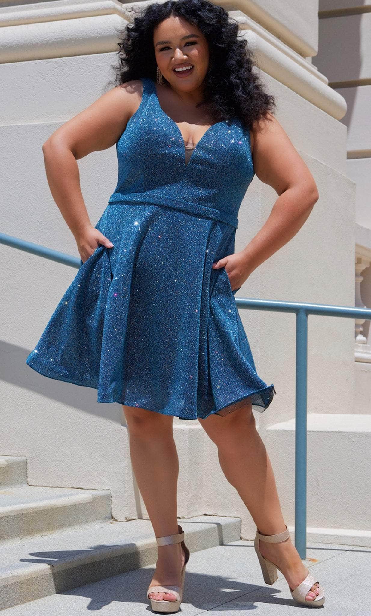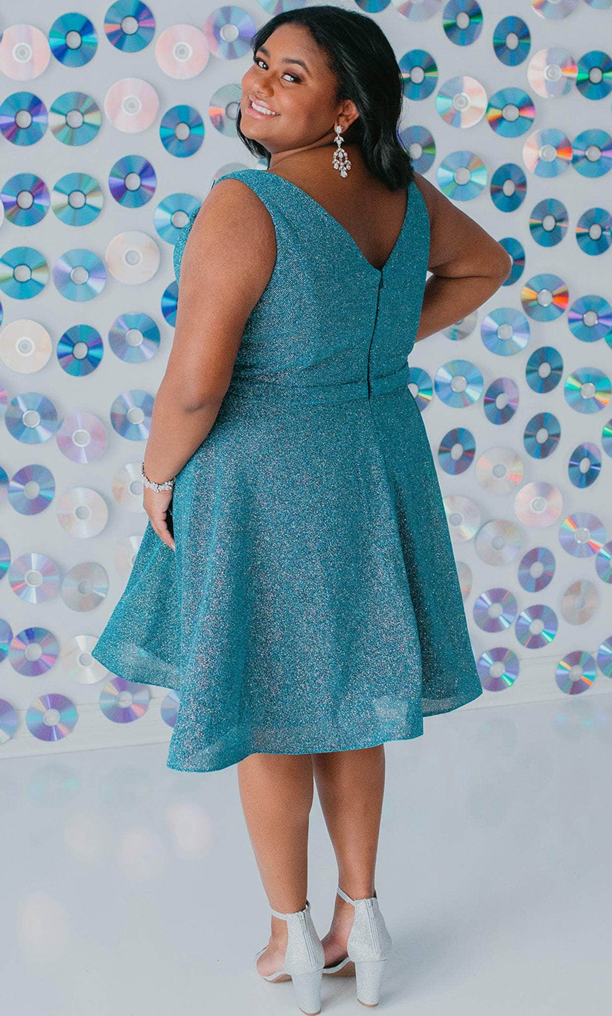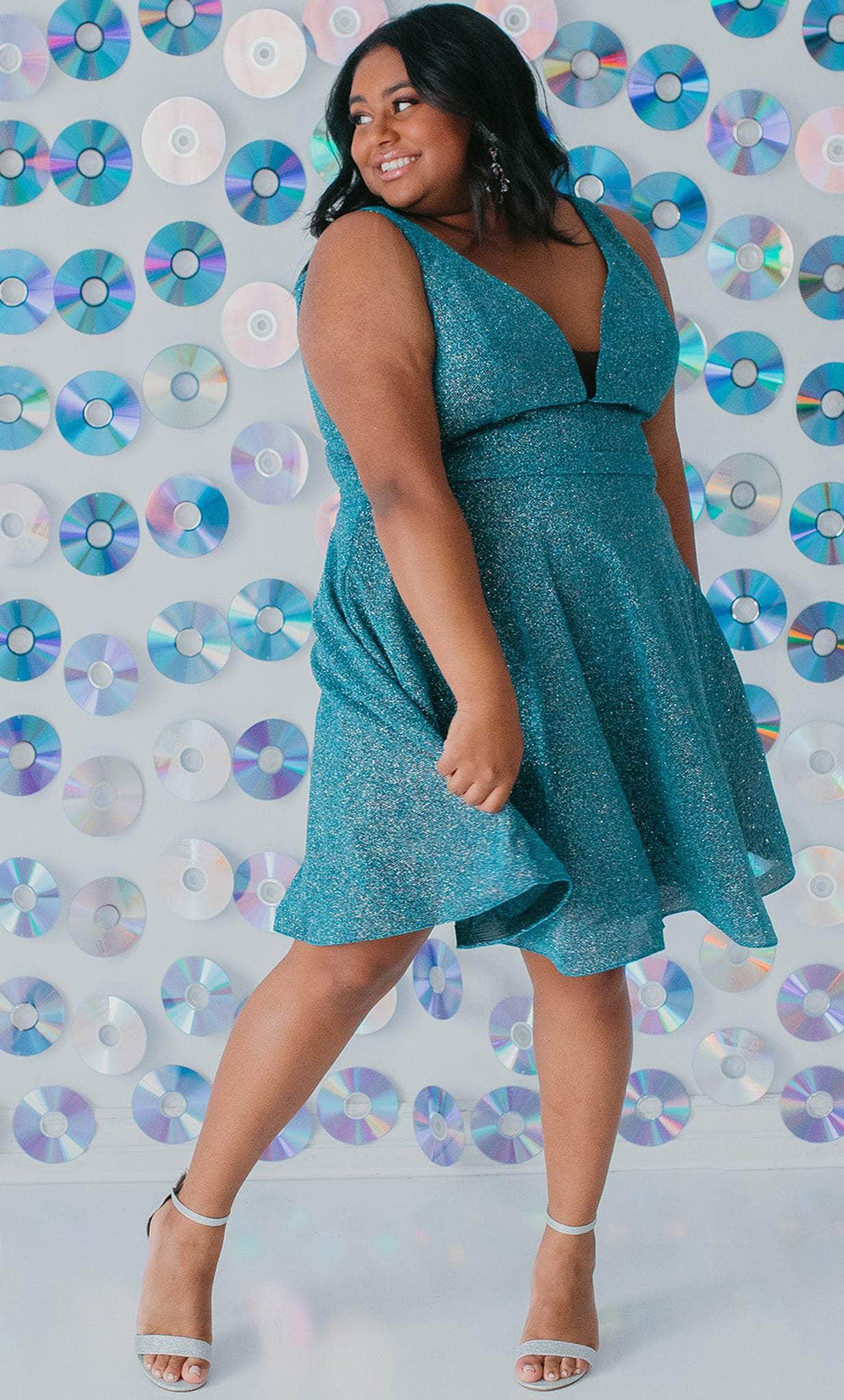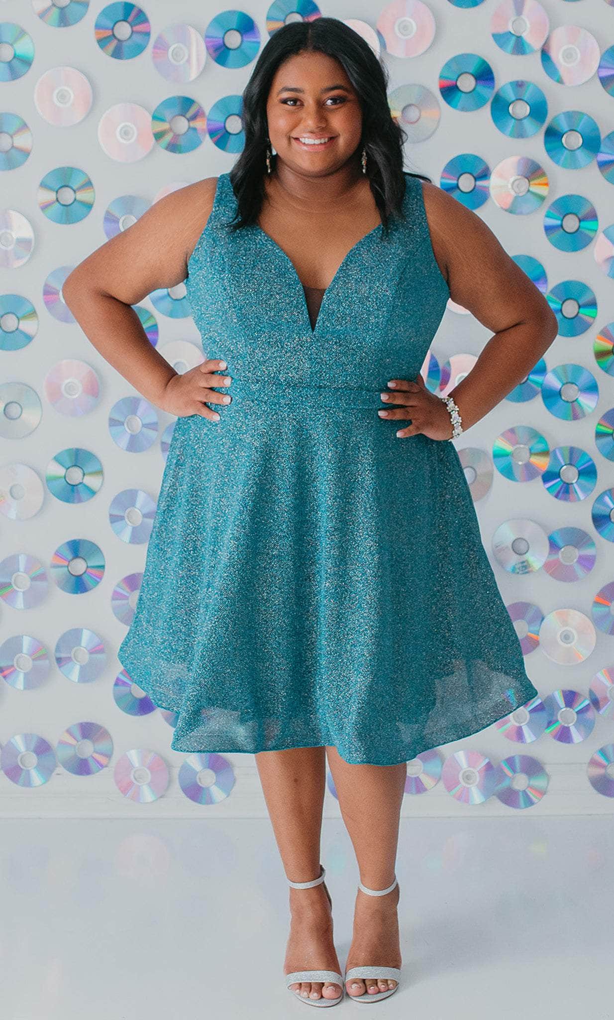 Strut your stuff in this head-turning Sydney's Closet SC8120 creation. The sleeveless dress made of shimmer knit fabric flatters from every angle. It presents a classic plunging v-neckline, sheer inset detailing at the bust, wide shoulder straps and a v-shaped back. A thin waistband accents the A-line skirt and reaches a short length hem. This Sydney's Closet SC8120 dress is sure to make you the darling of the party! Models are wearing the Garnet, Jade and Turq colors.