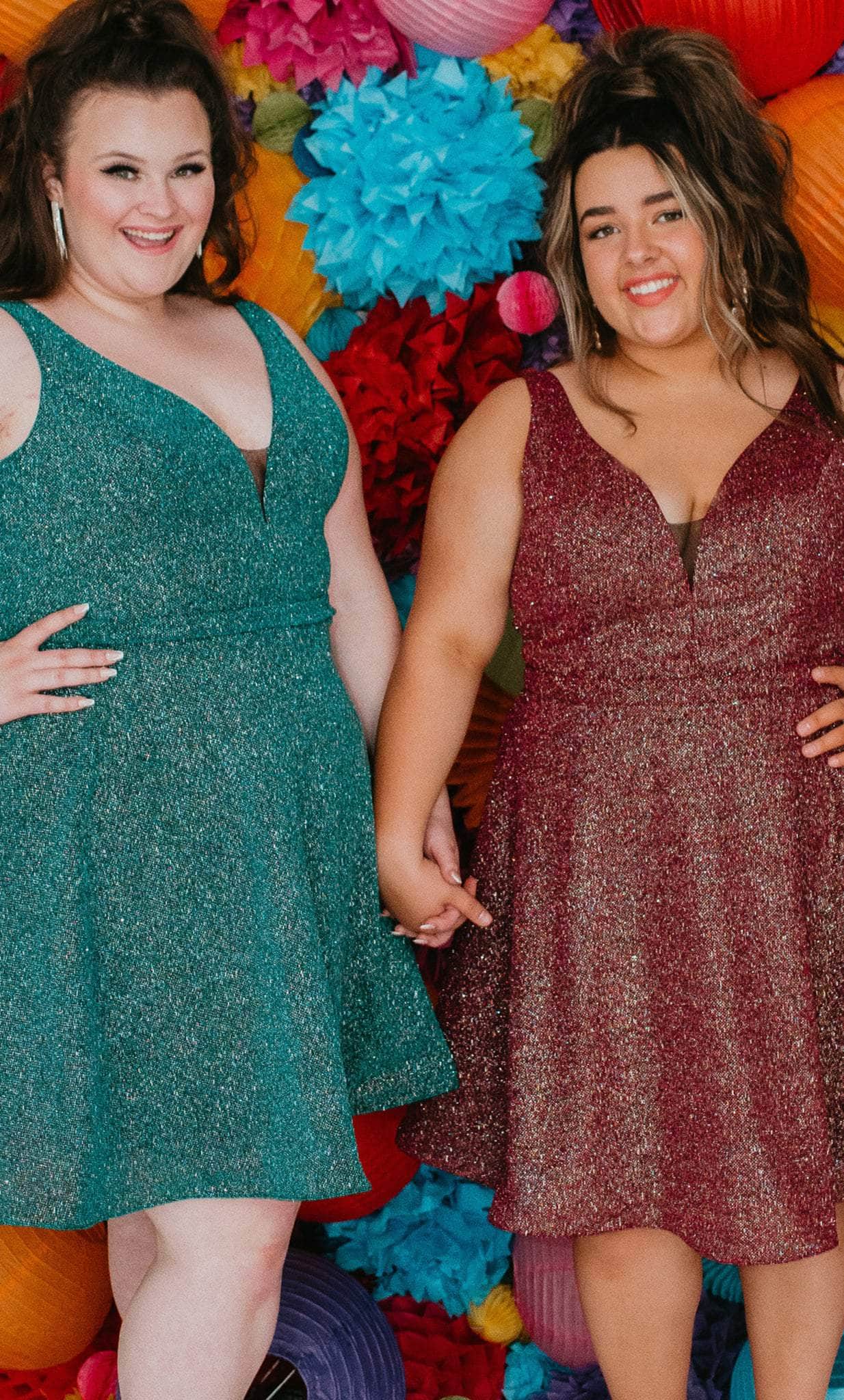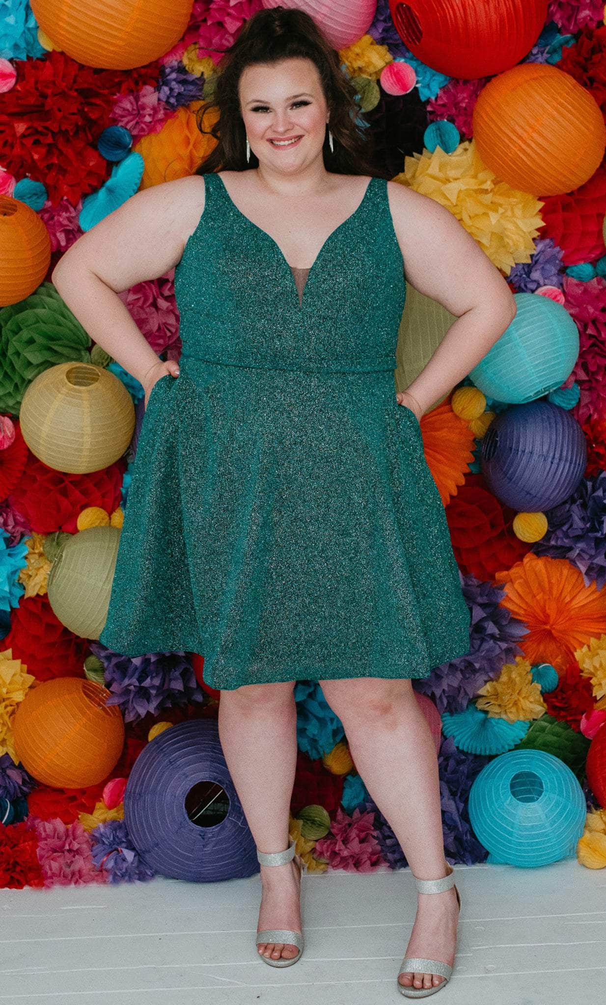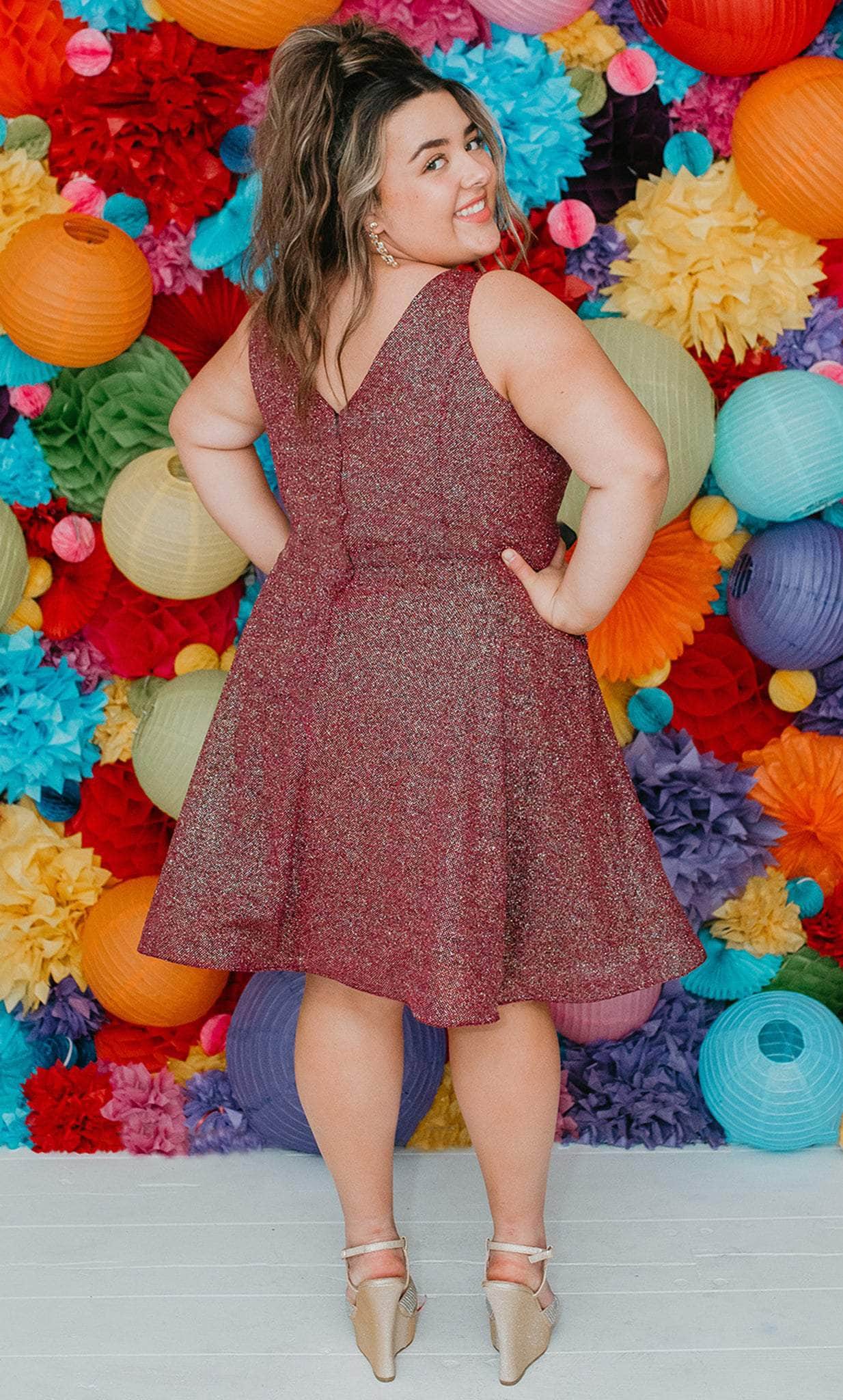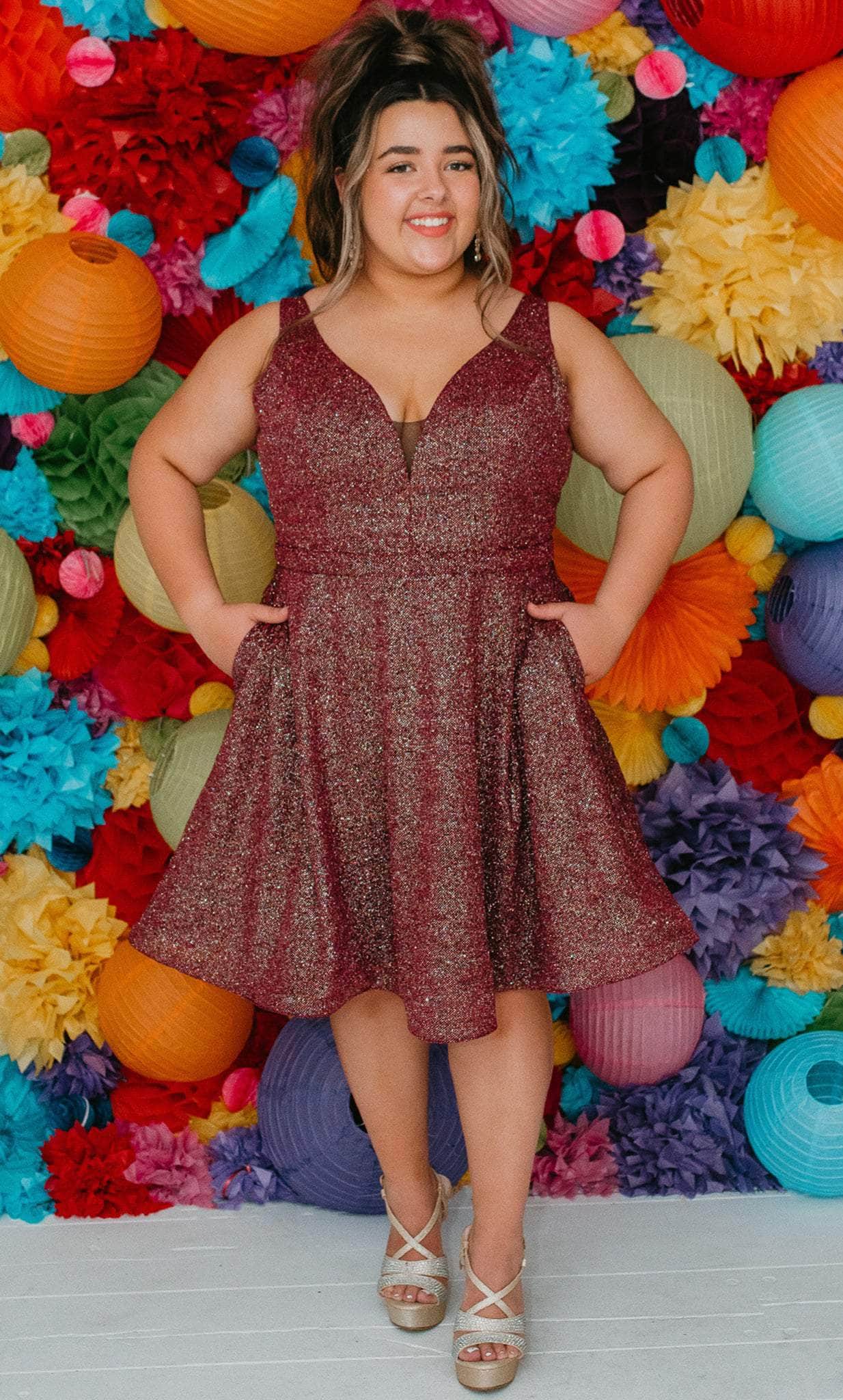 Strut your stuff in this head-turning Sydney's Closet SC8120 creation. The sleeveless dress made of shimmer knit fabric flatters from every angle. It presents a classic plunging v-neckline, sheer inset detailing at the bust, wide shoulder straps and a v-shaped back. A thin waistband accents the A-line skirt and reaches a short length hem. This Sydney's Closet SC8120 dress is sure to make you the darling of the party! Models are wearing the Garnet, Jade and Turq colors.