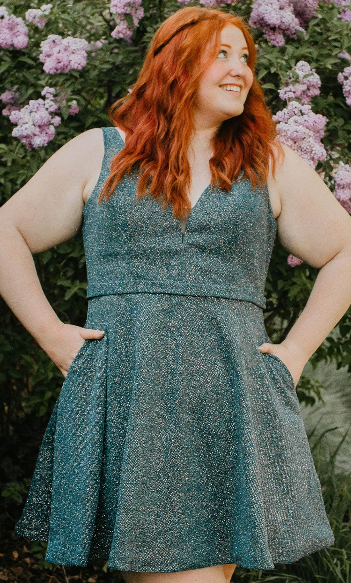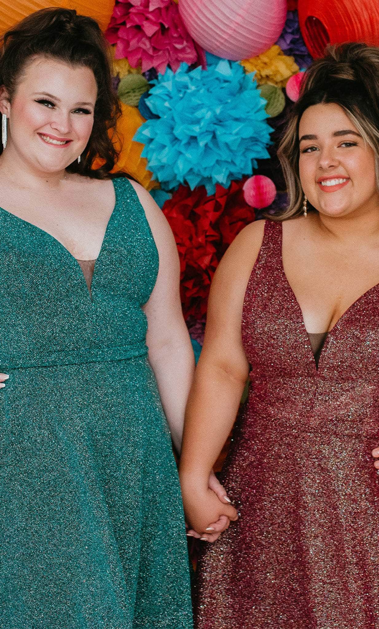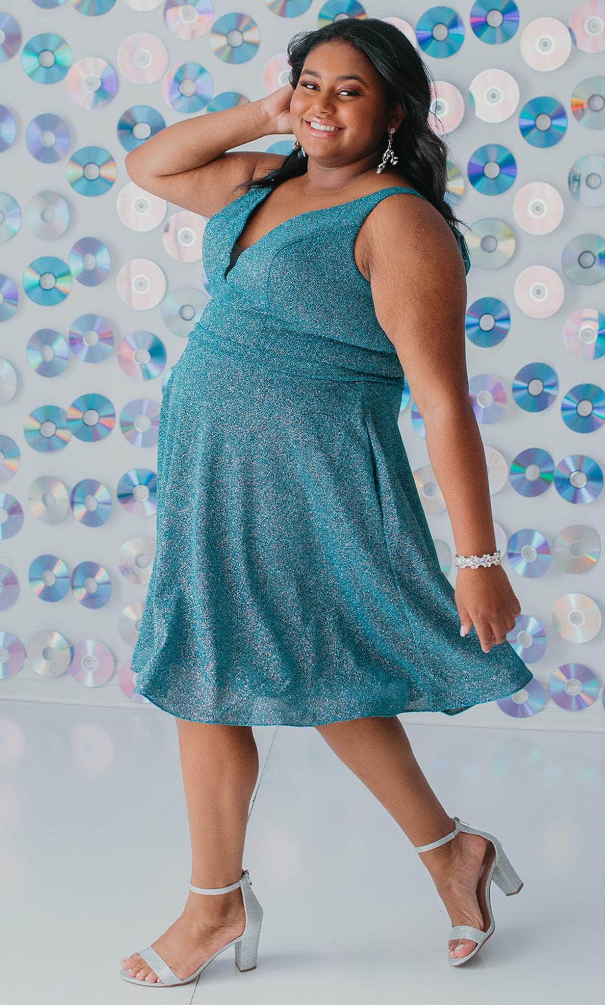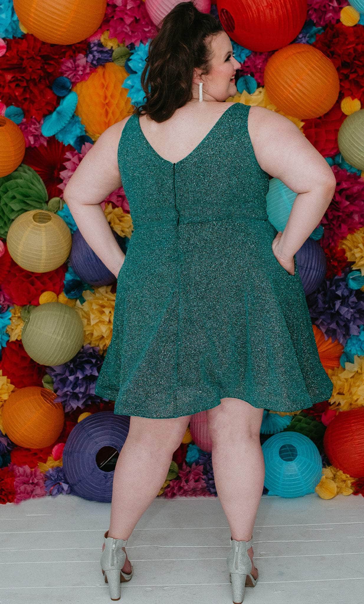 Strut your stuff in this head-turning Sydney's Closet SC8120 creation. The sleeveless dress made of shimmer knit fabric flatters from every angle. It presents a classic plunging v-neckline, sheer inset detailing at the bust, wide shoulder straps and a v-shaped back. A thin waistband accents the A-line skirt and reaches a short length hem. This Sydney's Closet SC8120 dress is sure to make you the darling of the party! Models are wearing the Garnet, Jade and Turq colors.