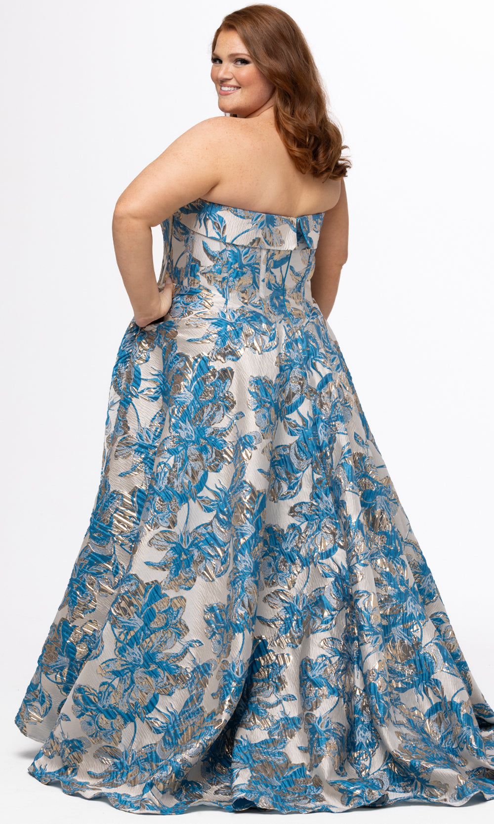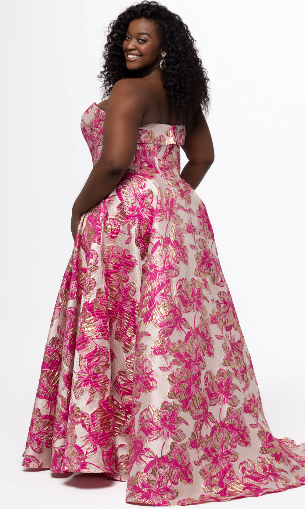 Sydney’s Closet TE2621 is a vision of elegance, designed in luxurious brocade fabric with romantic floral detailing. The chic strapless sweetheart neckline highlights the figure, while the pleated bodice flows seamlessly from a flattering Basque waistline into a graceful A?line silhouette. Functional pockets add a modern touch, while the daring leg slit and sweeping train create dramatic movement. Perfect for prom nights, pageants, or gala events, Sydney’s Closet TE2621 ensures a radiant and unforgettable entrance. Models are pictured wearing Ocean Blue and Fuchsia colors.