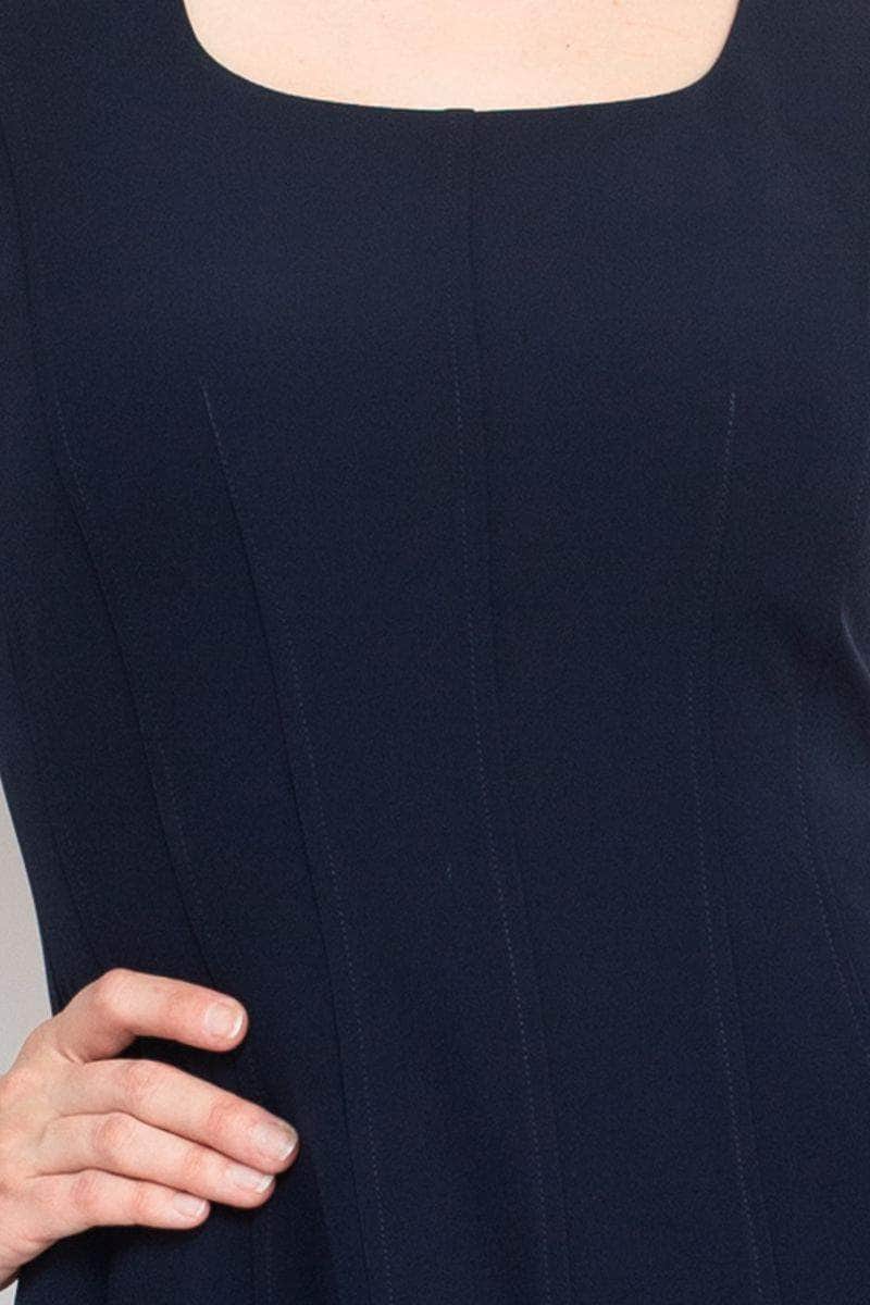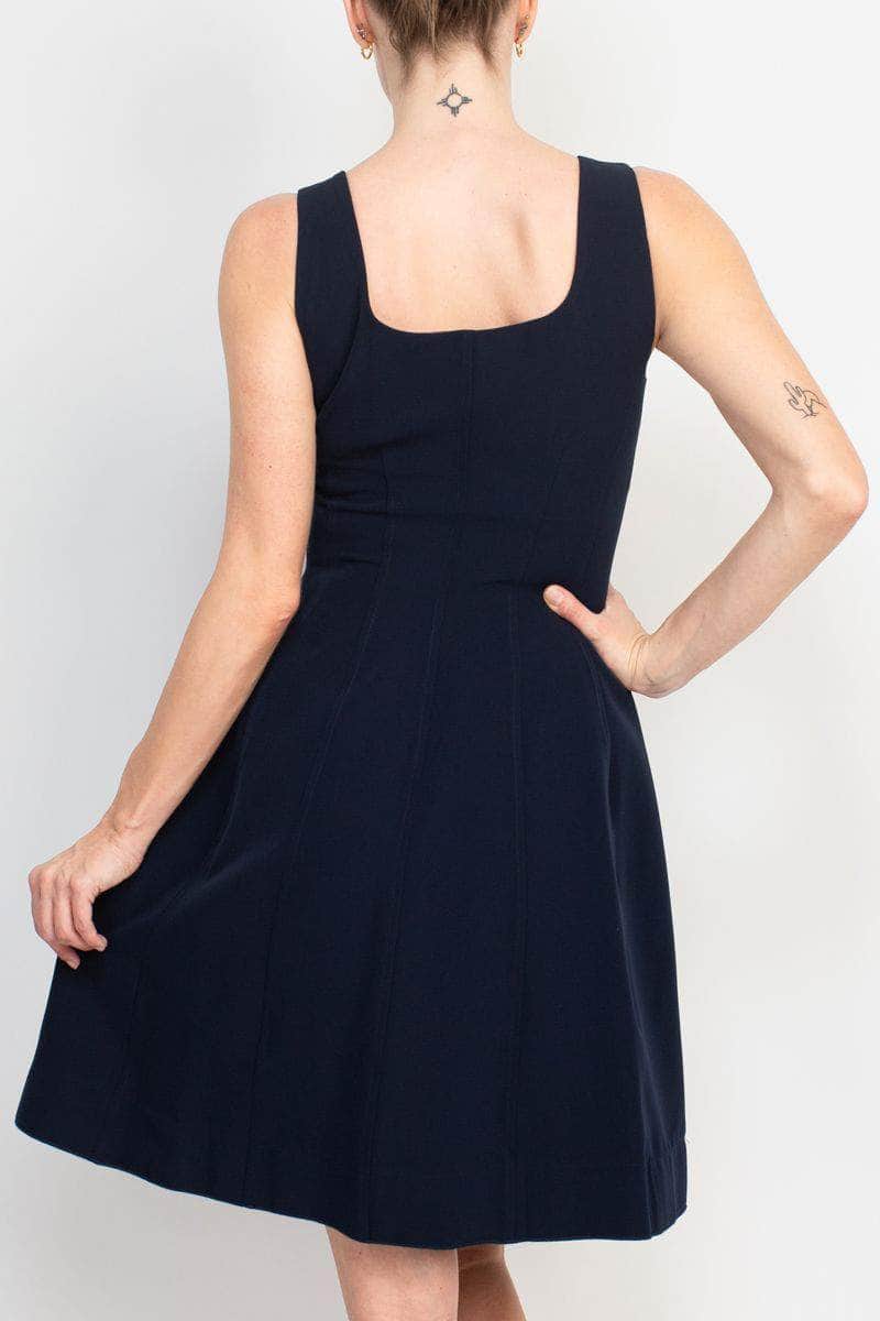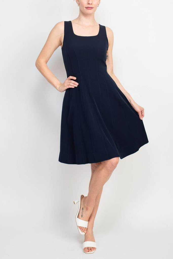 Get that glamorous casual feel in T Tahari THF95034 masterpiece. Tailored from stretch crepe fabric, this sleeveless dress offers comfort and has perfectly placed seams to flatter your shape. The wide shoulder straps, and square neckline mirrored by a midrise square back are displayed. It comes with a zipper closure on the side that allows you for easy wear. The skirt beautifully flares an A-line silhouette and drops to the playful short hemline. This simple yet chic T Tahari THF95034 dress is a perfect choice for any special occasion. Model is wearing Navy color.