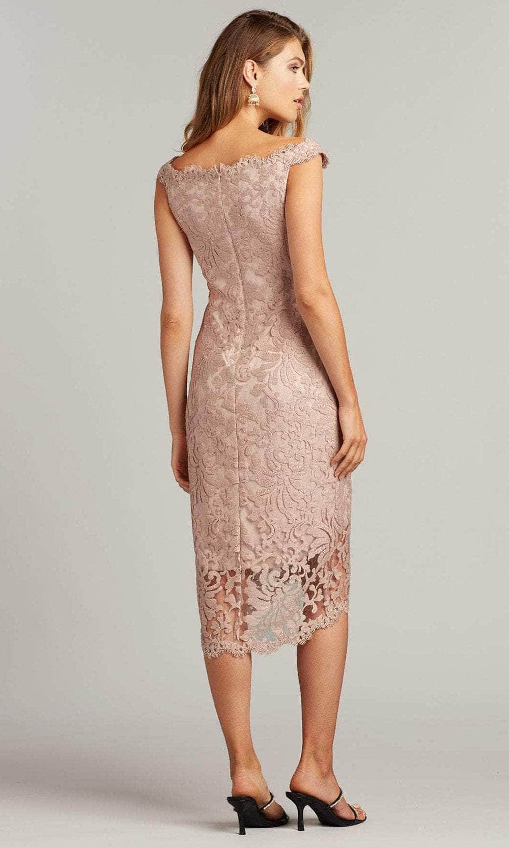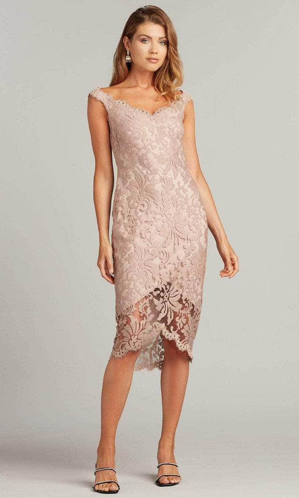 Get noticed in any crowd wearing this Tadashi Shoji 3K20118MD masterpiece. The stunning dress has an off-shoulder neckline, cap sleeves and a matching mid-open back. Beautiful lace embroidery adorns the entire slim-fitting bodice that will have you looking statuesque. Flaunting a tulle overlay in a high low angled hem, the tulle skirt is finished with a tea-length sheath silhouette. A scalloped trim detailing adds to the dress's elegance. Be the ultimate belle of the party in this gorgeous creation from Tadashi Shoji. model is wearing the Antique Pink color.