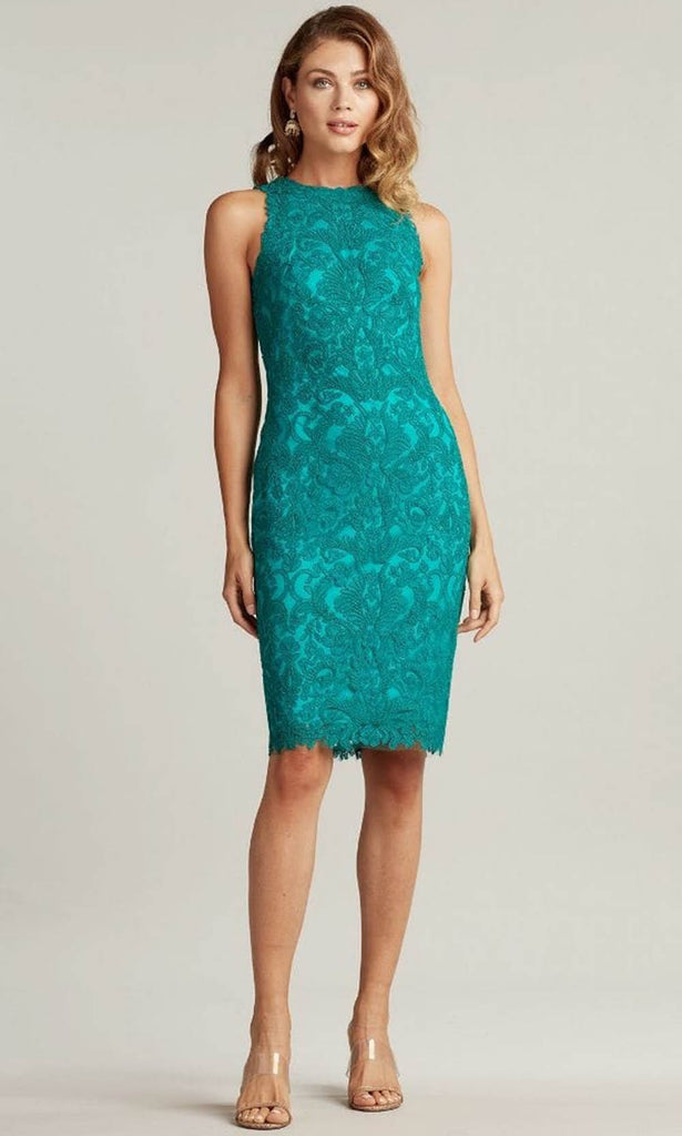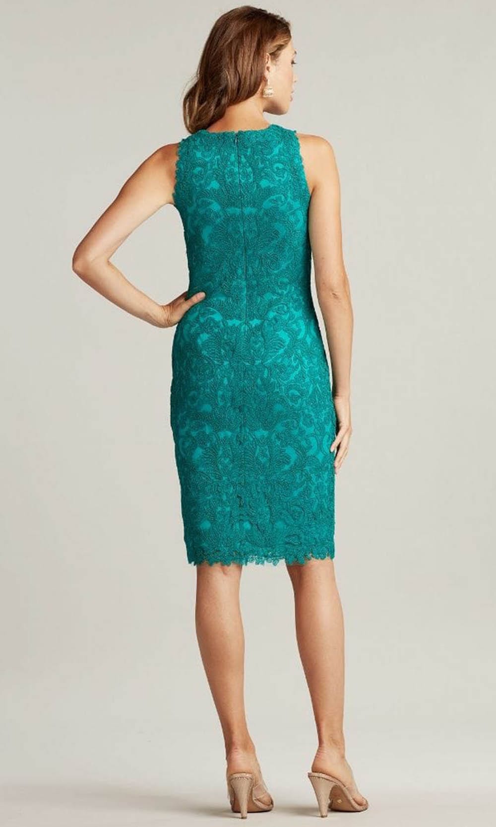 Lavish in the mesmerizing intensity of this Tadashi Shoji ALX18233MX creation. Exquisitely styled from exquisite golden-corded threads embroidered on tulle, this dress captivates with a jewel neckline and a full back. Rendered with a sleeveless bodice, the sheath skirt glides along the feminine form as it ends with a knee length hemline. Float into the room and completely captivate everyone in this Tadashi Shoji masterpiece. Stand out in the crowd with in Tadashi Shoji design with dresses that are meant to make women feel gorgeous, confident, and comfortable. Model is wearing the Aqua Blue color.