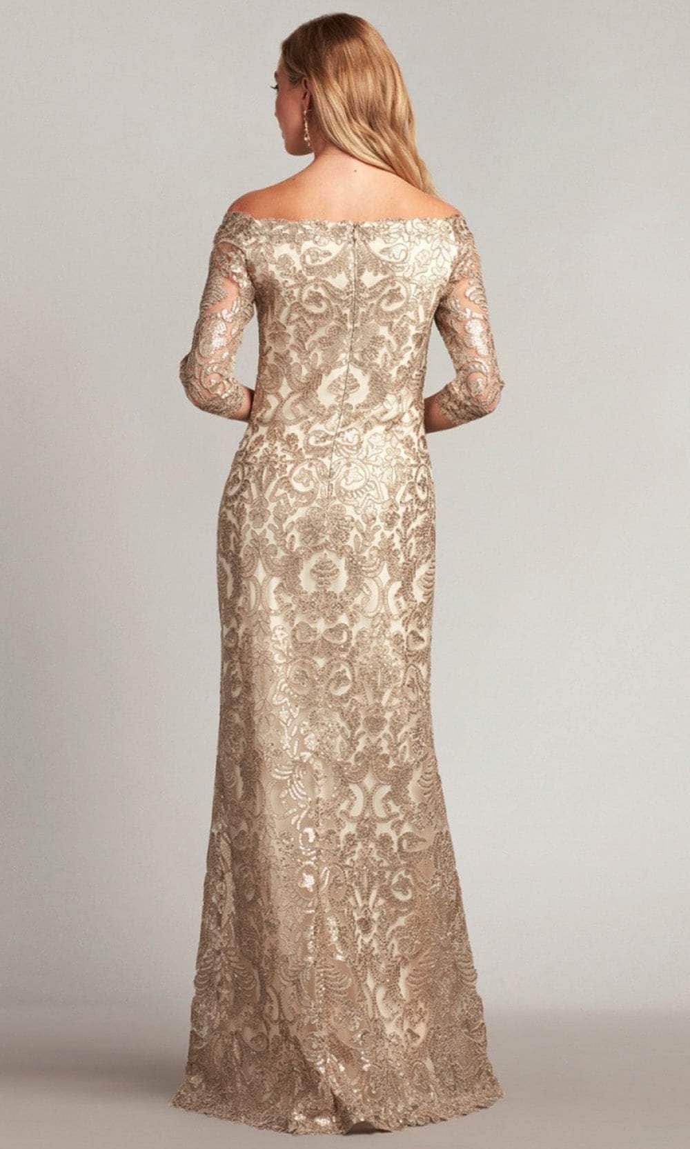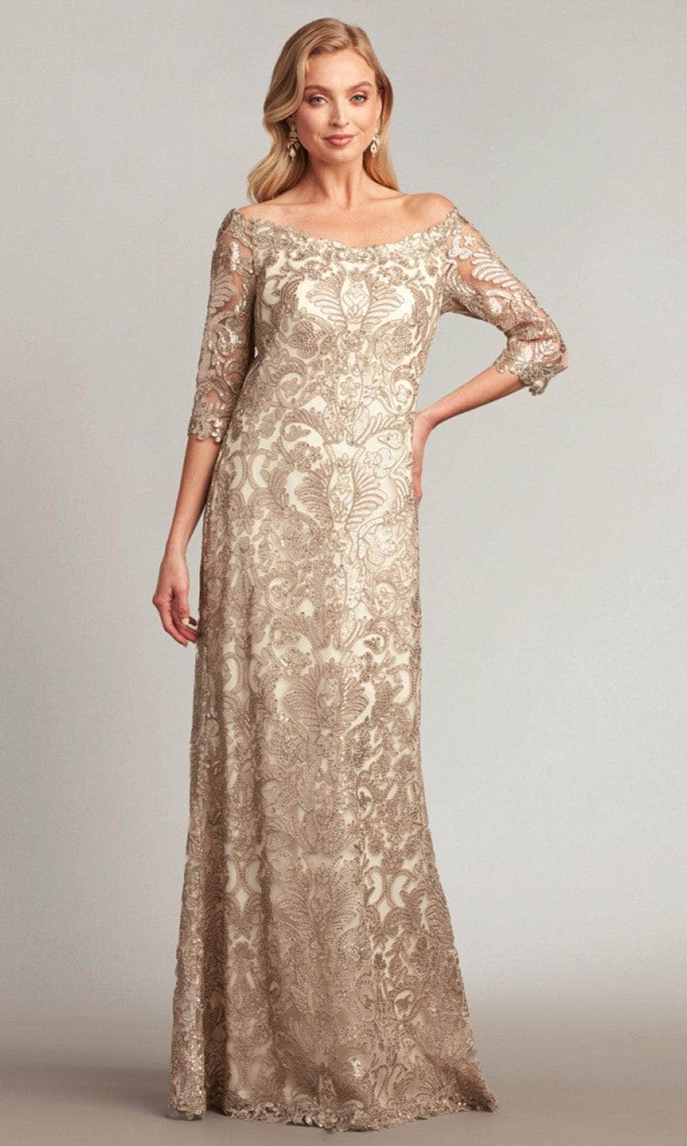 Make a graceful entrance at any formal affair with the Tadashi Shoji ATV18236L masterpiece. This gown is a testament to exquisite craftsmanship, adorned with a mesmerizing pattern of intricate embroidery and glistening sequins that catch the light with every step you take. The off-shoulder neckline elegantly highlights your beautiful collarbones, while the sheer quarter-length sleeves and mid-open back add a touch of feminine allure. Styled in a flattering sheath silhouette, the skirt hugs your curves in all the right places, cascading gracefully to a full-length hem adorned with delicate scalloped details. Radiate with beauty and confidence as you sparkle in the Tadashi Shoji ATV18236L creation, ensuring all eyes are on you throughout the evening. Model is wearing Pumice/Latte color.