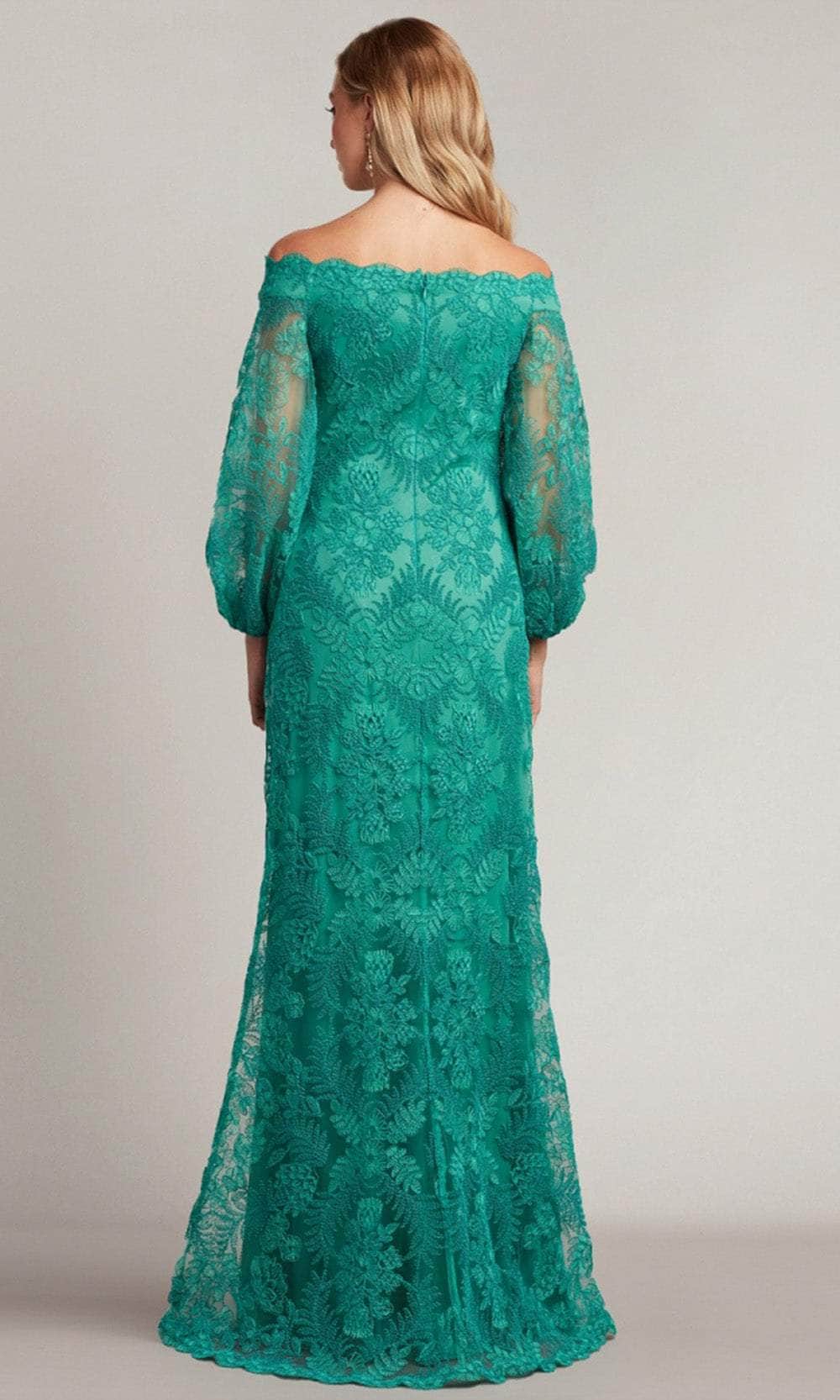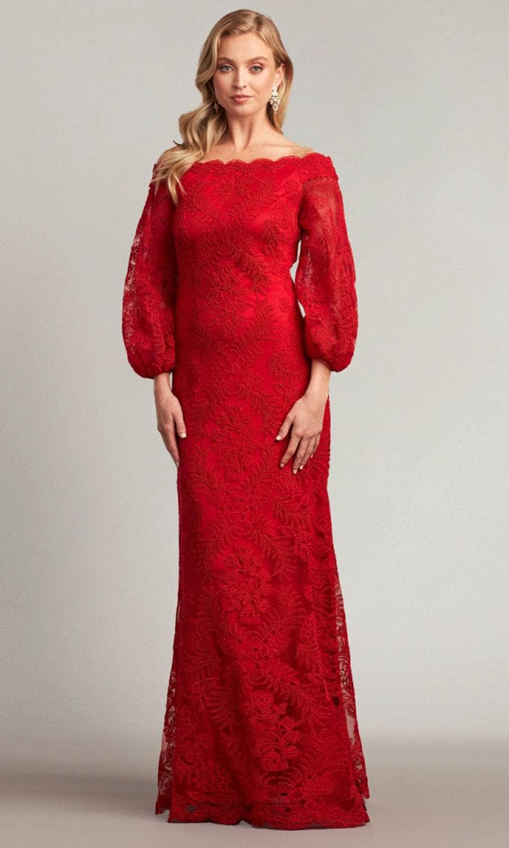 Bloom with loveliness in this detailed creation from Tadashi Shoji AUL19261L. This gown exudes an air of elegance and beauty with its all-over embroidery adornment. The straight off-shoulder neckline and mid-open back features scalloped detail, adding a touch of femininity. It also includes long illusion bishop sleeves for some arm coverage. The sheath skirt completes the look by flowing to the full length hemline. This Tadashi Shoji AUL19261L masterpiece is truly remarkable! Models are wearing Cool Aqua, and Deep Red colors.
