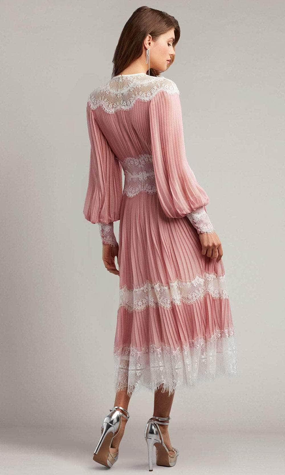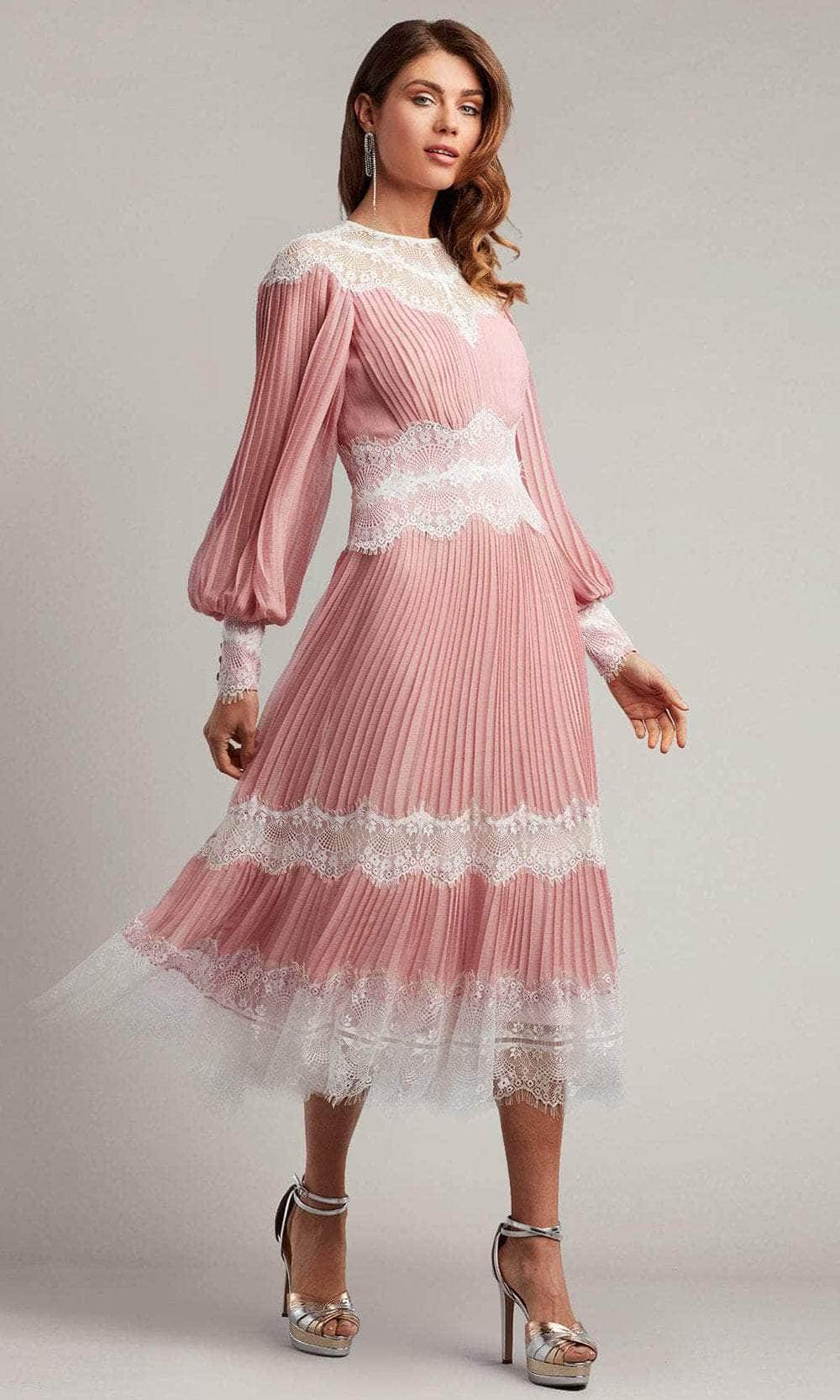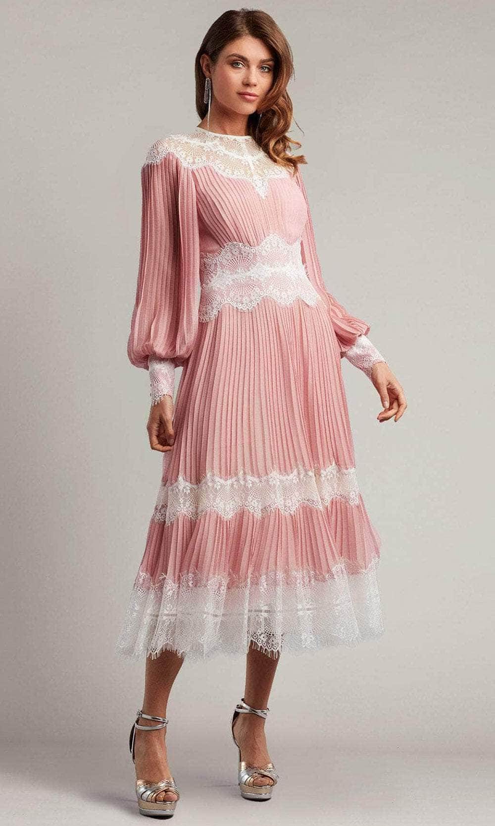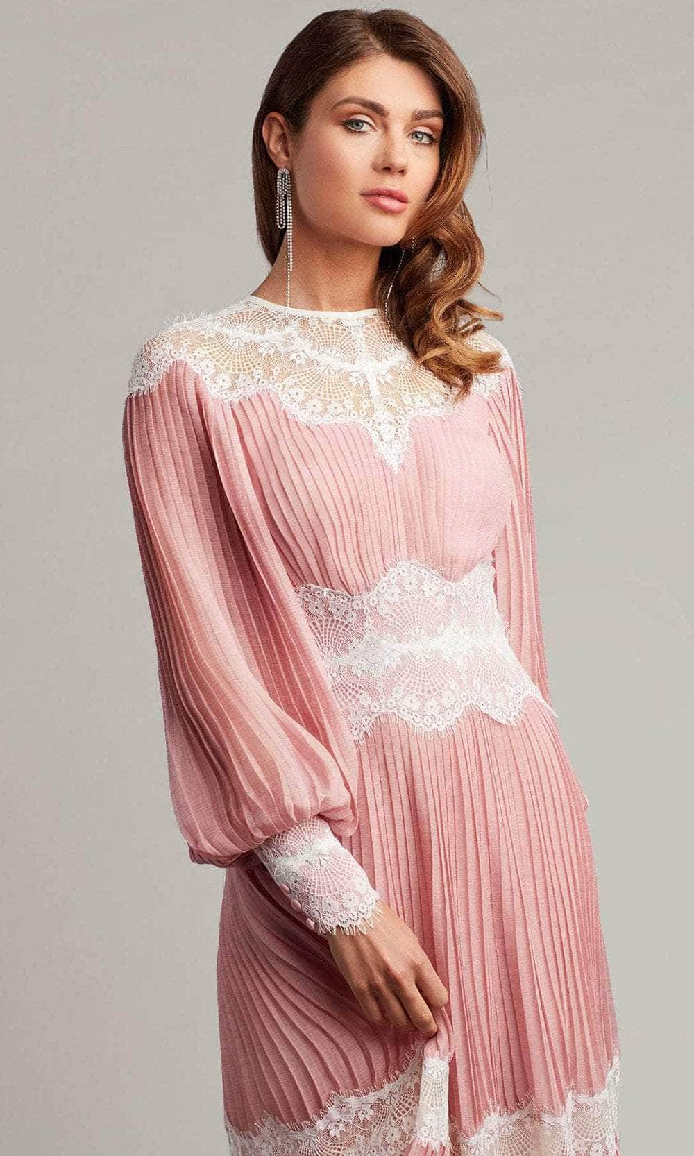 Every detail of this Tadashi Shoji AVO22184MD formal dress is dripping with faultless charm. Fascinatingly detailed with seamed scalloped lace on the pleated crinkle chiffon silhouette, this dress will capture everyone's attention. It displays a sheer lace yoke jewel neckline, a long bishop sleeve with lace-trimmed cuffs and the full back with concealed zipper closure. The lace-trimmed tiered skirt beautifully flares an A-line silhouette that cascades down to a tea-length hemline. This Tadashi Shoji style is a sure standout on your next evening social event. Model is wearing the Pale Pink/White color.