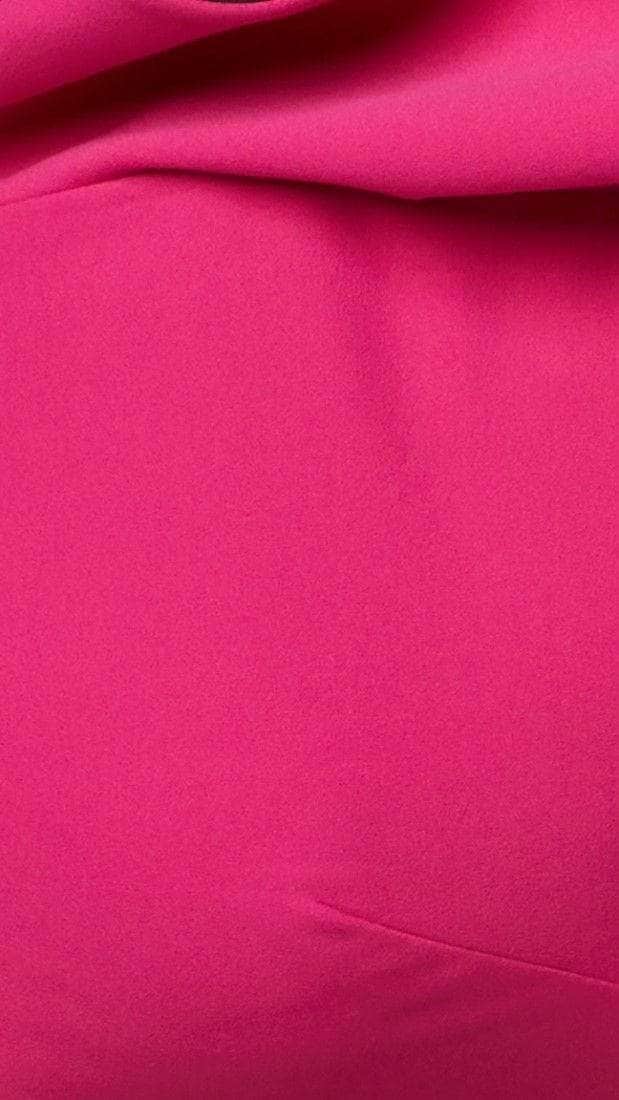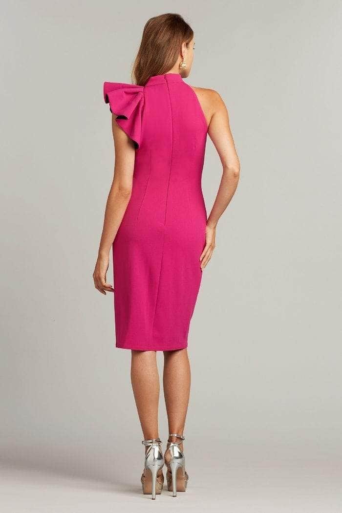 By fusing sophistication and statement style, this crepe dress achieves a level of versatility that deserves to be celebrated. The two-toned flounce is more architectural in design, with soft folds falling gracefully from the shoulder to the waistline. When you combine the halter-cut neckline and fitted silhouette of this cocktail dress, you have a must-have for special occasion dressing. Â Model is wearing Hibiscus color.Â