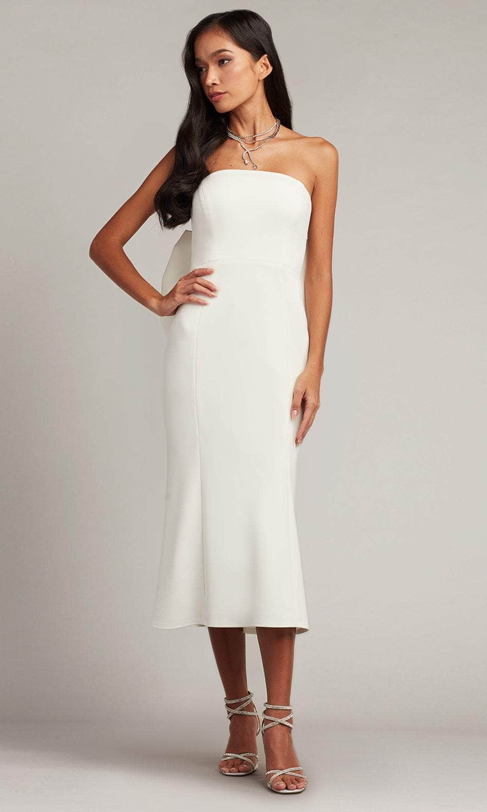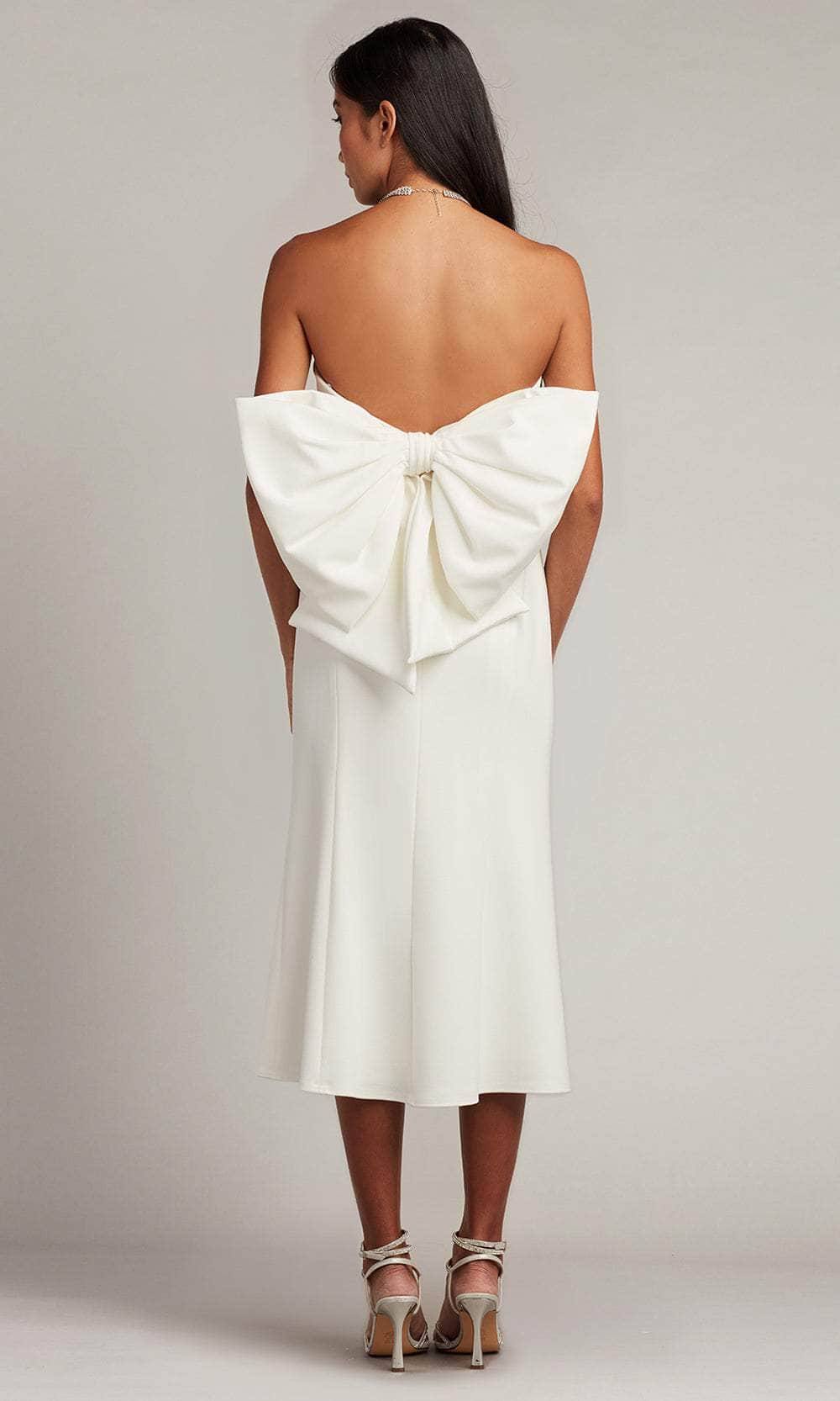Flaunt your sophisticated style with this classy Tadashi Shoji BOS22808MD formal dress. All eyes will be on you as grace the hall wearing this attire which features a highly elegant strapless, straight across neckline on a fitted bodice. It also reveals princess seams and an alluringly open back, highlighting is captivating big bow. Additionally, a sheath silhouette is displayed on its tea-length skirt. Be the lady of the night in this Tadashi Shoji BOS22808MD masterpiece. Model is wearing Ivory color.