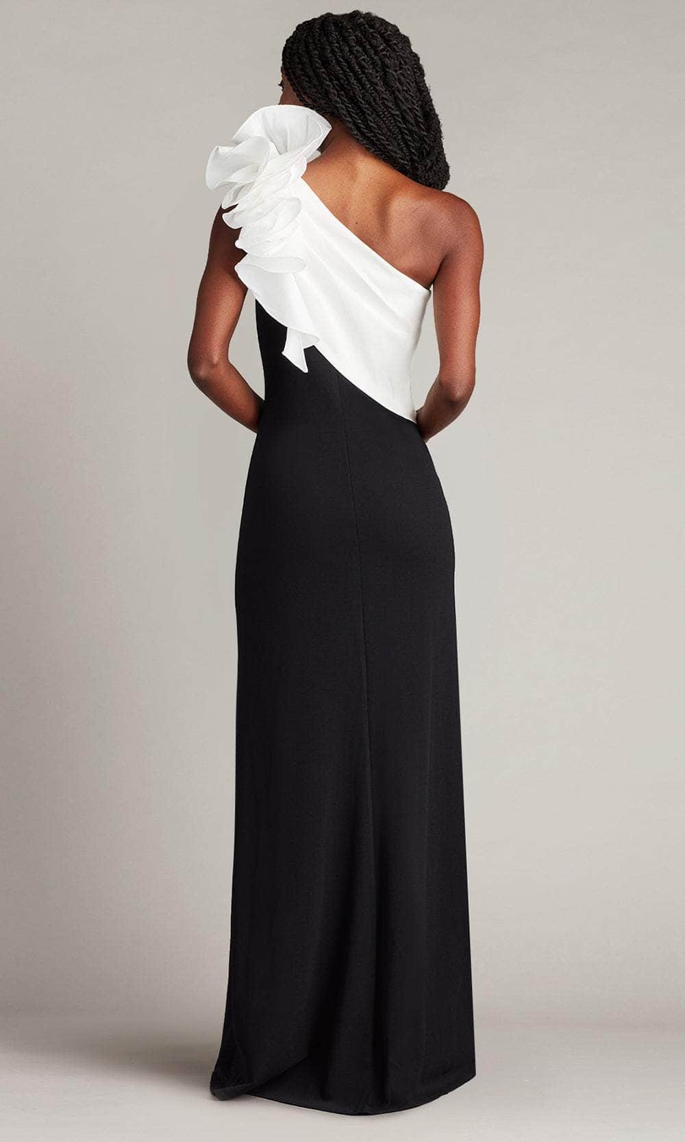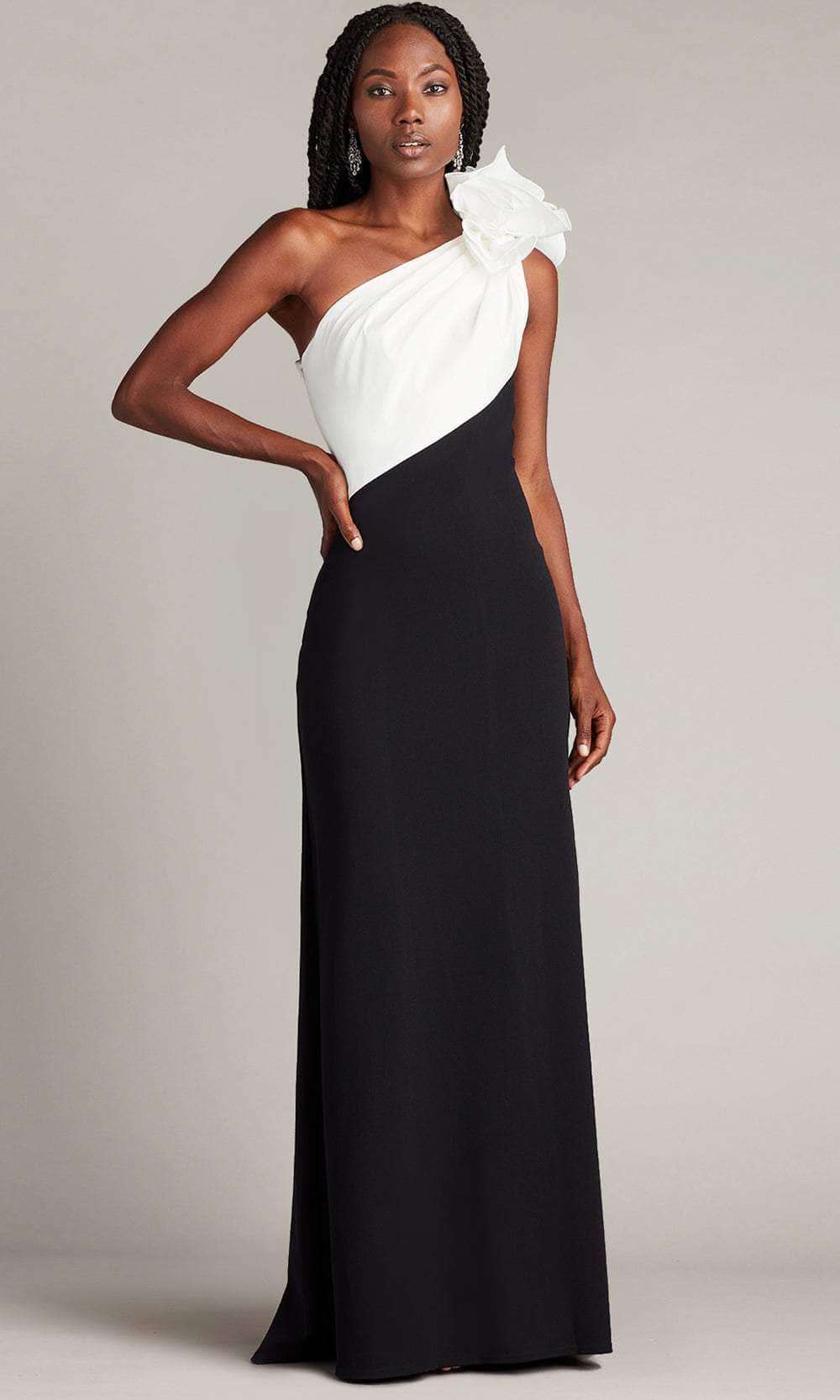 Behold a masterpiece of modern elegance: the Tadashi Shoji BOS23478L creation. The luxurious fabric drapes beautifully, sculpted by meticulous tailoring to flatter your figure. A single, sculptural floral accent adorns the shoulder, adding a touch of artistic intrigue. The one-shoulder neckline and asymmetrical waist detail whisper of contemporary allure, while the ruffle accent gracing the open back adds a touch of playful movement. The sheath skirt cascades into a chic floor-length hem, ensuring a touch of timeless elegance. Celebrate a night out under the city lights, the Tadashi Shoji BOS23478L creation leaves a lasting impression on every guest. Models are wearing the Ivory/Black and Navy colors.