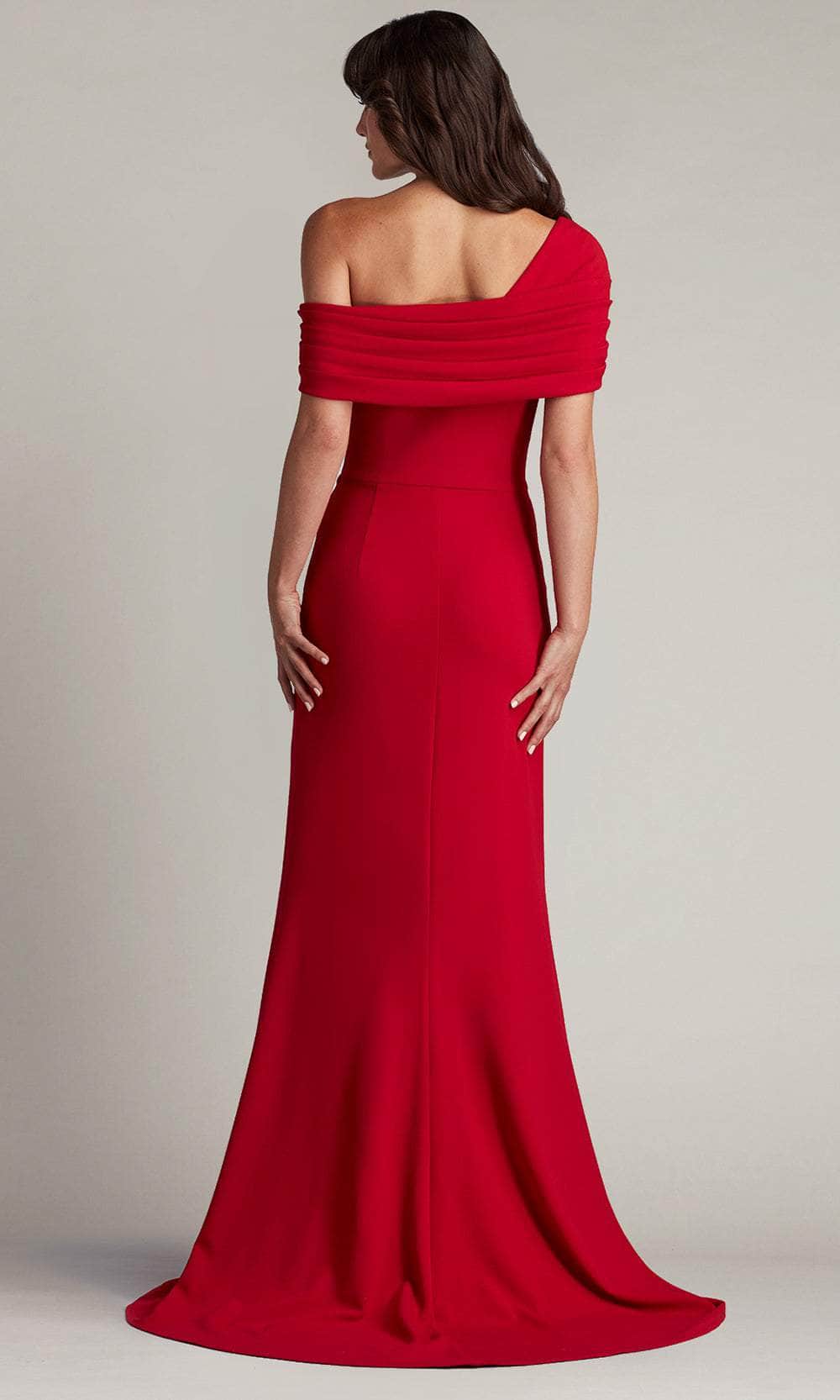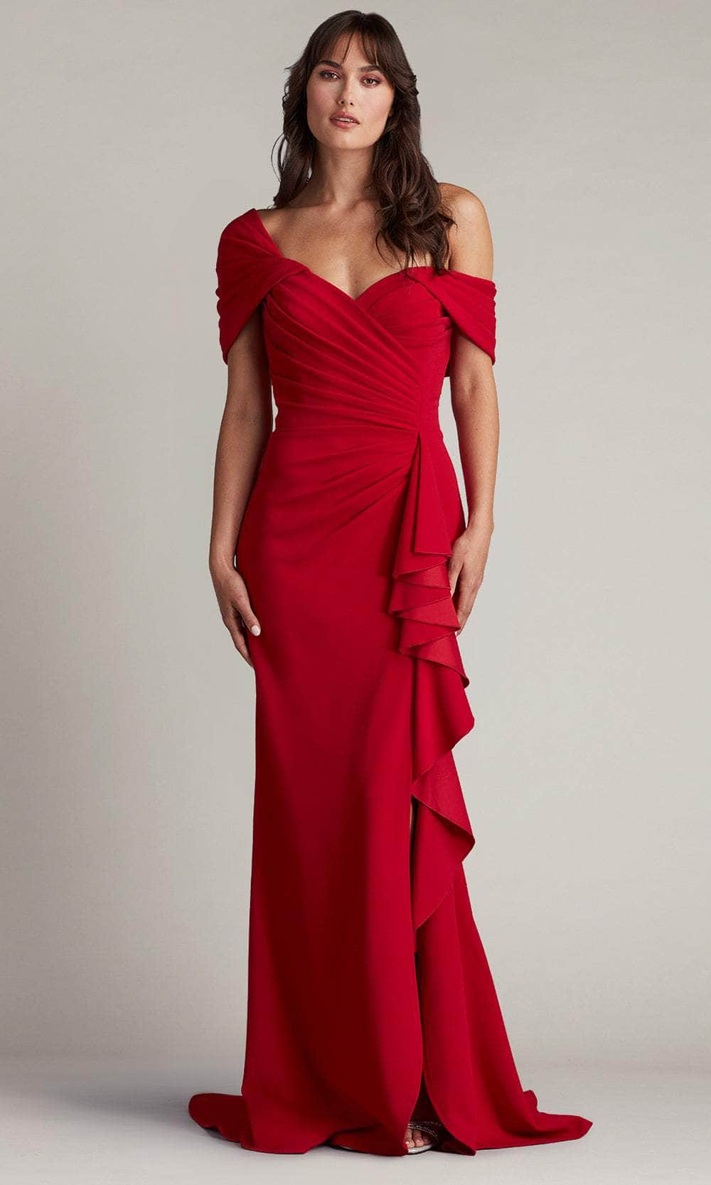 Clothe yourself in an alluring perfection with this elegant Tadashi Shoji BOS24107L evening dress. You are sure to be admired once you wear this dress which features an endearing off-shoulder neckline on a fitted bodice. Its bodice reveals sophisticated pleat designs, while its natural waist showcases ruffle details cascading down to its floor length skirt. Additionally, this attire also displays a mid-open back and a slit which further elevates its overall appeal. Take your seat on the throne in this queenly Tadashi Shoji BOS24107L masterpiece. Model is wearing Scarlet color.