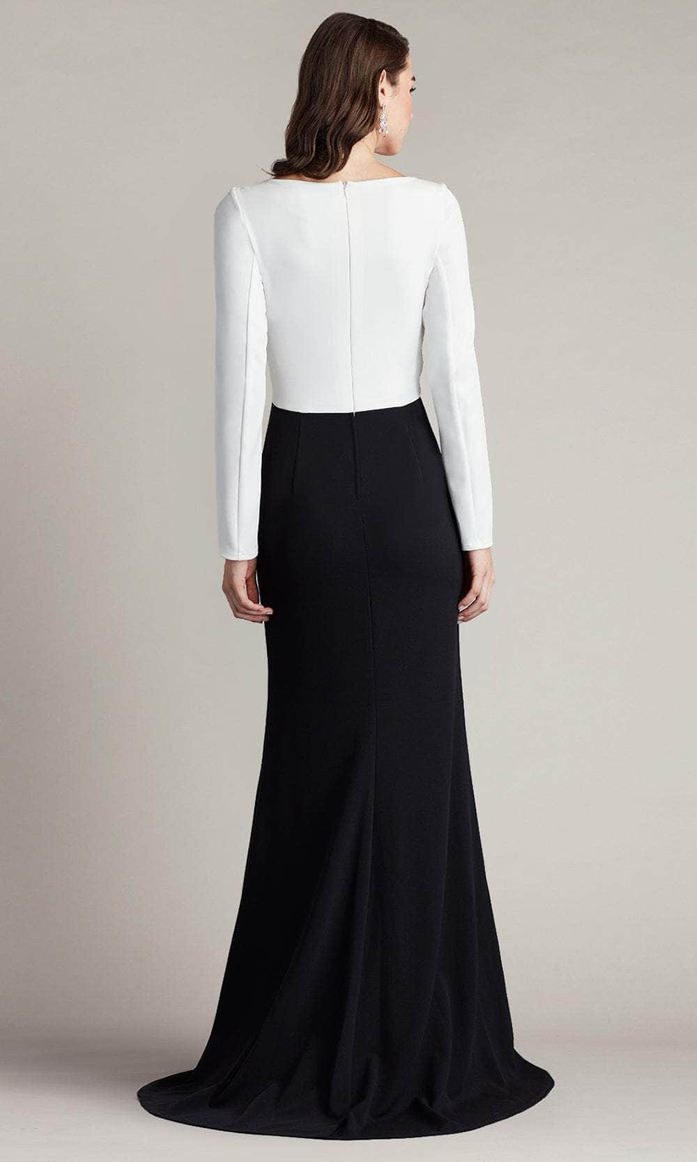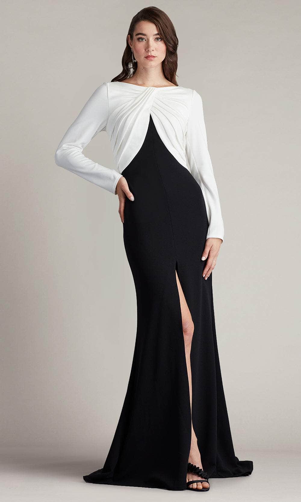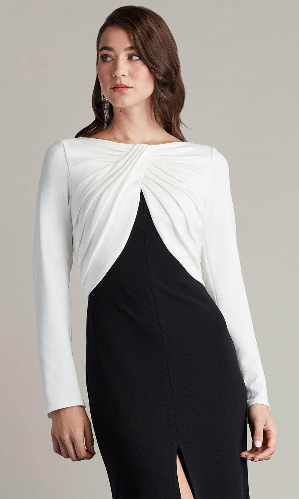 Look sophisticated and mature in this simple yet chic Tadashi Shoji BOS24372L formal dress. You will be the standard of elegance once you wear this two-toned dress which features a classy bateau neckline, complemented by long sleeves. It also reveals a pleated designs on the bust area which further elevates the overall appeal of this attire. Additionally, it showcases a full back that is enclosed by a zipper to achieve a polished finish. A high slit is also exposed on the floor-length sheath skirt, making the dress a little bit more alluring. This Tadashi Shoji BOS24372L masterpiece is a charming choice for your next special occasion. Model is wearing Ivory/Black color.