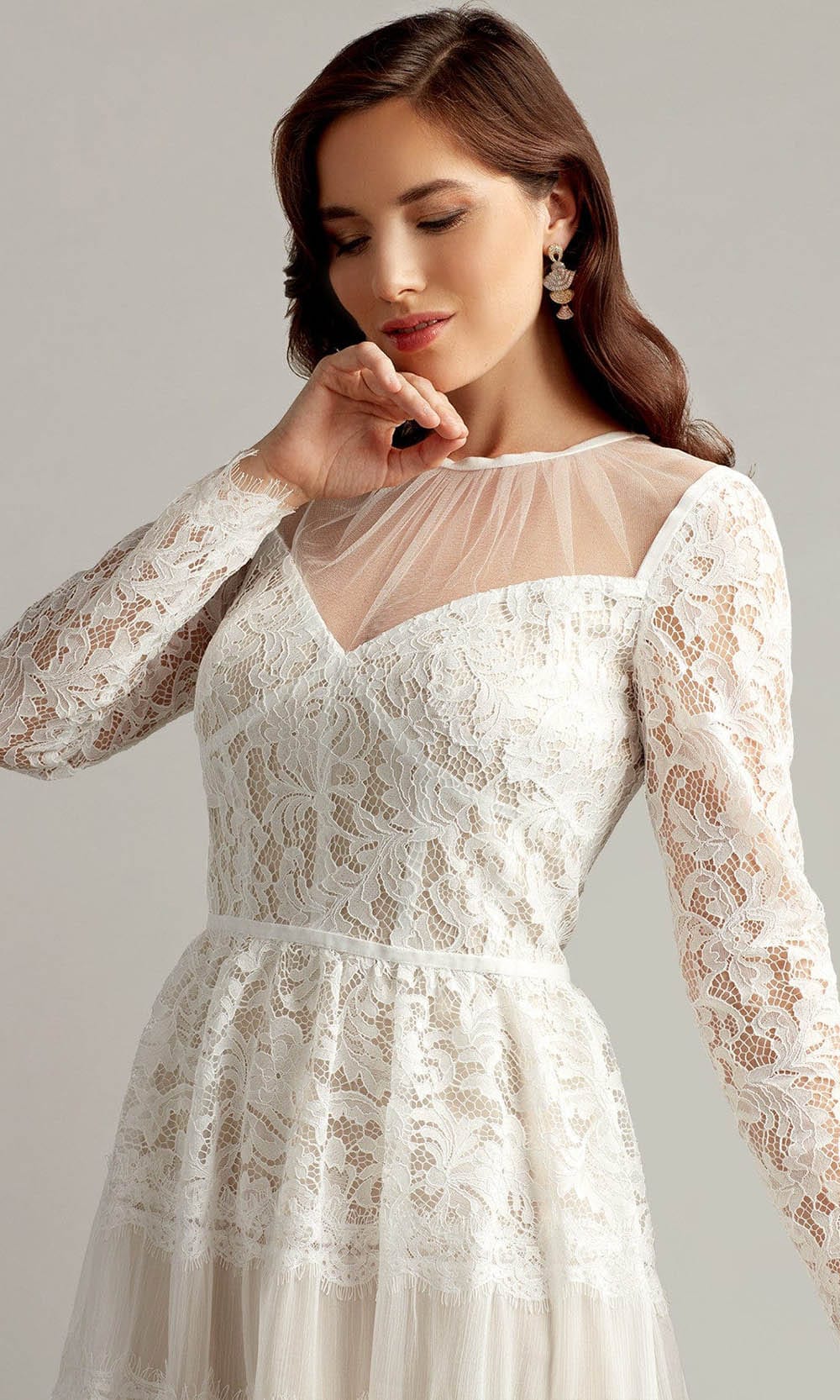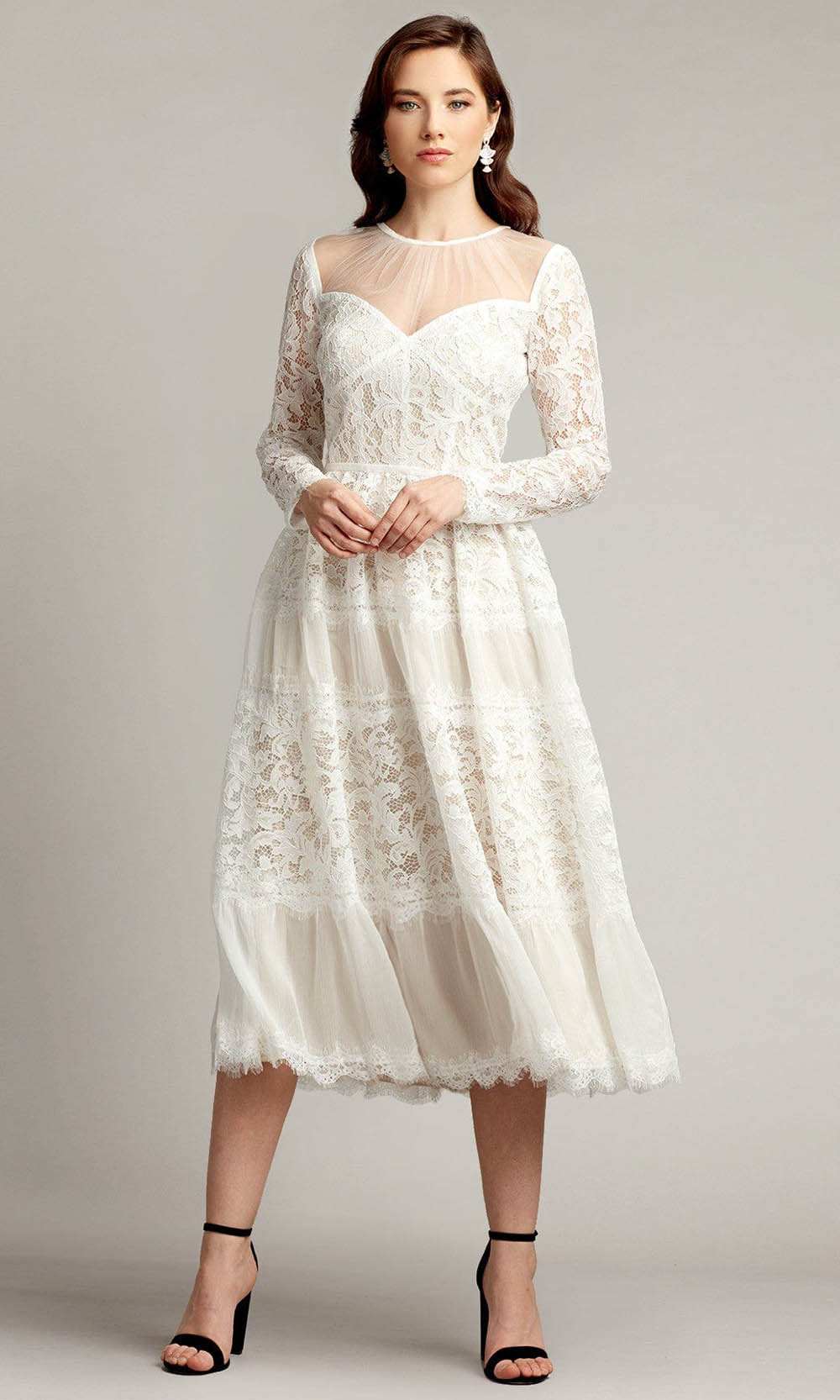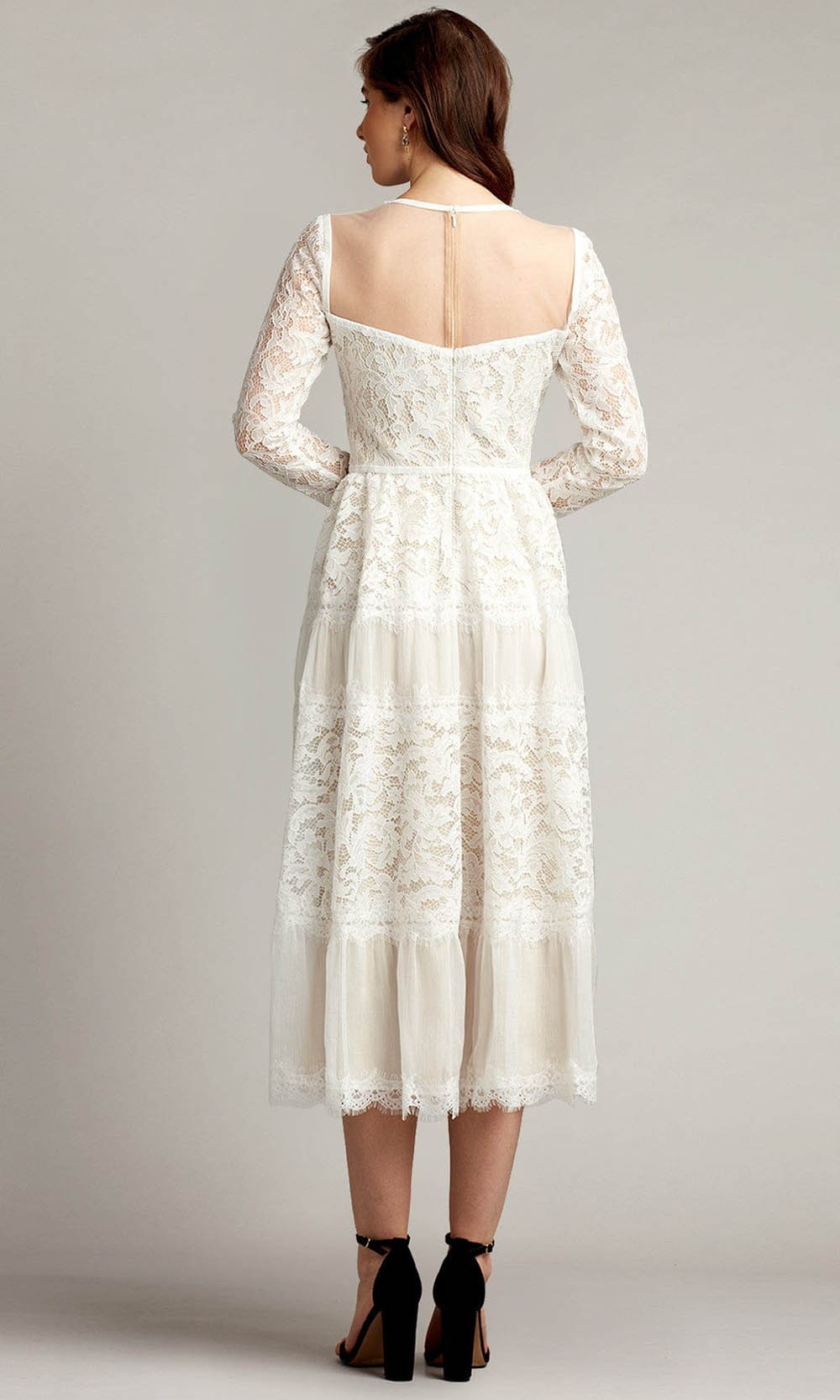 Walk into the room like an ethereal beauty in this Tadashi Shoji BQJ18619MDX creation. Fashioned with a bustier-inspired bodice and long sleeves rendered in lace, this dress features an illusion jewel neckline. Styled with a sheer full back, the tiered skirt creates a lace and chiffon silhouette that ends at a tea length hemline. Flaunt a captivating style that is full of allure and romance in this Tadashi Shoji masterpiece. Stand out in the crowd with in Tadashi Shoji design with dresses that are meant to make women feel gorgeous, confident, and comfortable. Model is wearing the White/Nude color.