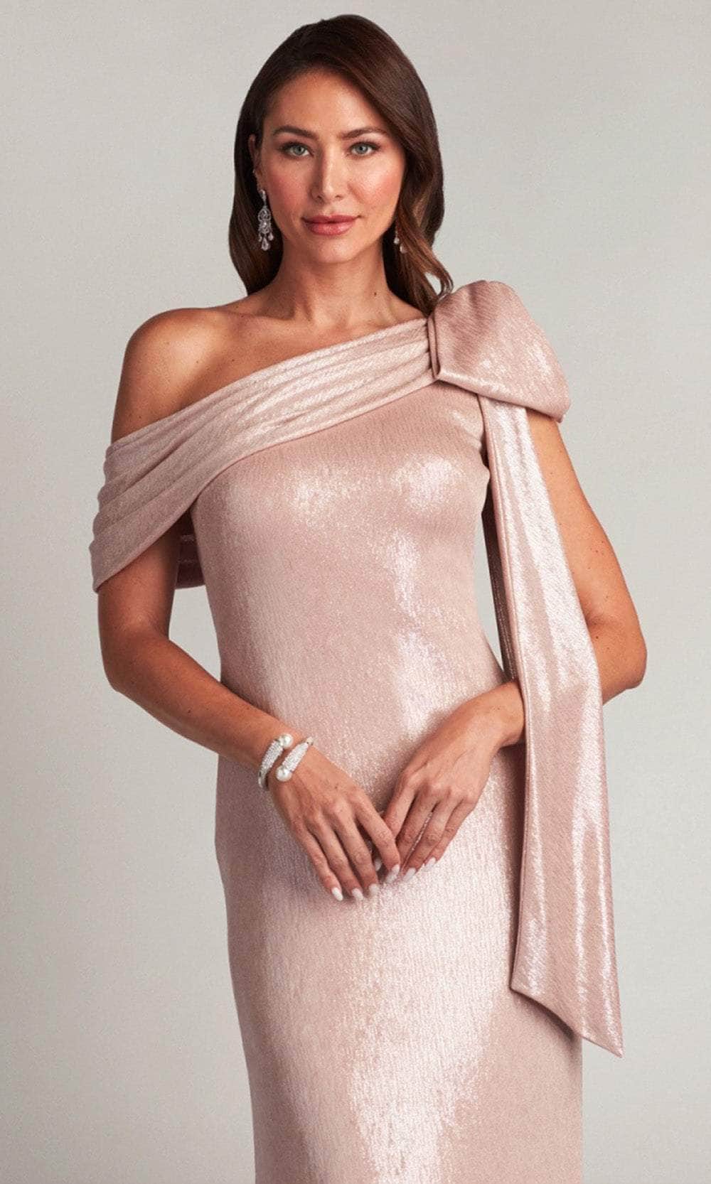 Impress everyone with the elegance of this Tadashi Shoji BSJ18371L creation. This show-stopping piece is crafted from luxurious metallic jersey lame fabric. It displays a draped one shoulder bodice with a stunning bow accent on top, asymmetric neckline and alluring mid-open back. The skirt carves a sheath silhouette that beautifully accentuates your figure and finishes in a full length hemline. Dive into a divine event in this luxe Tadashi Shoji BSJ18371L masterpiece. Model is wearing Antique Pink color.