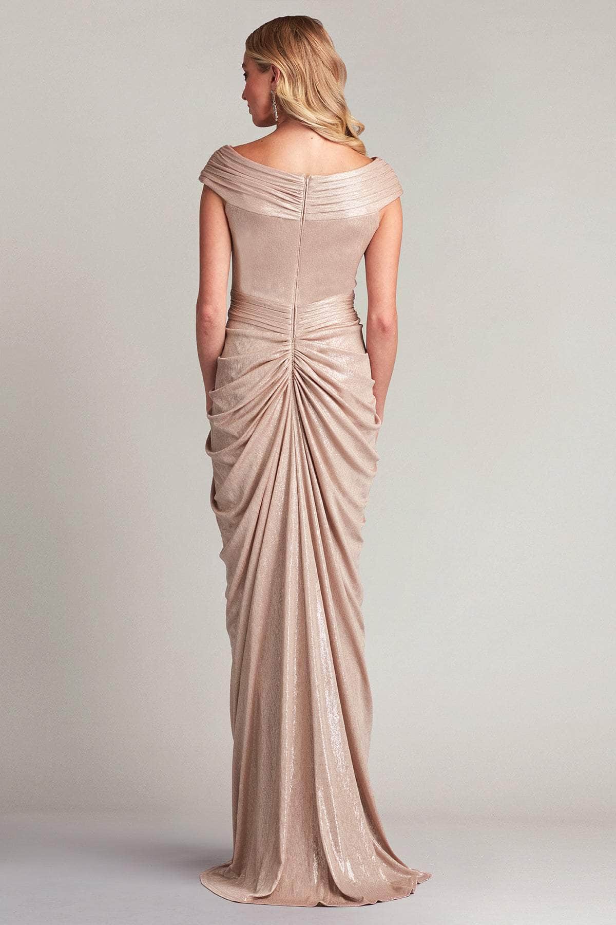 This Tadashi Shoji BSJ22422L evening dress will definitely make you feel special on your special occasion. Dazzle all night long with this metallic dress that features an alluring wide V-neckline on a fitted bodice, paired with cap sleeves for added sophistication. This attire also showcases a full back that is enclosed by a zipper for a refined finish. Additionally, this entire attire is styled with draping effects, making it a truly captivating and stunning fit. It also displays a waistband as well as a slit on the floor-length sheath skirt, heightening the overall appeal of this masterpiece. Shock everyone with your timeless beauty with this glamorous Tadashi Shoji BSJ22422L masterpiece.