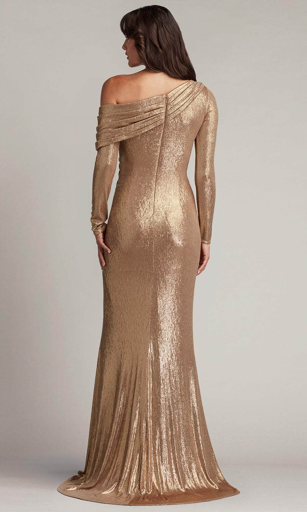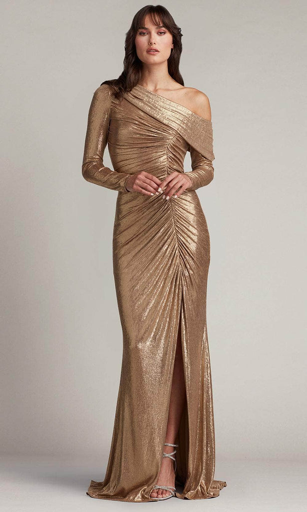 Shine with the glow of ever after in this mesmerizingly captivating Tadashi Shoji BSJ24030L evening dress. You are sure to own the spotlight with this metallic dress which features an endearing draped asymmetrical neck and back, complemented by charming long sleeves. This fitted dress showcases a ruching effect on the front, followed by an enticing slit which is evident down to the floor length of the sheath-silhouette skirt. This Tadashi Shoji BSJ24030L masterpiece will definitely bring out the goddess in you! Model is wearing Gold Dust color.