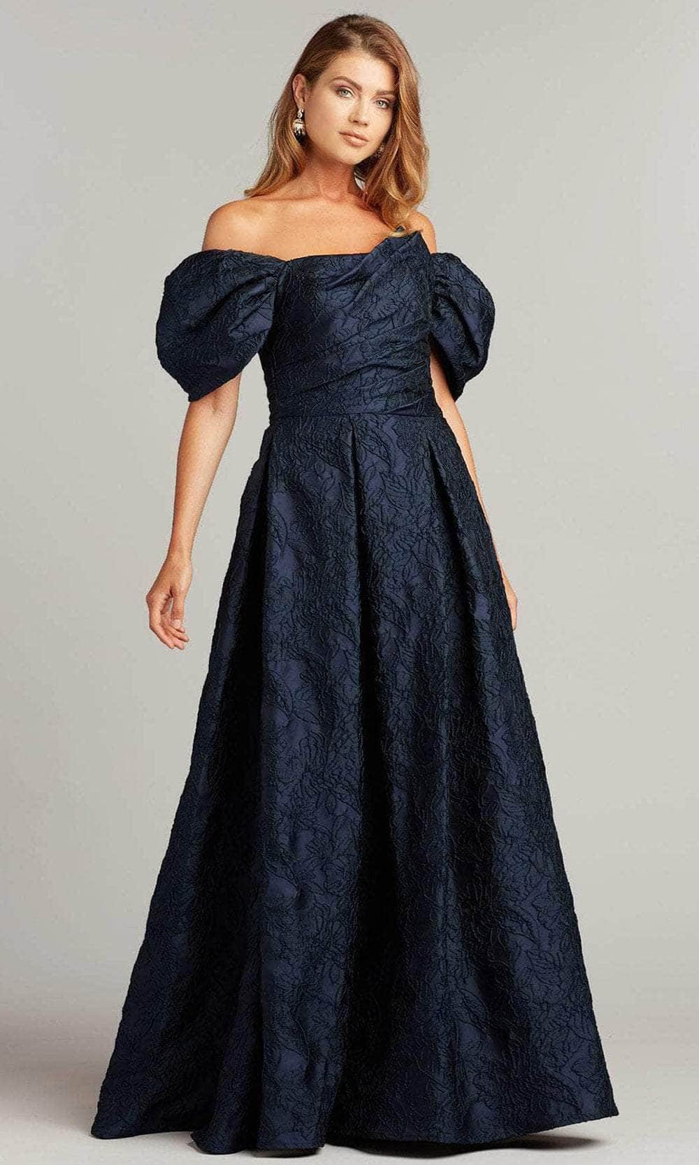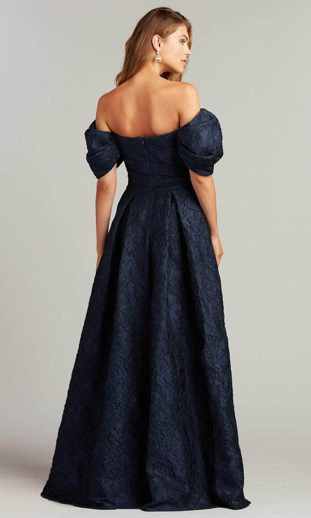 Walk the red carpet in style wearing this stunning Tadashi Shoji BSW22004L creation. Attractively crafted in floral jacquard fabric, this ensemble features a draped pleated bodice with an off-shoulder straight-across neckline, mid-open back and a dramatic oversized puff sleeves. This classy gown reveals a box pleated skirt that flares fascinatingly into a full-length A-line silhouette. Breeze through your special day while making a stylish statement in this Tadashi Shoji masterpiece. Model is wearing the Royal Navy color.