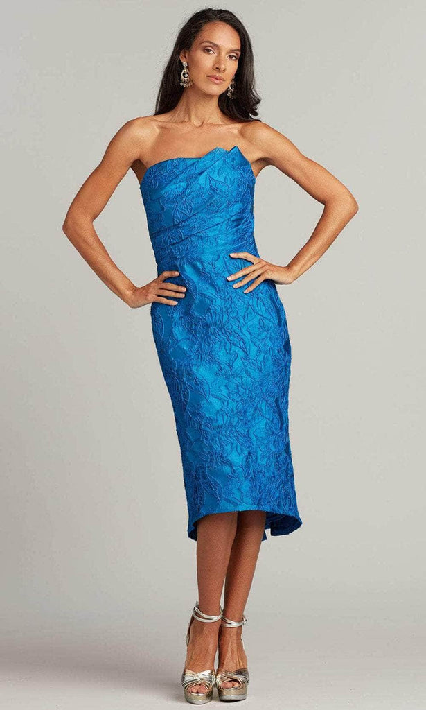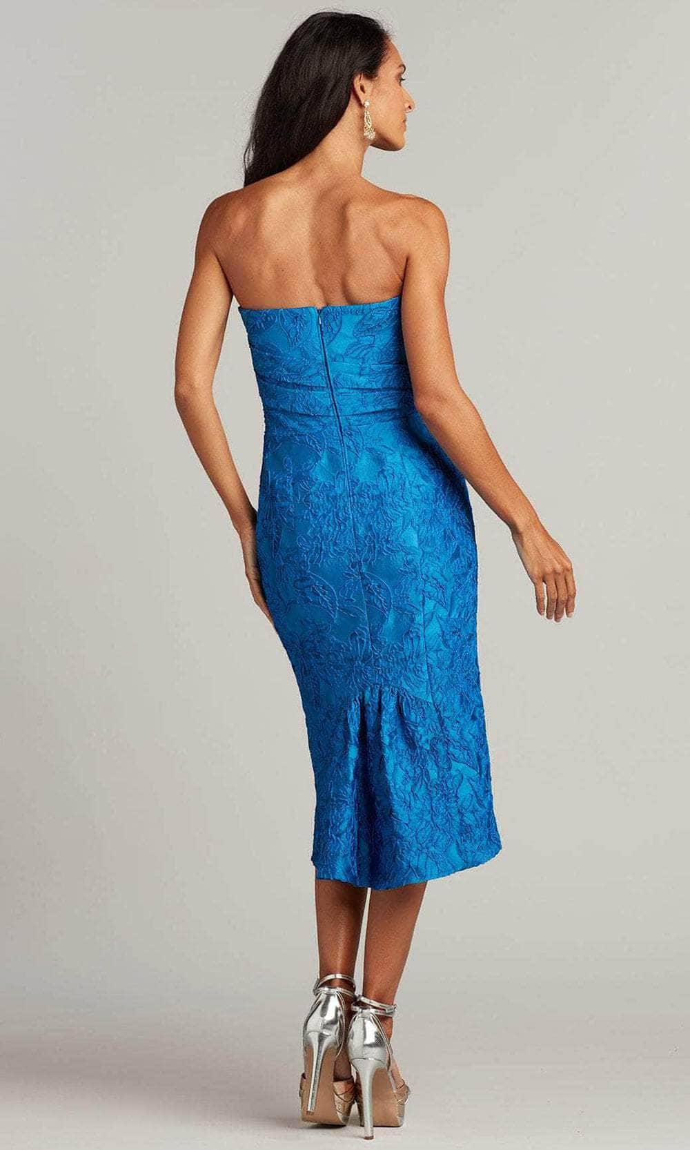 Look fresh and pretty in this creation by Tadashi Shoji BSW22008MD. Featuring a strapless and straight-across neckline, this floral jacquard dress is designed with a draped pleated bodice that accentuates your figure beautifully. The back reveals a mid-open cut detail secured by a center zipper closure. The dress parades a tea-length sheath silhouette accented with godets design at the lower skirt for added glamour. Make your perfect day blossom with a promise of forever in this Tadashi Shoji masterpiece. Model is wearing the Sky color.