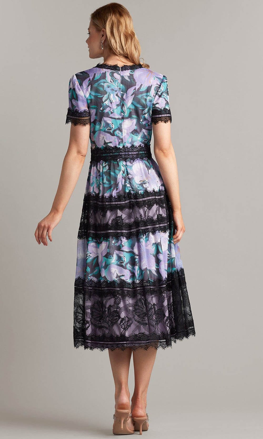 Dress to impress with this stylishly designed Tadashi Shoji BUH20506MD creation. Exceptionally tailored in stunning floral rendered jersey with trims of delicate lace, this dress features a v-neckline with lovely short sleeves. This dainty tea length dress features an A-line skirt that flares into a lace-trimmed hemline. Render a showstopping style in this fascinating Tadashi Shoji masterpiece. Stand out in the crowd with in Tadashi Shoji design with dresses that are meant to make women feel gorgeous, confident, and comfortable. Model is wearing the Lilac/Floral color.