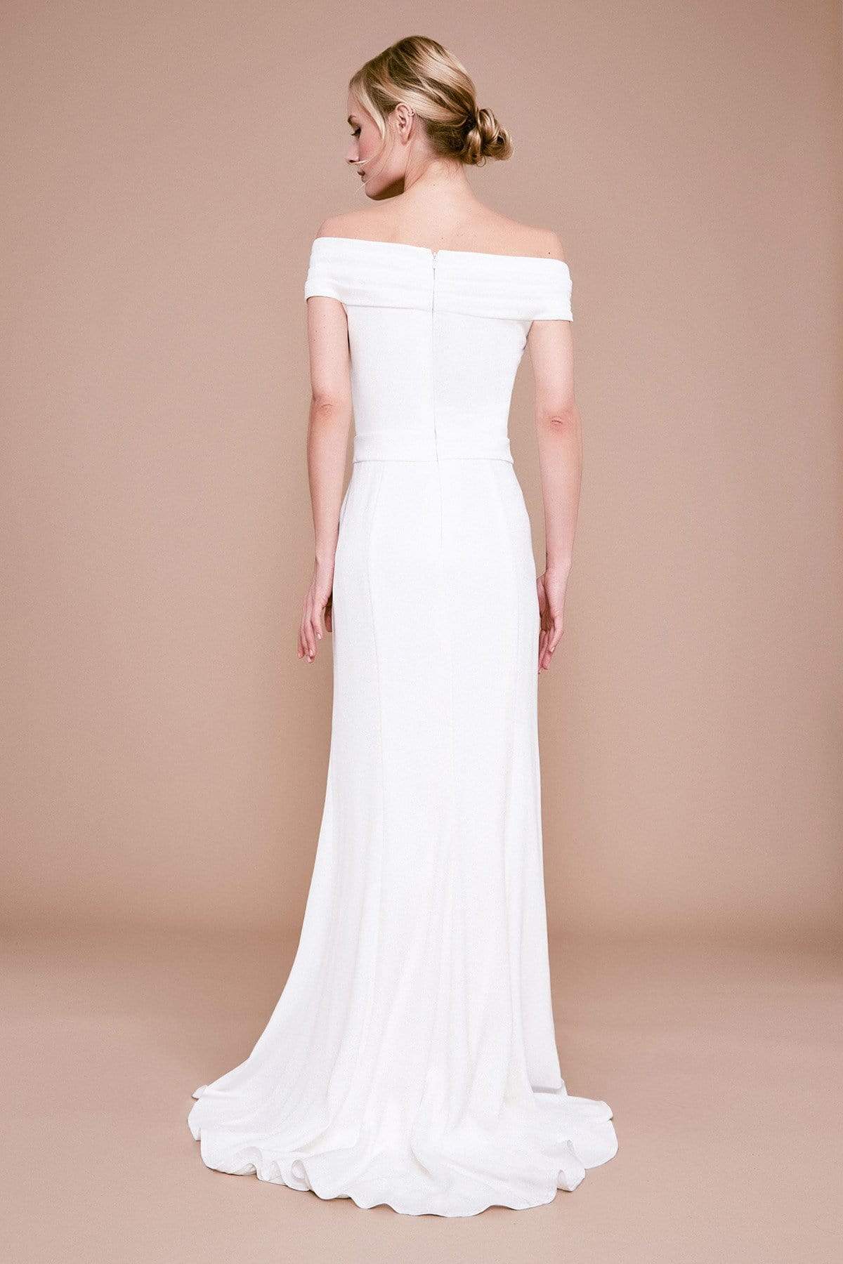 | Details: | Off-shoulder sleeves, Fitted bodice, Sheath skirt, Tucks, Folds, Sweep train |