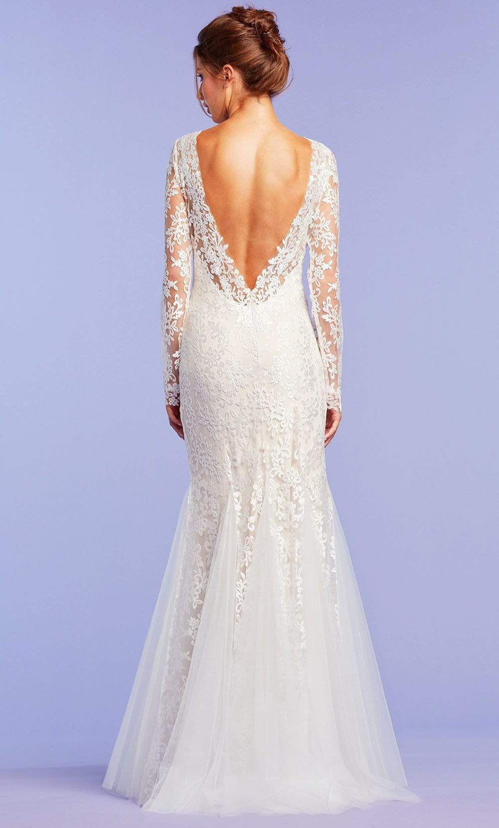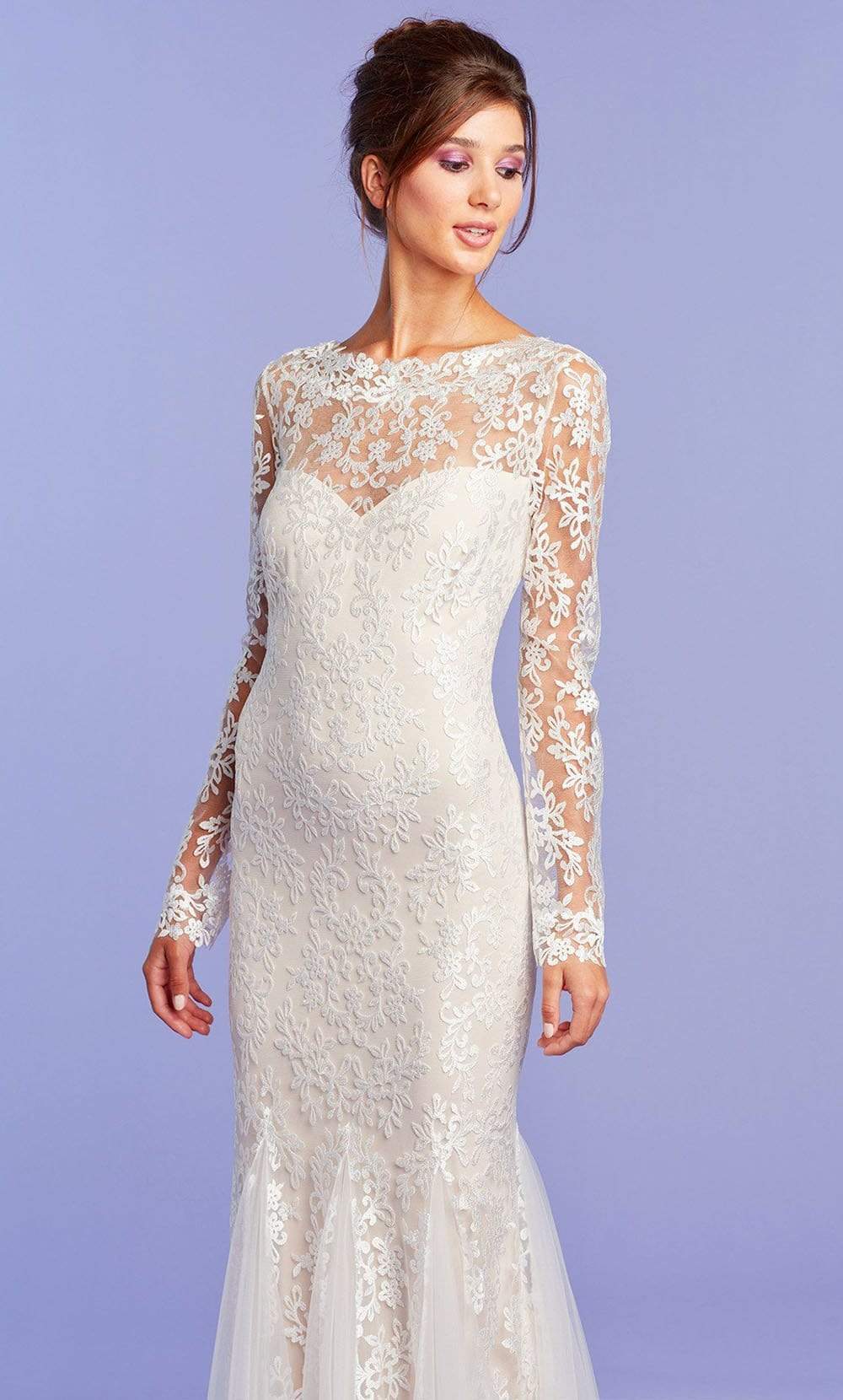 Reveal a timeless flair into your wedding day in this Tadashi Shoji BQF20404LBR creation. Capturing with embroidered details overlaying the fitted lining, this beauty shows an illusion bateau neckline and sheer long sleeves. The plunging v-open back is accented with a concealed zipper. Tulle godet accents spill along the flare of its full-length trumpet silhouette and train. Glow with charm and elegance in this Tadashi Shoji masterpiece.