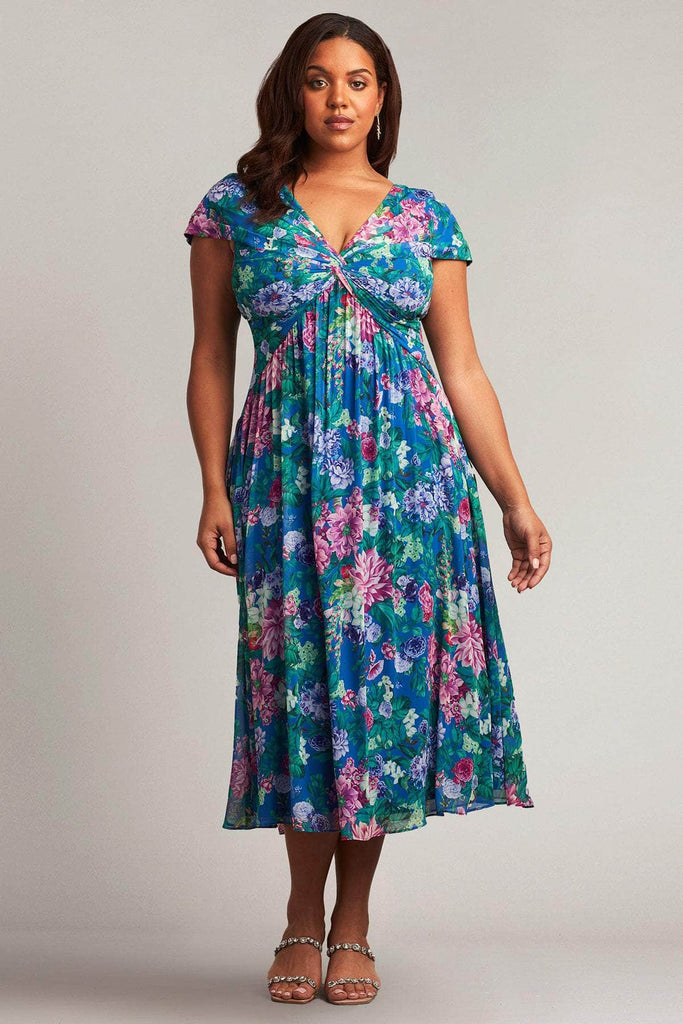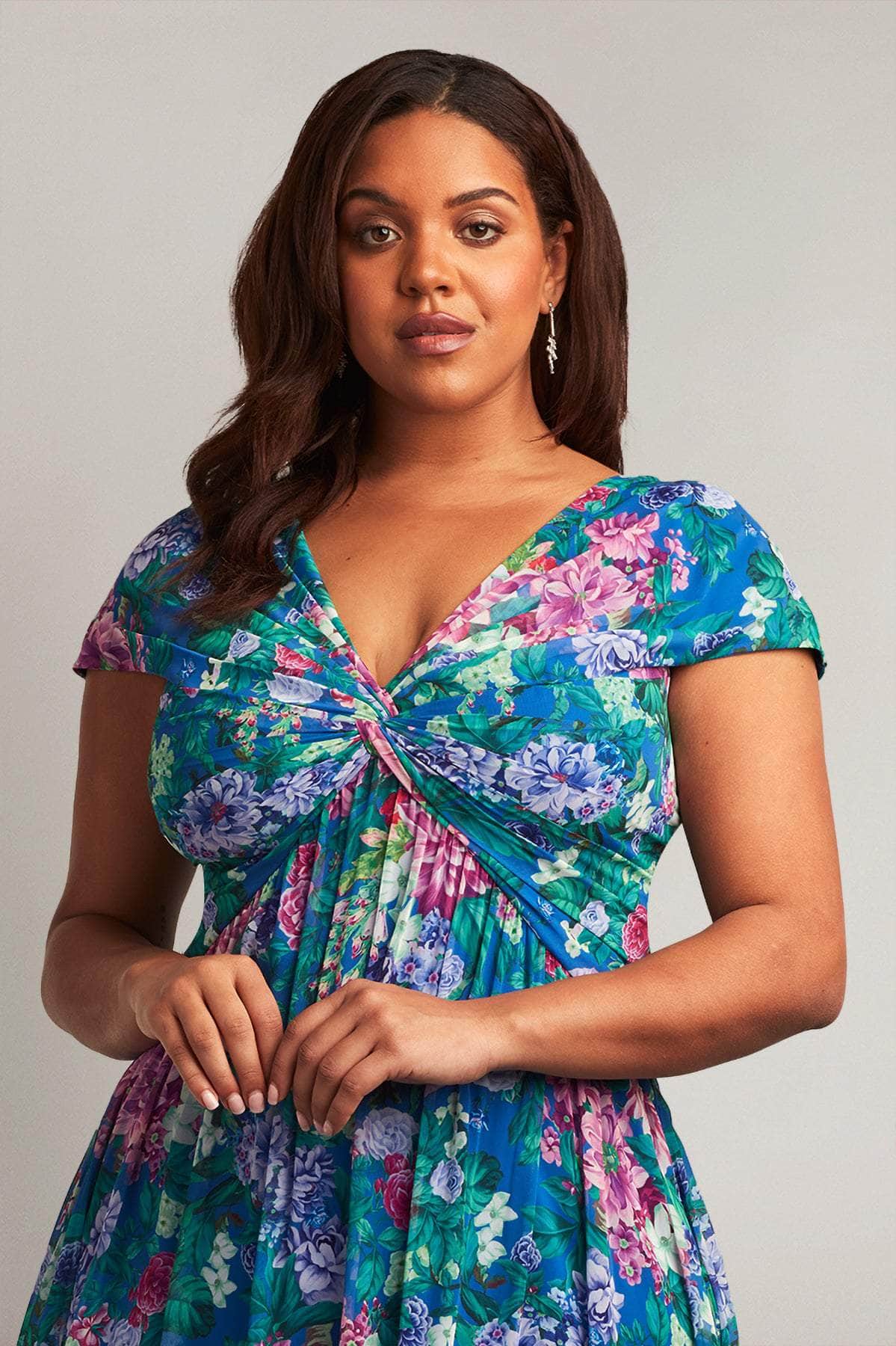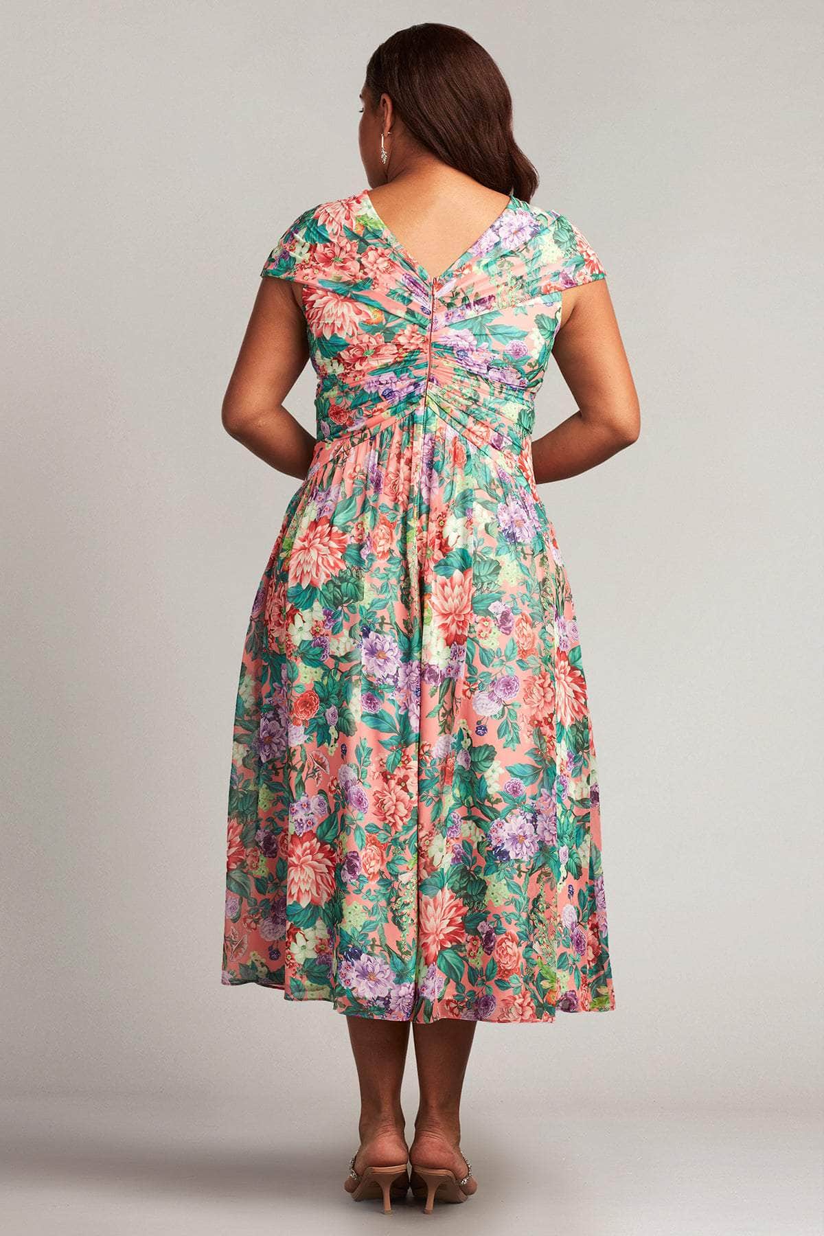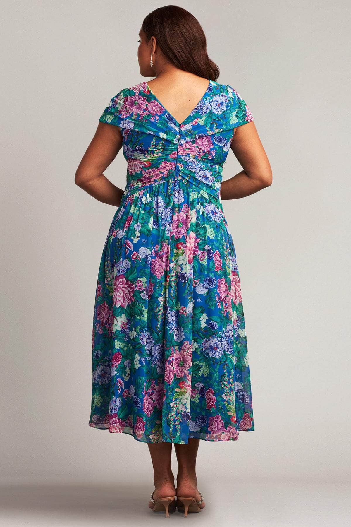 Be ready to mesmerize the crowd as you dress with this Tadashi Shoji CAY21073MDQ. Printed with floral designs with multicolor that perfectly matched the flowy silhouette of this winning piece. Neckline is cut in V and has a knot accent. Impeccably shirred with a peaked empire waist, the chiffon A-line skirt pleats softly as it waterfalls down amazingly to a tea-length hemline. Wear this fabulous Tadashi Shoji CAY21073MDQ masterpiece to make a remarkable entrance. Models are wearing Cadet Blue/Floral and Sunrise/floral colors.
