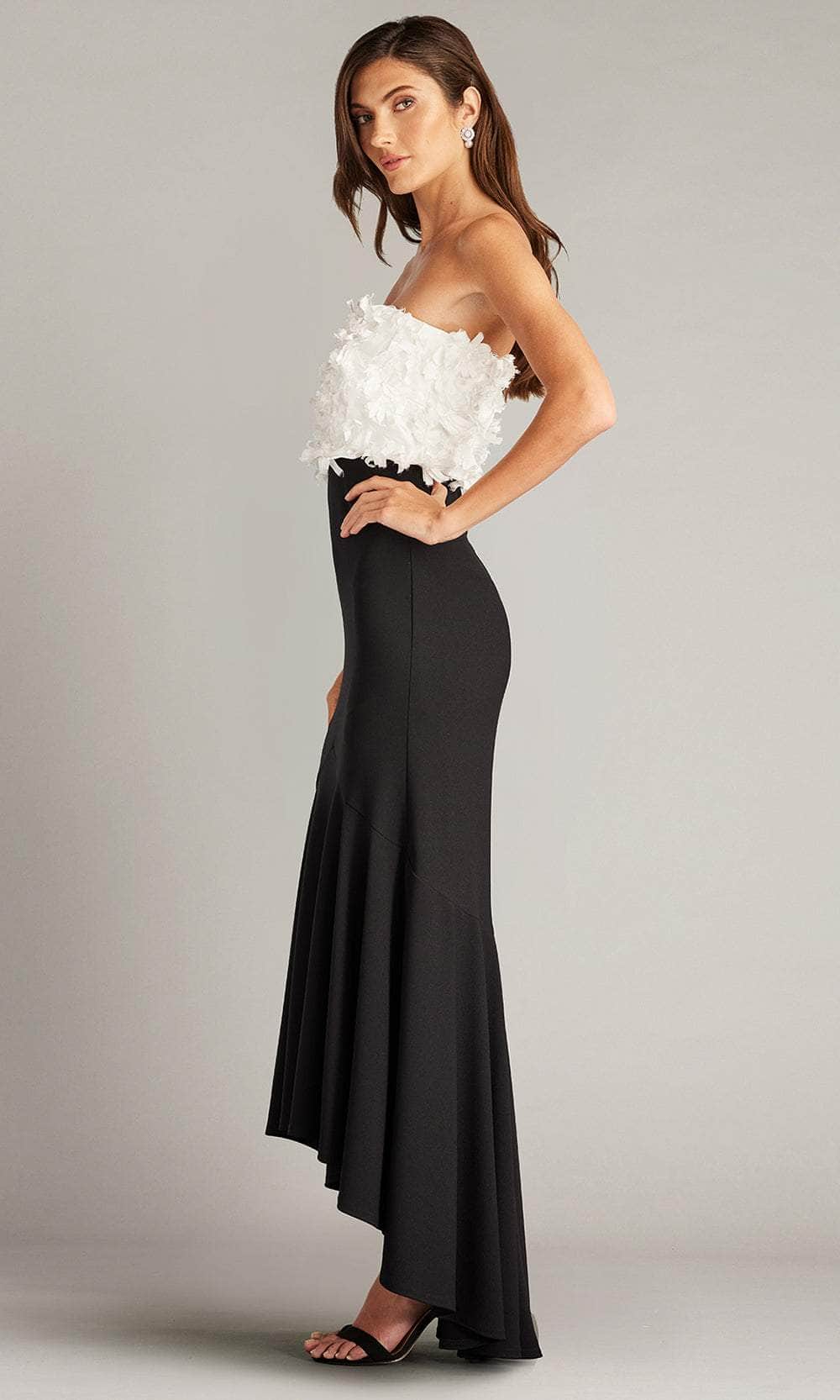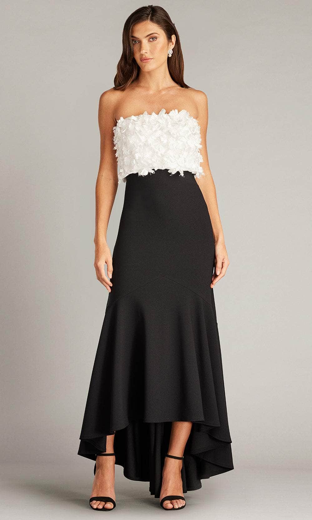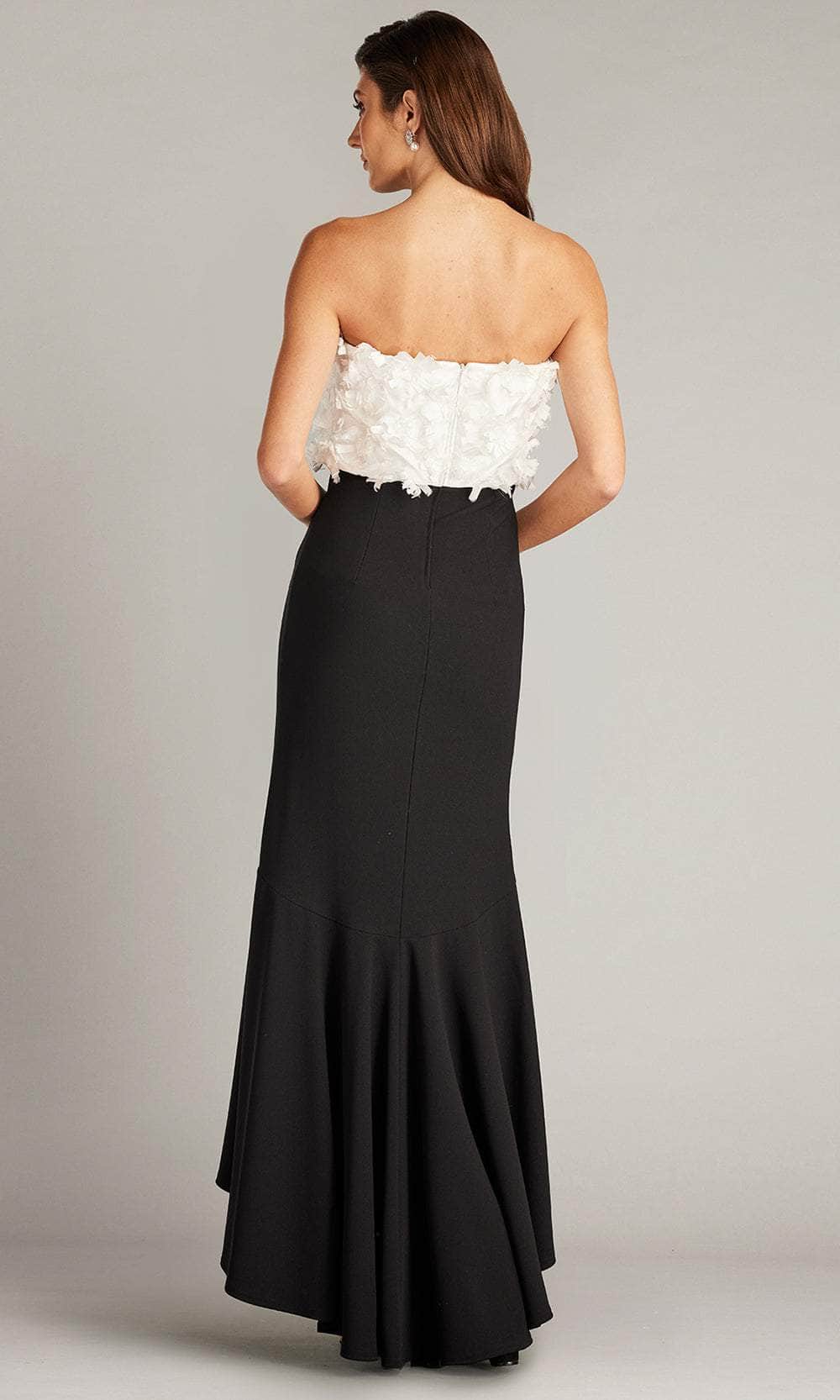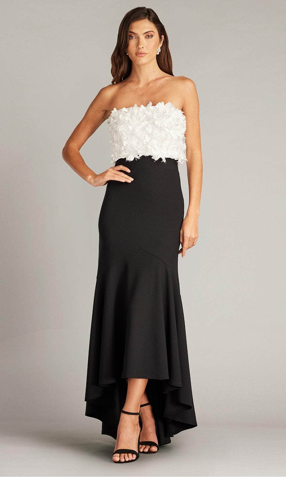 Charm everyone with timeless grace in the Tadashi Shoji CCE23423MDX masterpiece. This captivating dress flatters the figure with its beautifully tailored crepe silhouette. The strapless neckline elegantly showcases the shoulders and collarbones, while meticulously appliquéd baronet satin flowers. The fitted bodice accentuates the waist before cascading into a graceful high-low hem, ensuring an effortless blend of sophistication and movement. This Tadashi Shoji CCE23423MDX creation adds a touch of mesmerizing charm. Model is wearing the Ivory/Black color.