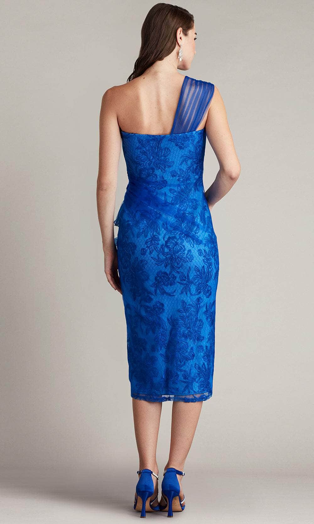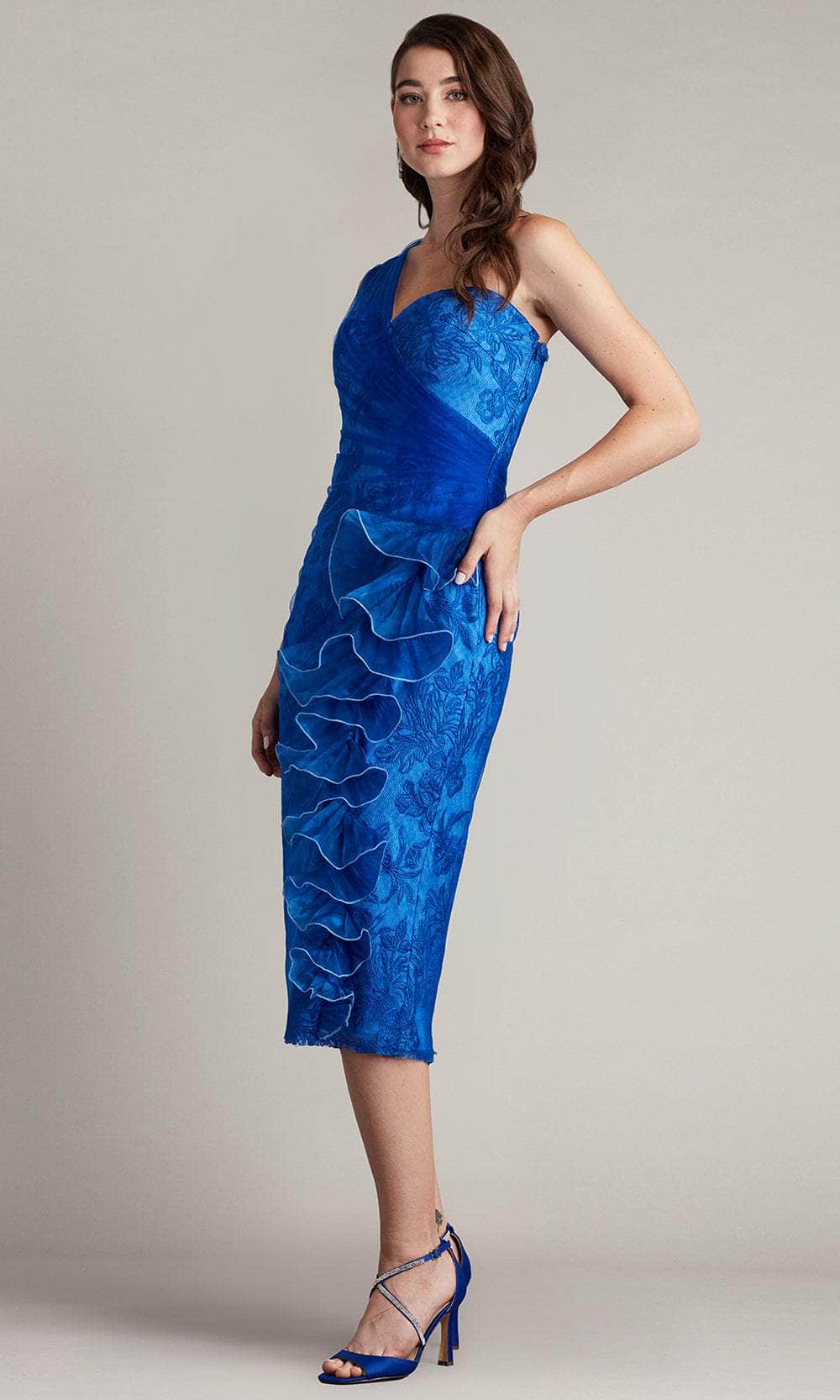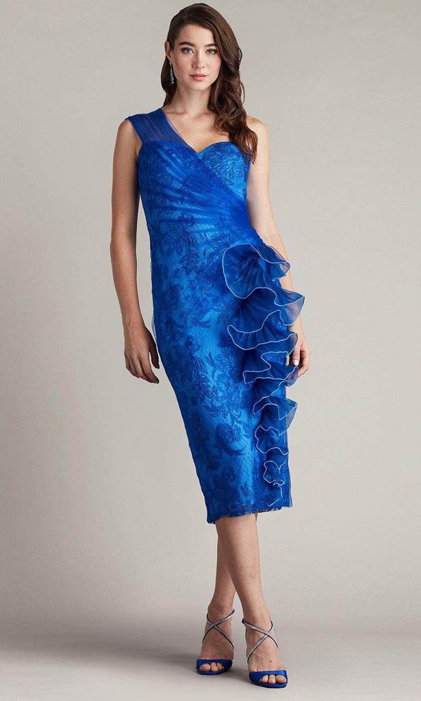 Embrace a touch of ethereal enchantment with the Tadashi Shoji CDV24342L masterpiece. This captivating cocktail dress blossoms with a captivating fusion of textures and dimension. The bodice, adorned with intricate tidal flower embroidery, features a sweetheart neckline that elegantly accentuates the shoulders and collarbones. A draped one-shoulder tulle overlay adds a touch of whimsical charm, creating an aura of effortless elegance. The waterfall pleated side ruffle cascades elegantly down the silhouette, adding a touch of drama and movement with every step. Let this unforgettable Tadashi Shoji CDV24342L masterpiece weave a spell of captivating beauty, leaving a lasting impression wherever you wander. Model is wearing the Pacific Blue color.