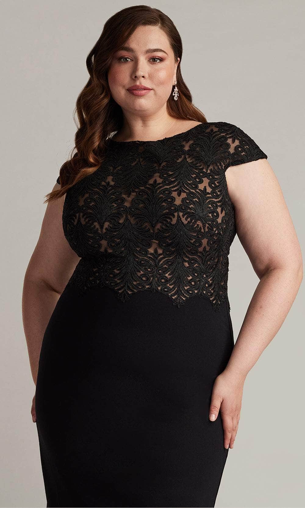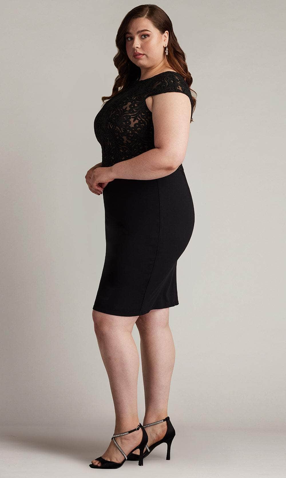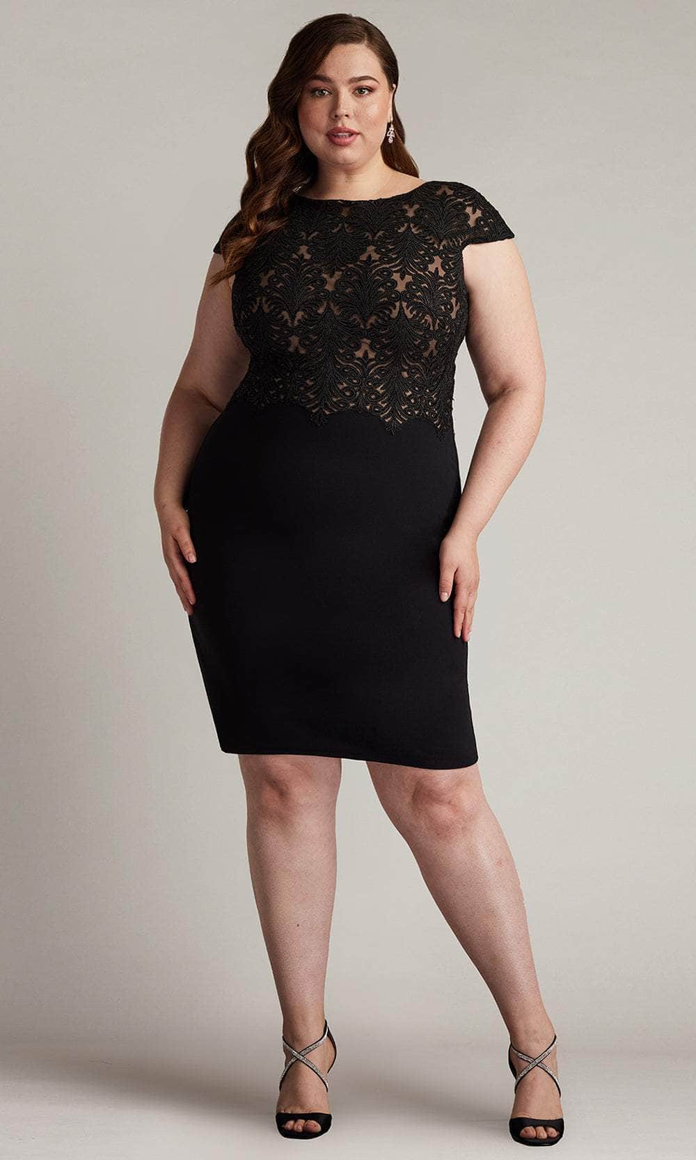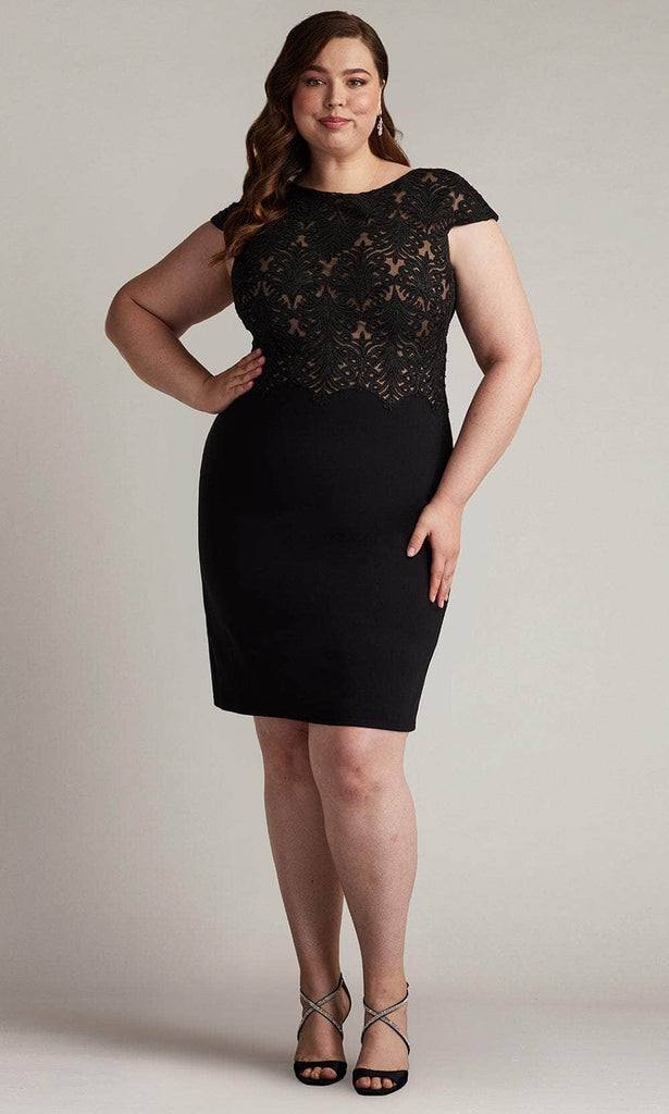 Charm everyone around you with the elegance of this Tadashi Shoji CDY24098MQ dress. The ensemble offers a classic bateau neckline and a fitted top bodice adorned with luxurious lace embroidery. Also, it has cap sleeves, zipper closure in the full back, and stylish scalloped detailing of the natural waist. The skirt trickles down to its mid-thigh length and makes a sheath silhouette that beautifully follows your curves. Make your next event one to remember in the Tadashi Shoji CDY24098MQ creation. Model is wearing Black/Nude color.