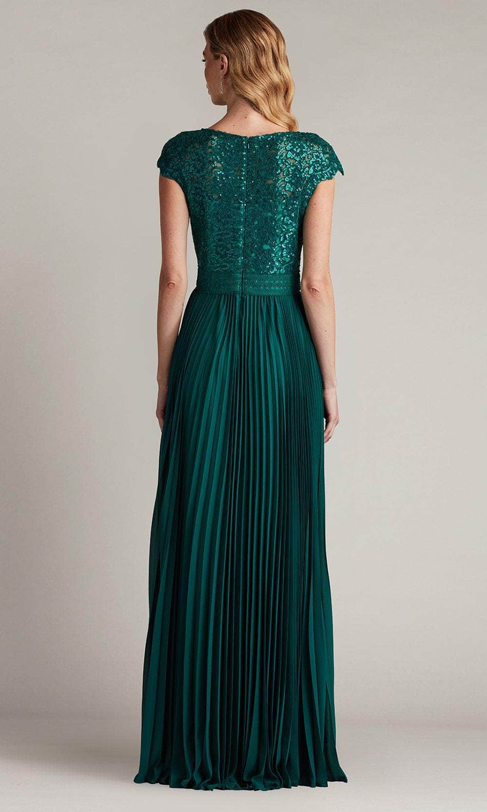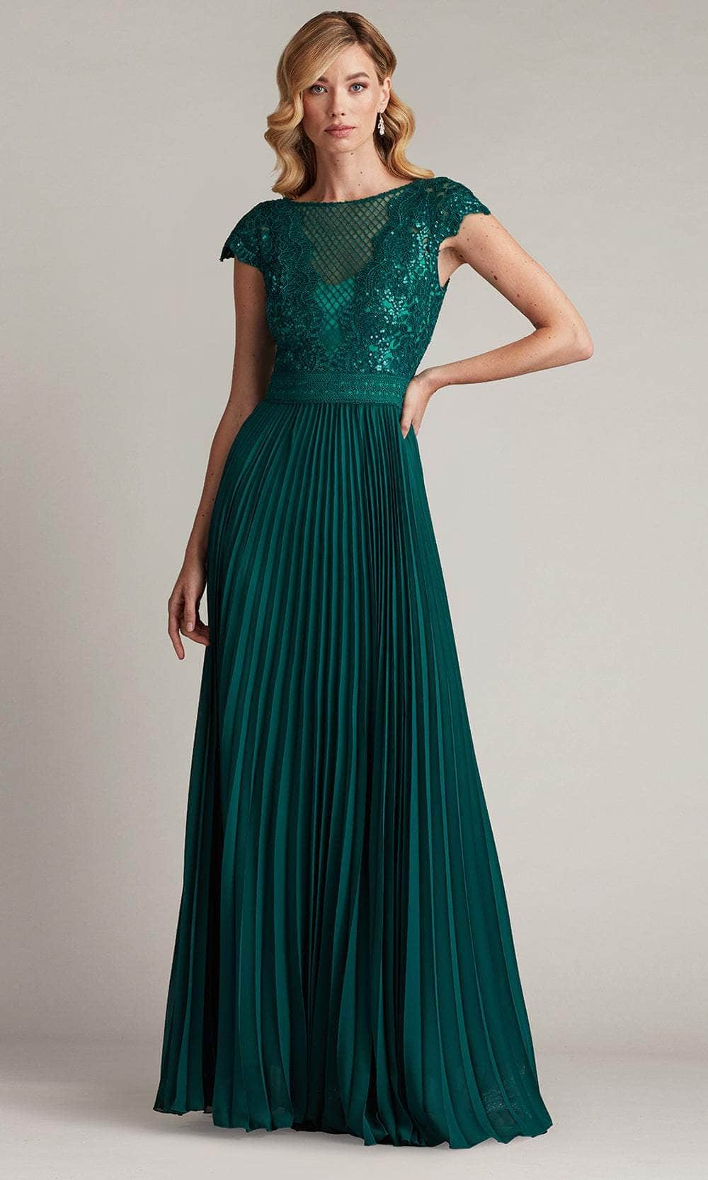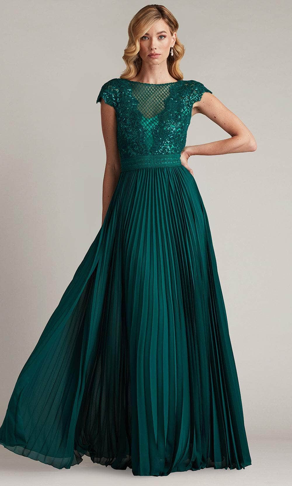 Shine like a celestial goddess in the Tadashi Shoji CFC24324L masterpiece. This stunning gown is adorned with exquisite paillette embroidery, designed to catch the light with every graceful movement. The illusion bateau neckline exudes timeless elegance, while the cap sleeves add a chic modern twist. A subtle trim at the waist highlights your figure, flowing into a full, pleated chiffon skirt. The voluminous silhouette sways beautifully as you move, ensuring all eyes are on you. Perfect for grand occasions, this Tadashi Shoji CFC24324L embodies sophistication and beauty, leaving an unforgettable impression. Models are wearing the Bamboo and Black/Nude colors.