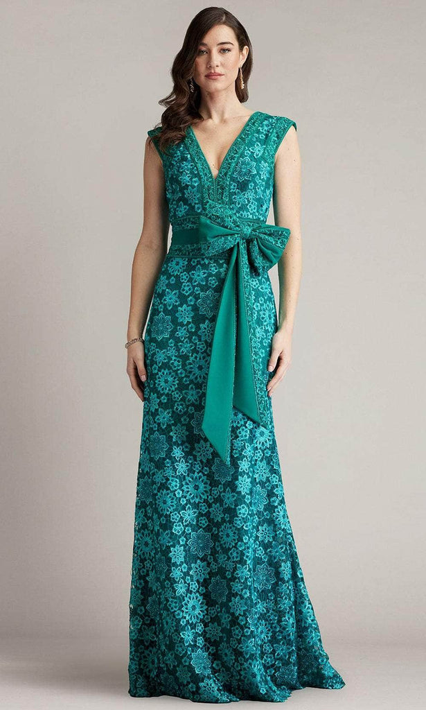 Feel confident and beautiful in the Tadashi Shoji CFX24579L creation. This captivating masterpiece is a celebration of elegance, featuring tailored lines that sculpt the feminine form. Intricate floral embroidery inspired by Indian palaces adorns the gown, while the V-neckline and cinched waist create a flattering silhouette. The statement bow adds a dramatic yet sophisticated touch. Perfect for formal occasions, this Tadashi Shoji CFX24579L gown is a true work of art. Model is wearing the Emerald color.