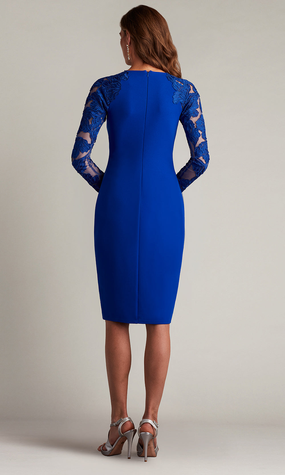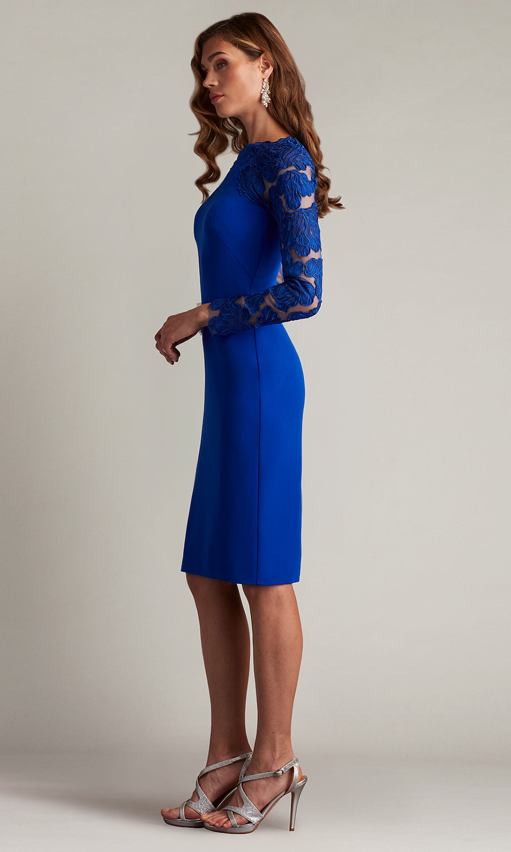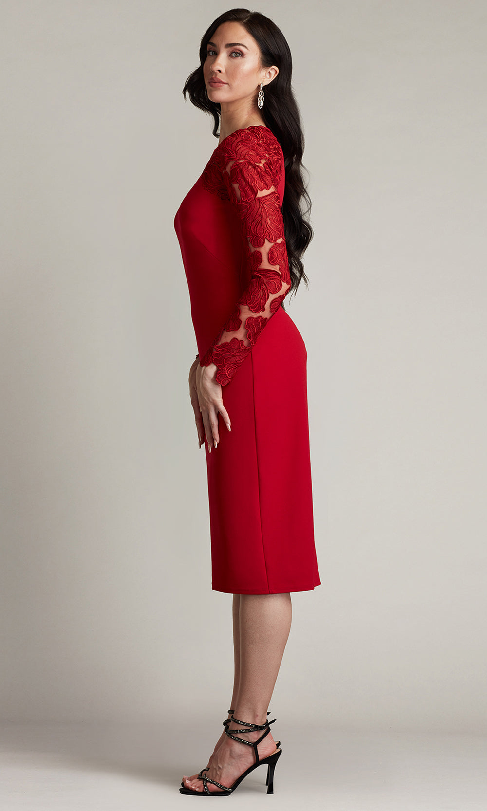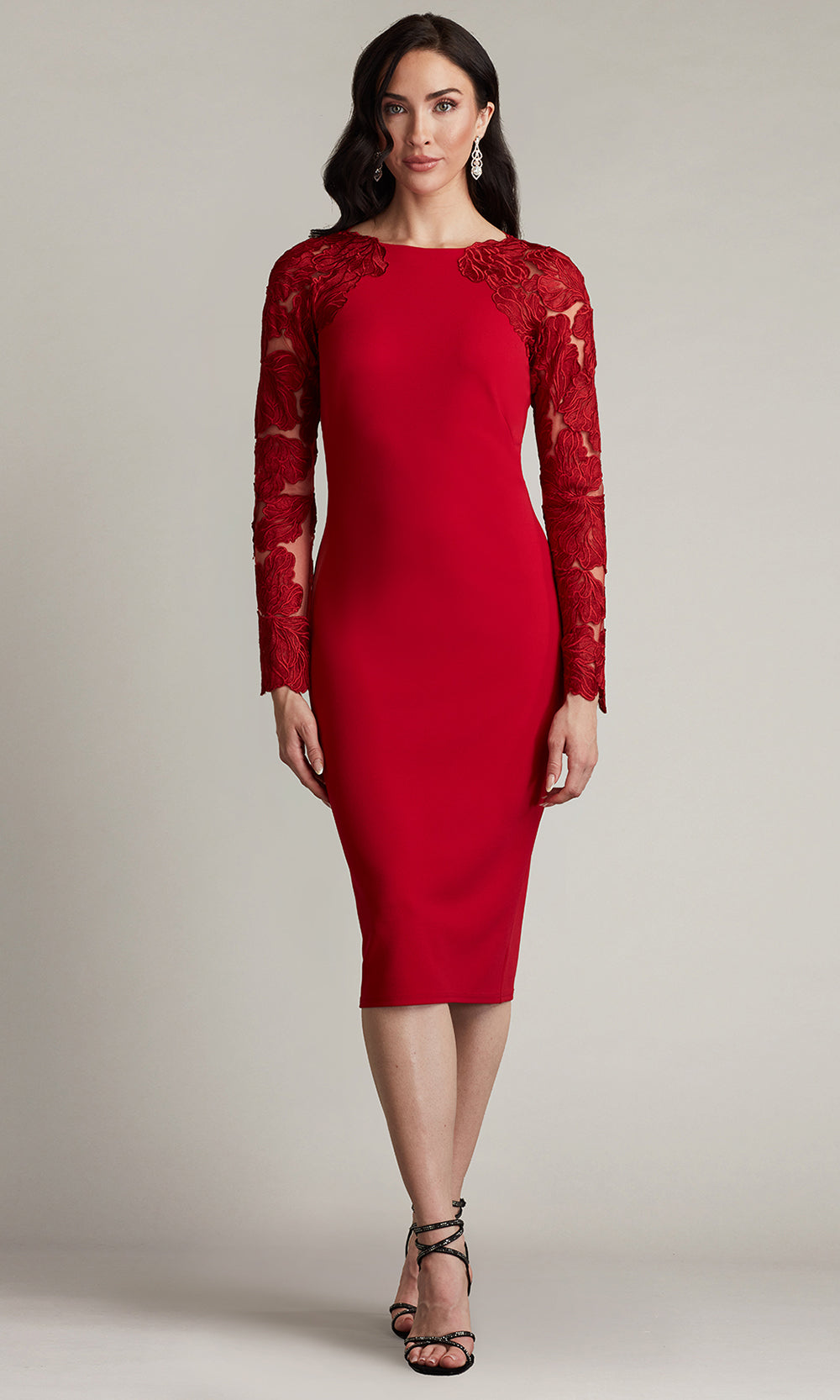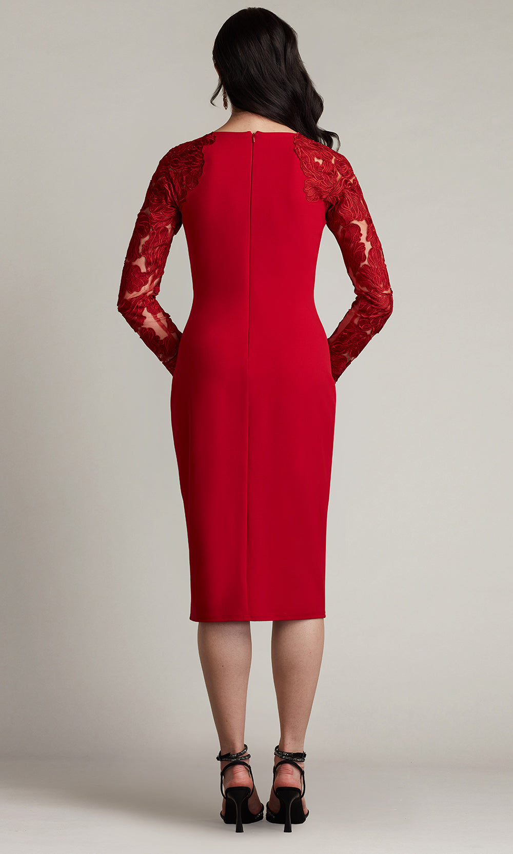 Command attention at your next event in a Tadashi Shoji CHG24909M cocktail dress that marries sophistication with subtle drama. Made from smooth crepe, this fitted sheath features a refined high neckline and long illusion sleeves adorned with floral embroidery. The streamlined silhouette gently defines the natural waist while maintaining an effortlessly polished appeal. Perfect for upscale gatherings or intimate celebrations, this style embodies a balance of elegance and modernity. The Tadashi Shoji CHG24909M ensures you leave a lasting impression with grace and poise. Models are wearing Blue Bell, and Cranberry colors.