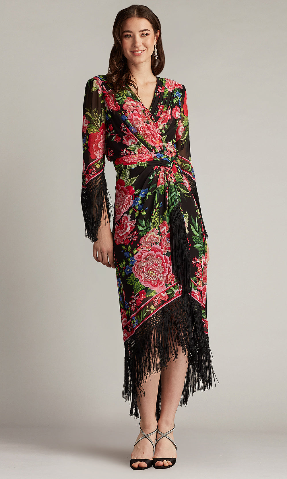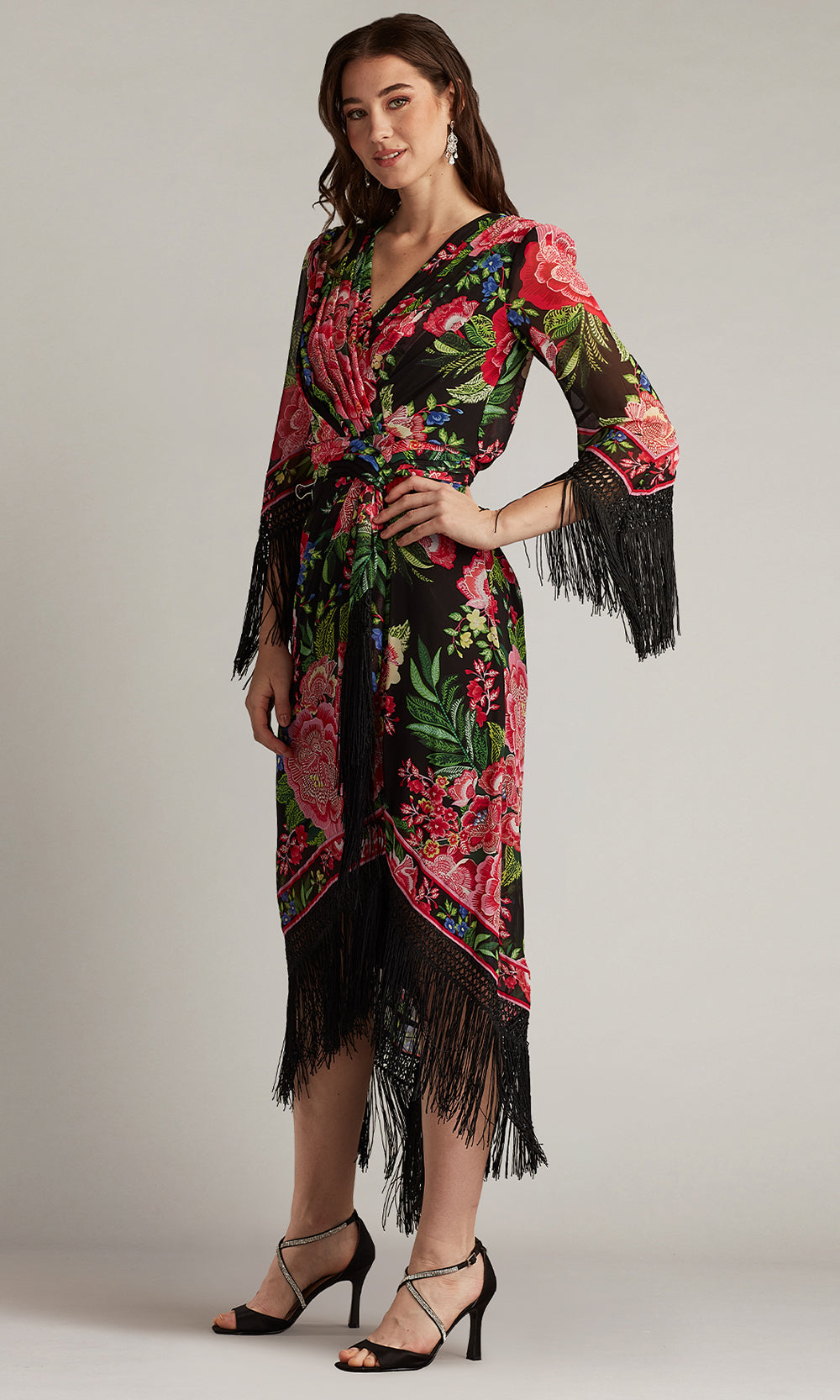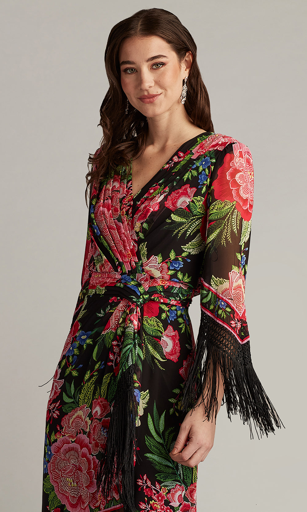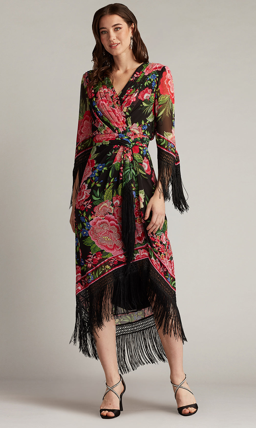 | Details: | Three-Quarter Sleeves, Floral Print, Wrap Design, Tassel Fringe, Concealed Back Zipper |