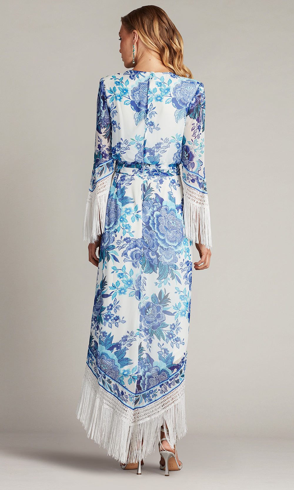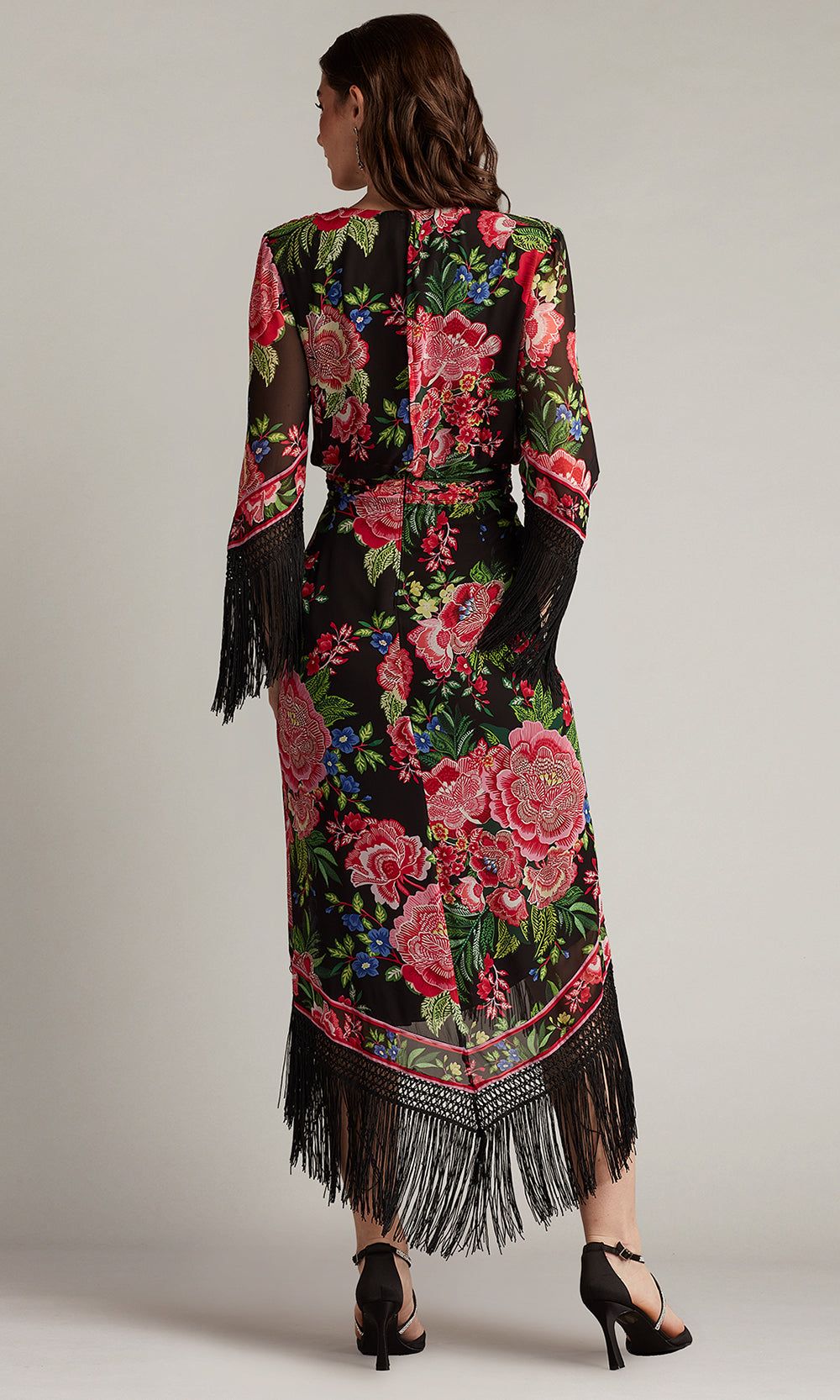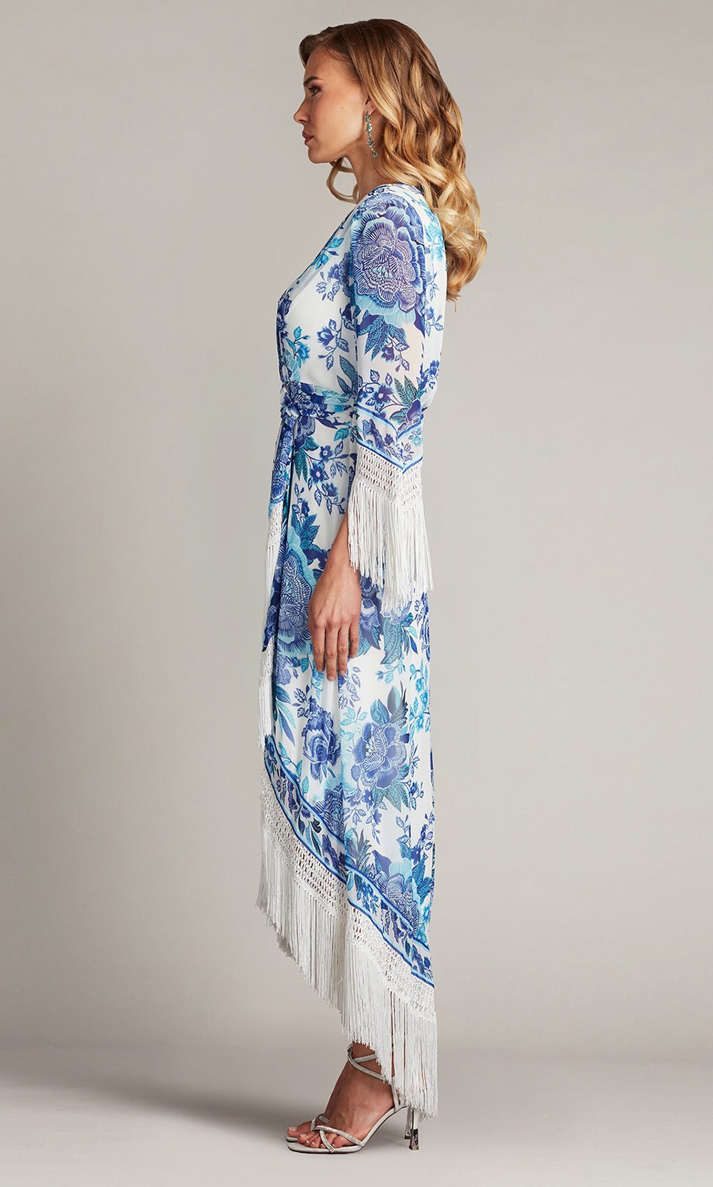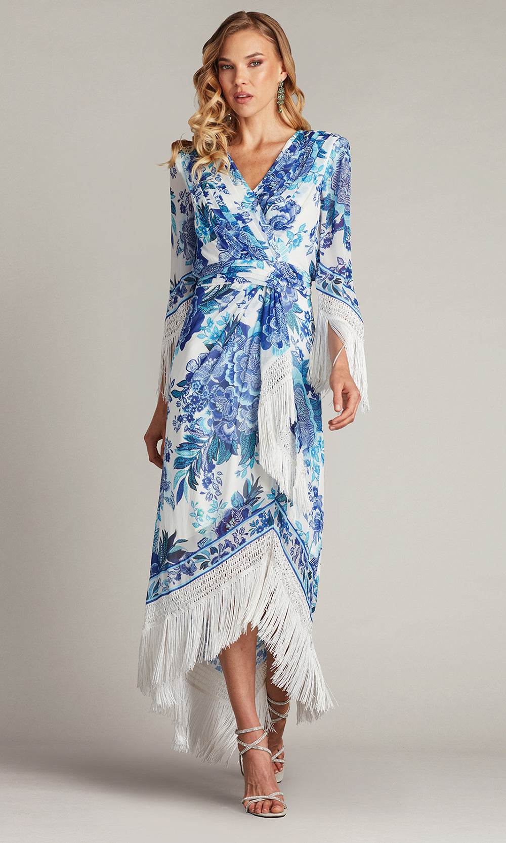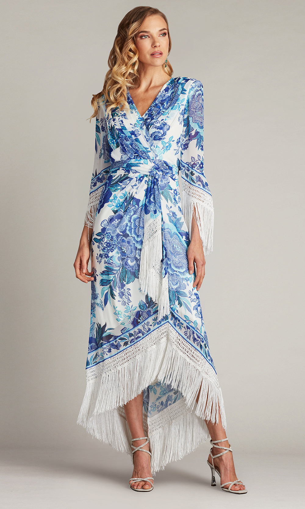 | Details: | Three-Quarter Sleeves, Floral Print, Wrap Design, Tassel Fringe, Concealed Back Zipper |