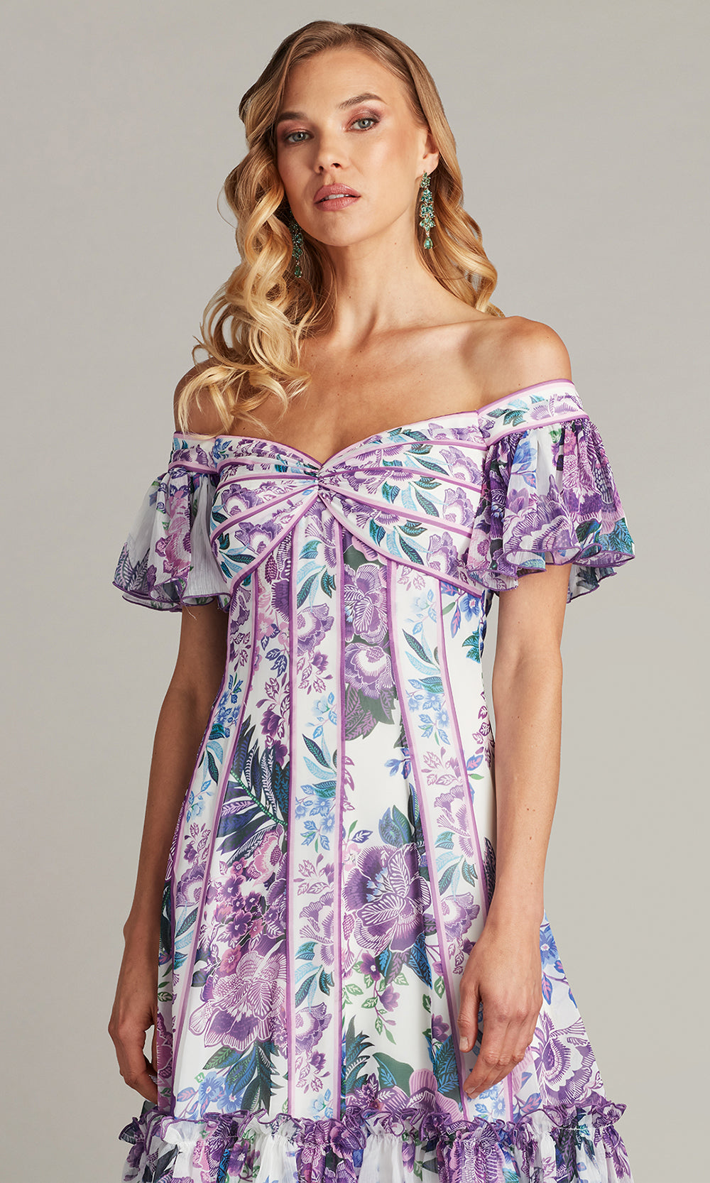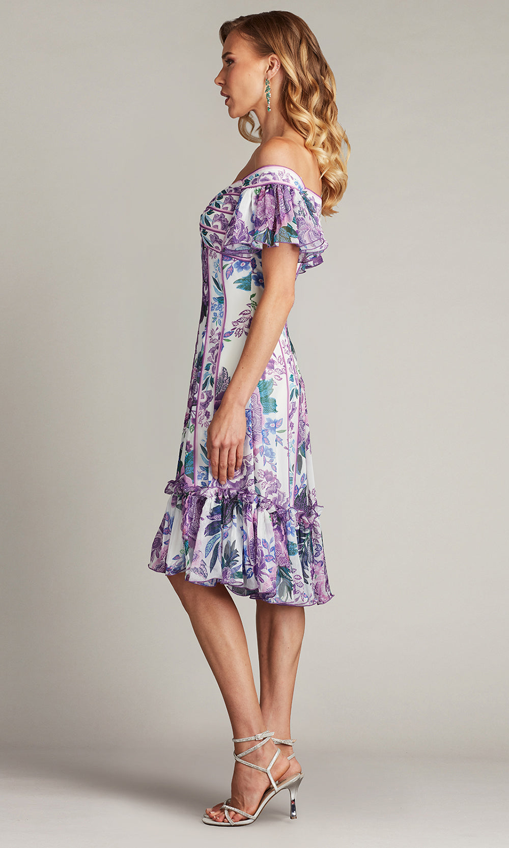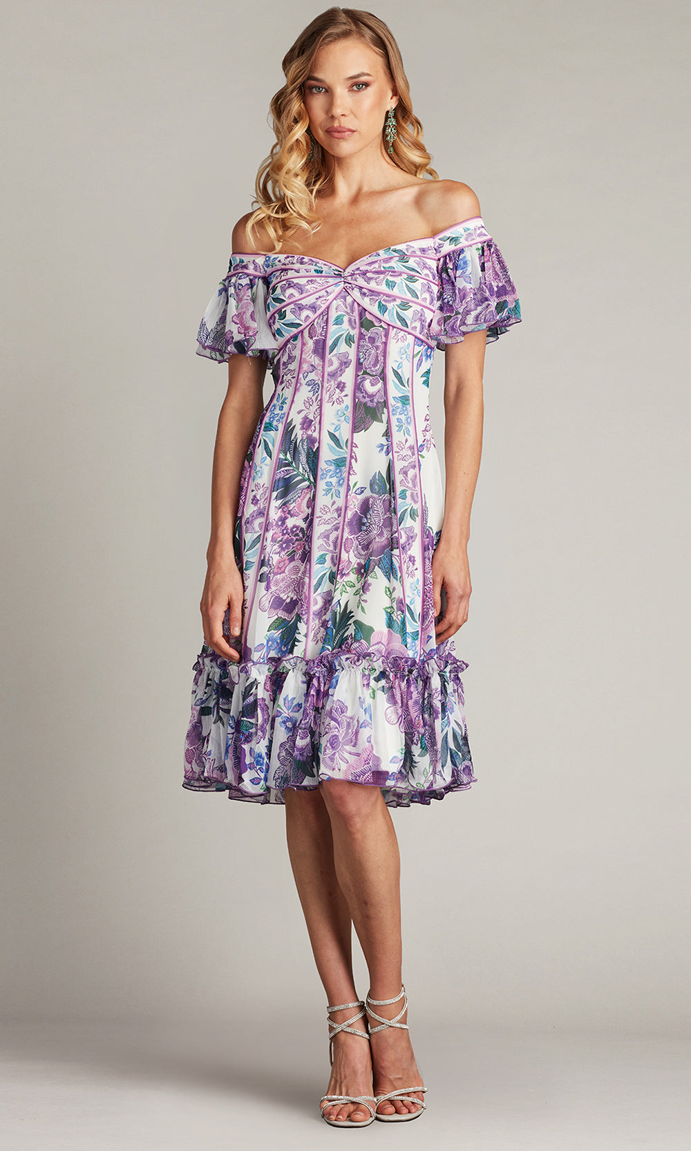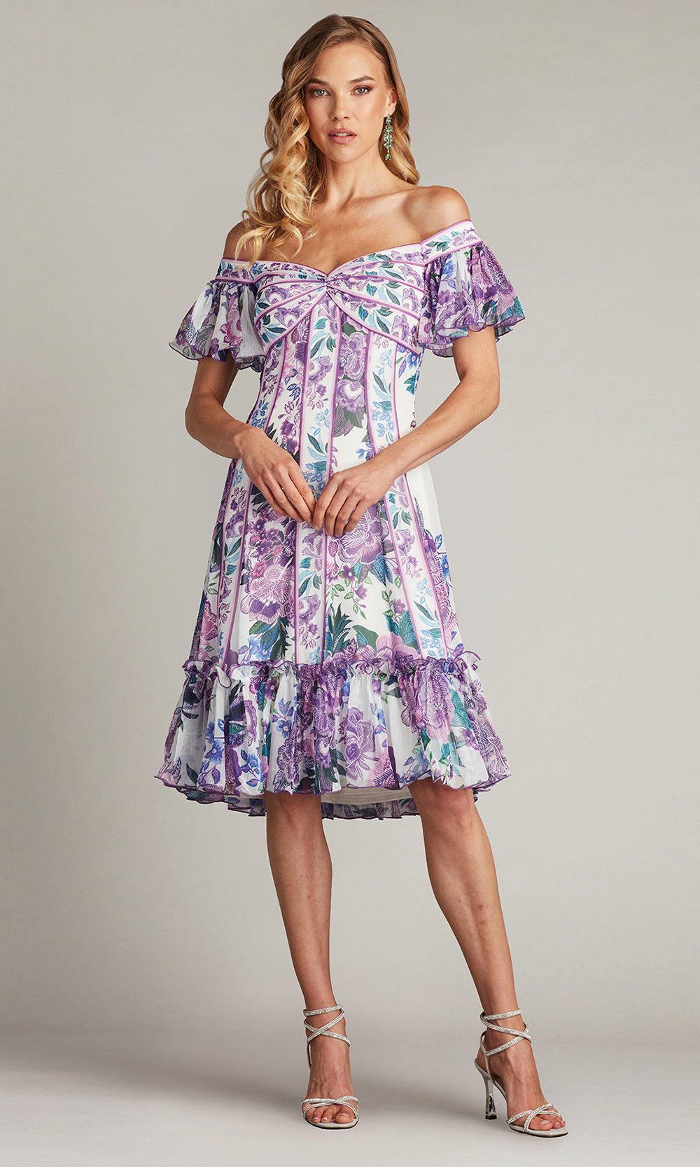 A playful elegance radiates from the Tadashi Shoji CHZ25465M A-line dress, perfect for those who value both style and comfort. The sweetheart neckline is complemented by off shoulder flutter sleeves, offering a light and airy feel that pairs beautifully with the knee length cut. Its floral print brings a vibrant charm, while the ruffled hemline adds a feminine and graceful touch. The Tadashi Shoji CHZ25465M ensures you stand out with poise and freshness in every setting. Model is wearing White/Purple Fl color.