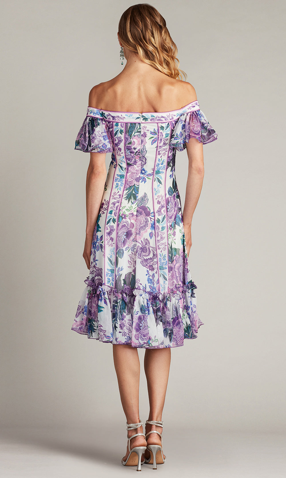 | Details: | Off-Shoulder Flutter Sleeves, Ruffled Hemline, Floral Print, Mid-Open Back |
