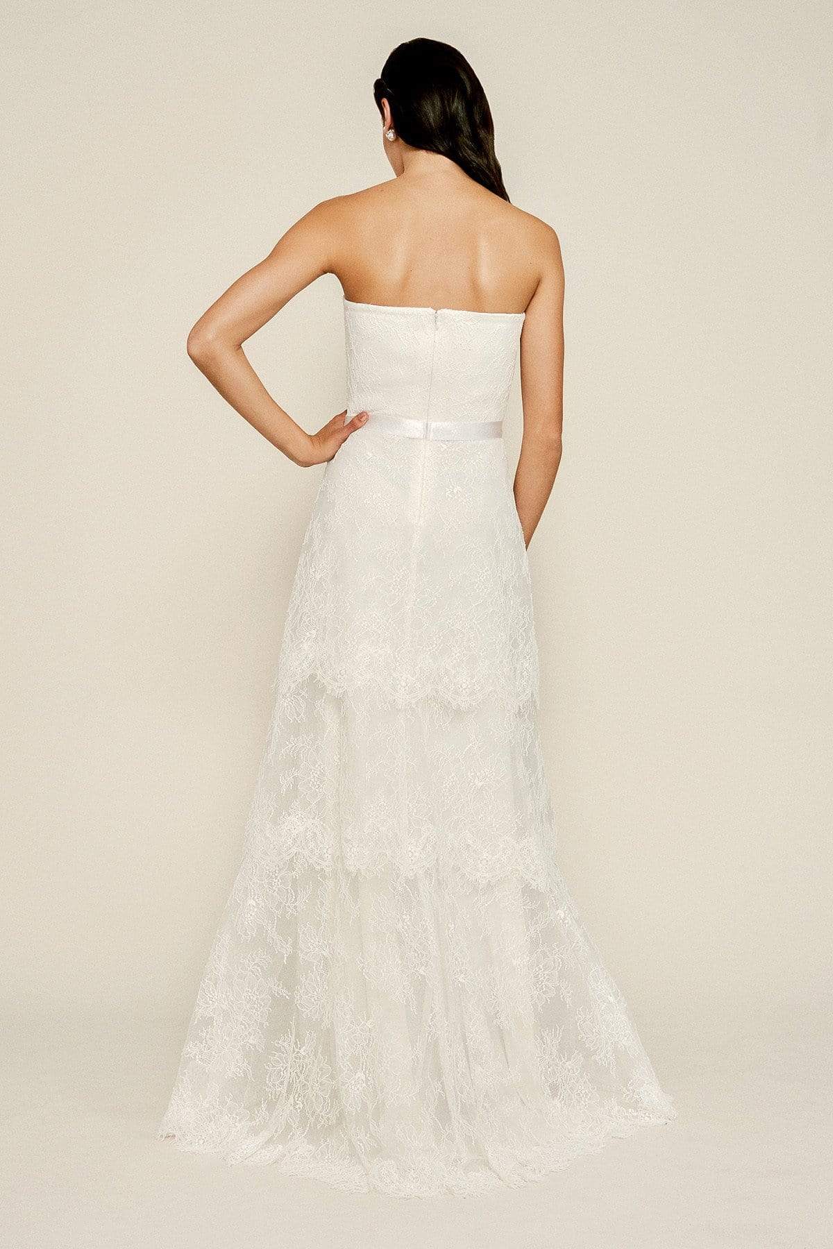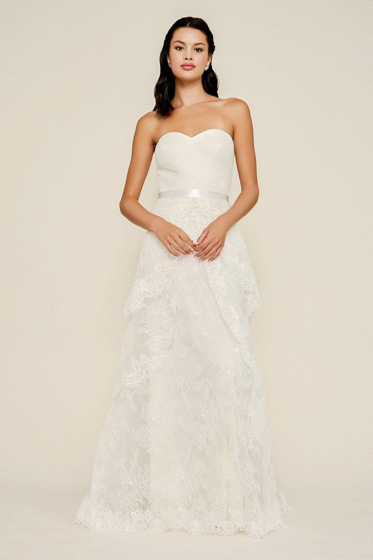 | Details: | Chantilly Lace, Bustier Bodice, Mid-Open Back, Back Zipper Closure, Petal-Shaped Tiers, Strapless, Satin Waistband, Sweep Train |
