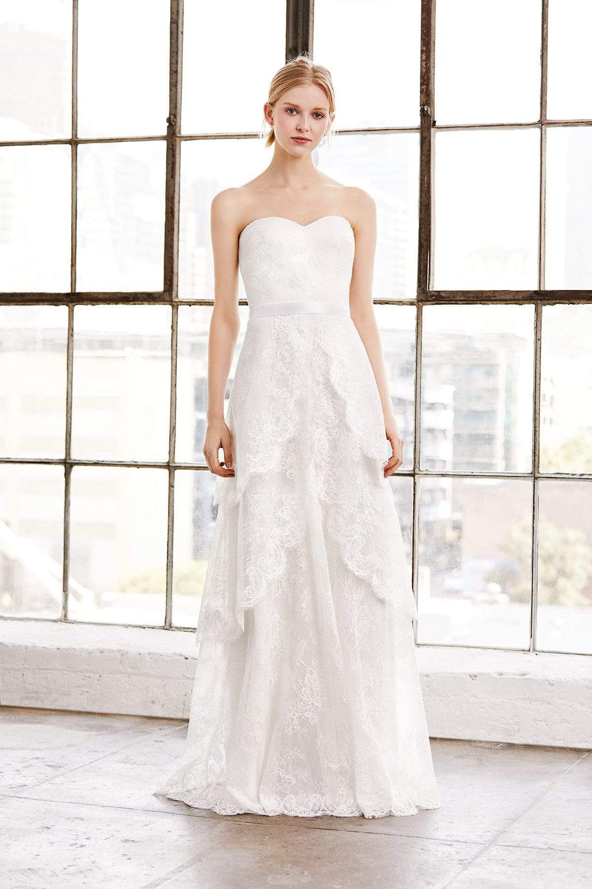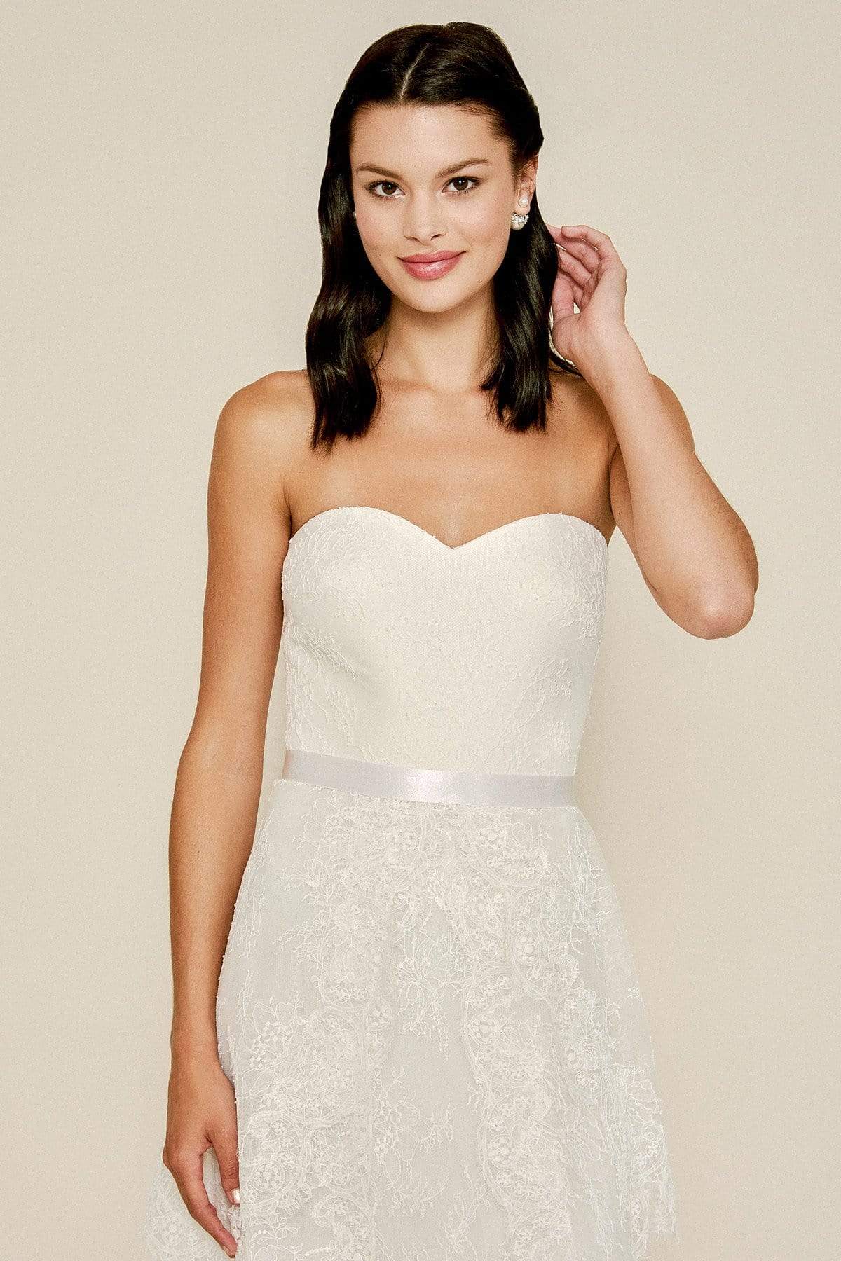 Grace the altar with a mesmerizing flair in this Tadashi Shoji BHA19094LBR creation. Beautifully crafted in Chantilly lace, this gown flatters with a bustier bodice and a strapless sweetheart neckline. Crowned with a satin band along the waist, petal-shaped tiers of lace drapes the flared skirt as it falls into a floor-grazing silhouette and train. Enchant everyone as you make a statement on that special day in this Tadashi Shoji masterpiece.