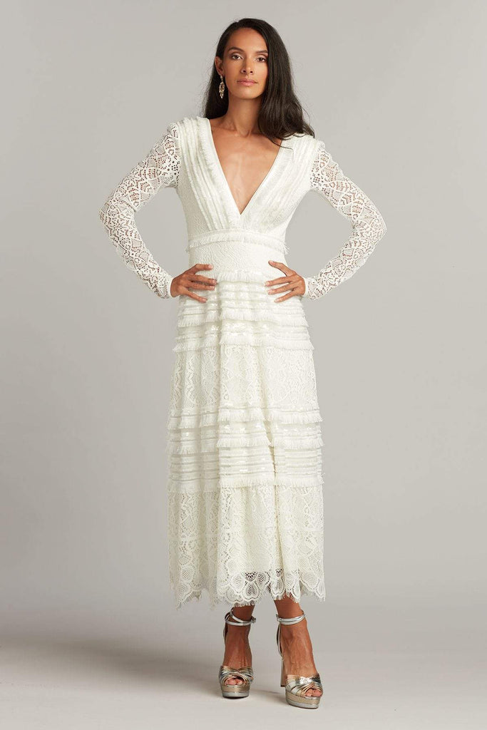 Tadashi Shoji BQU21062MD is a sensual masterpiece that will make you fall in love. The bodice of this lovely ivory embroidered tea length dress has long lace sleeves and a V-plunging neckline. The back features a low V-cut that is secured with a concealed back zip closure. The tea-length skirt cascades into a lovely A-line shape at the bottom. You will be the most fabulous girl at your big occasion if you wear a Tadashi Shoji design.